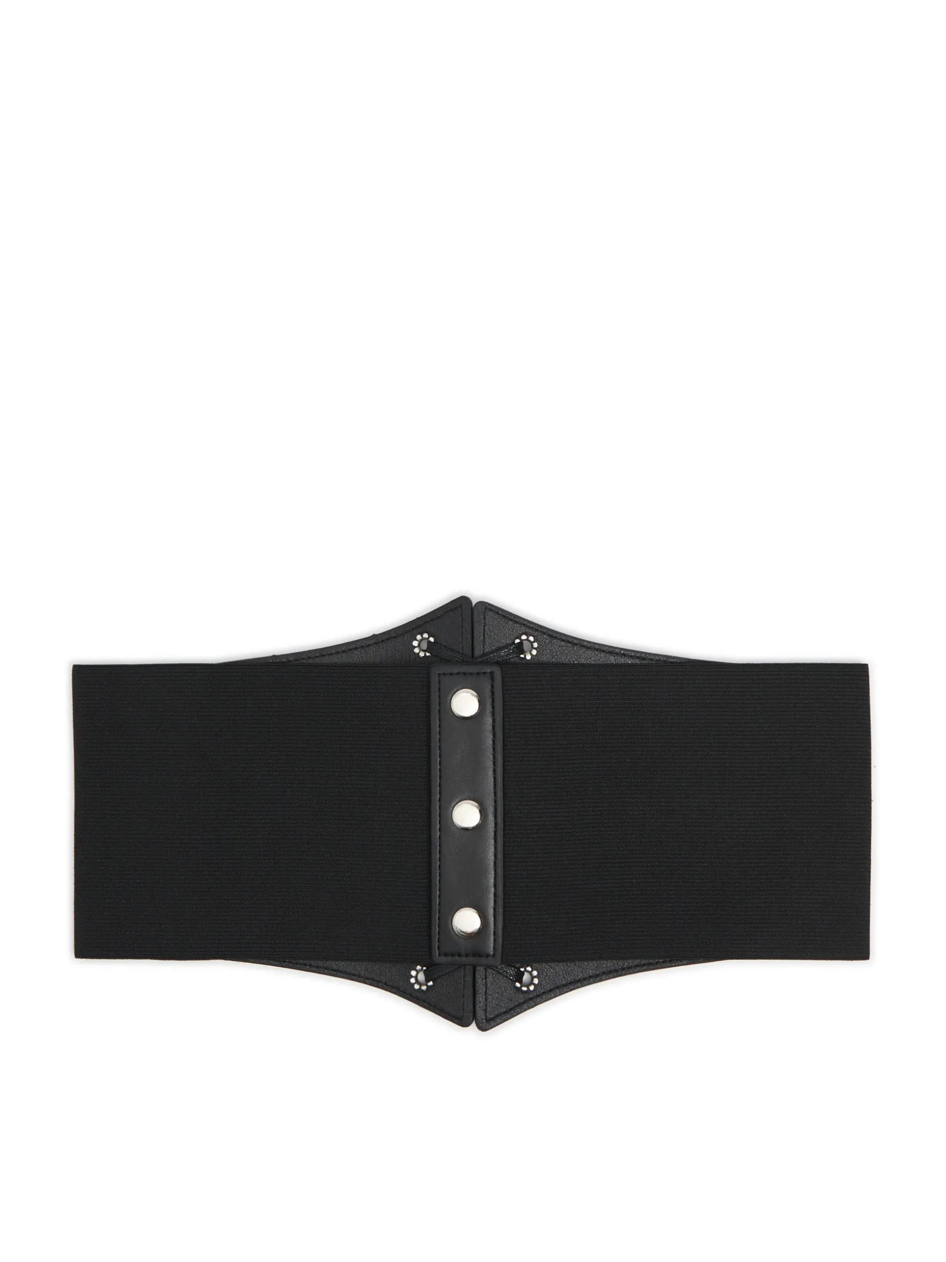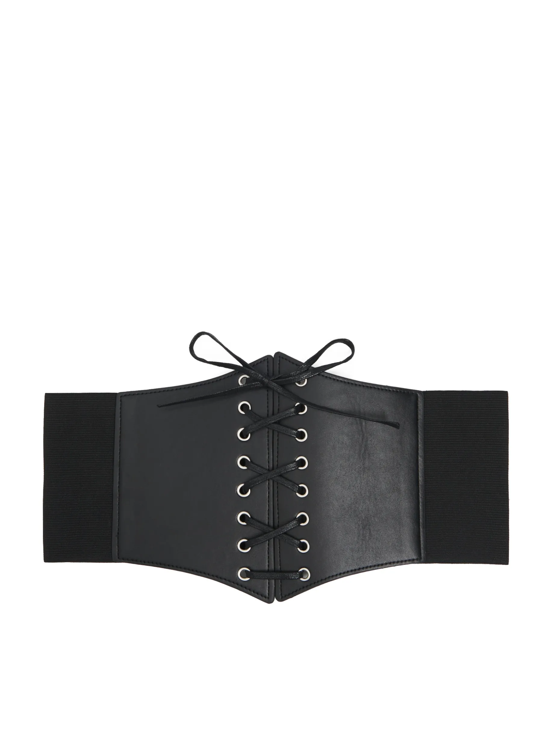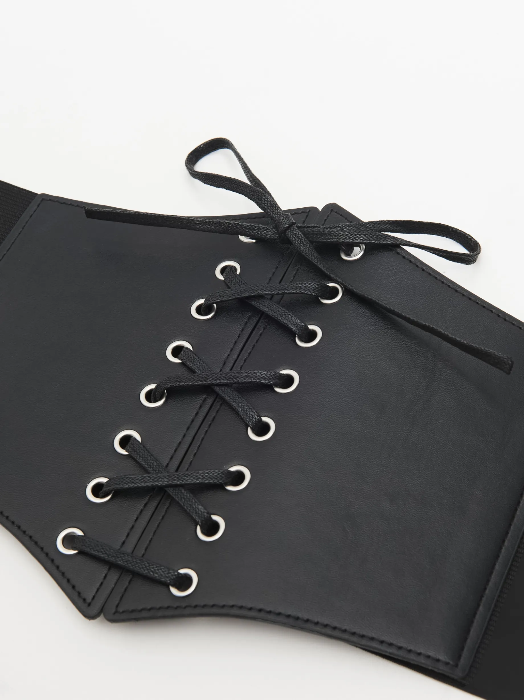 Szeroki damski pas gorsetowy, wykonany z imitacji skóry. Z przodu dekoracyjne wiązanie, z tyłu zapięcie na zatrzaski.