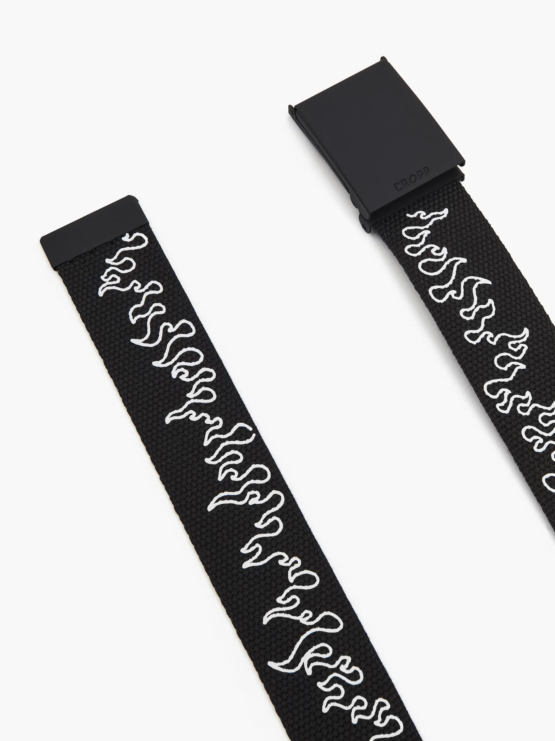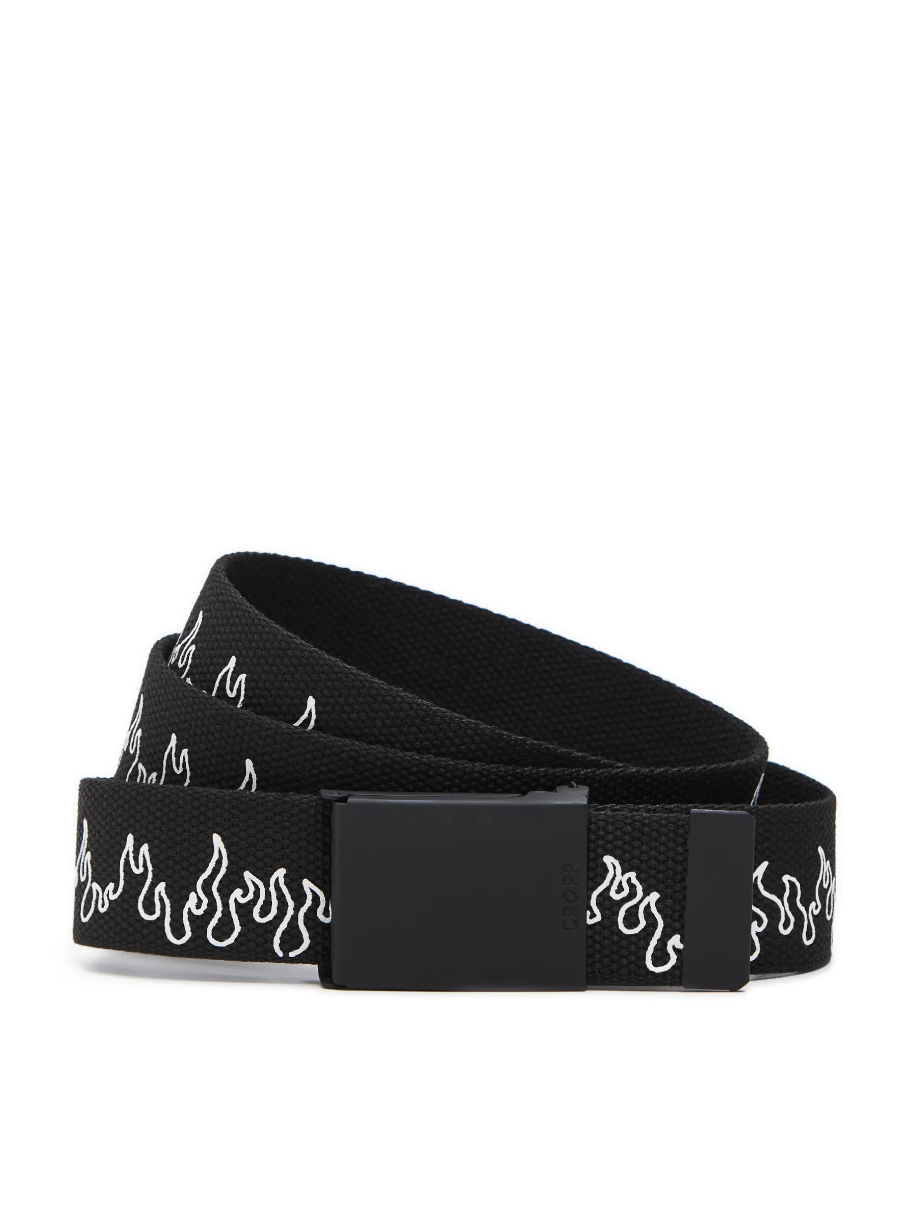 Męski pasek do spodni, wykonany z czarnej tkaniny. Ozdobiony motywem płomieni. Wymiary produktu 125 x 4 cm