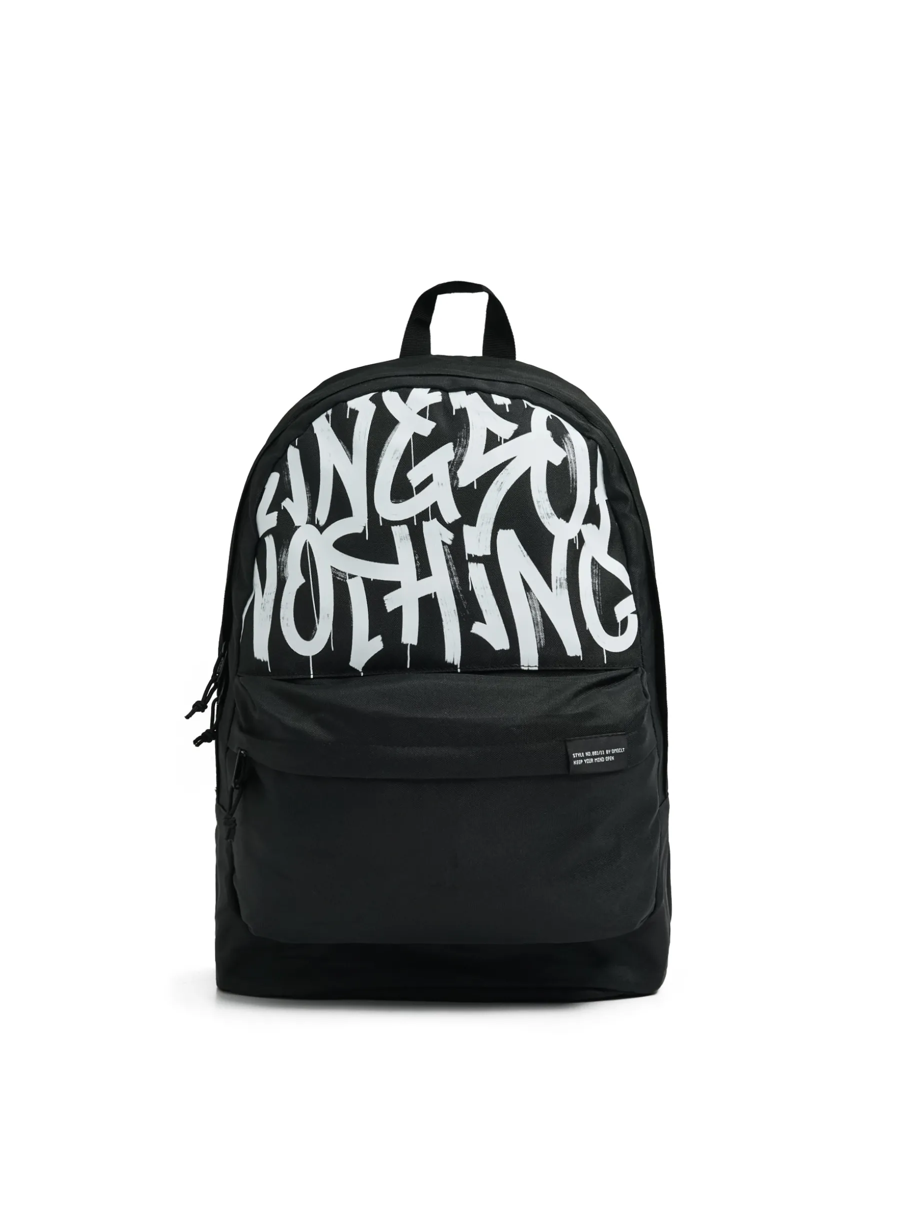 Pojemny męski plecak, wykonany z wytrzymałej czarnej tkaniny. Idealne uzupełnienie streetowych fitów! wygodne, regulowane szelki tylna ścianka plecaka wzmocniona specjalną pianką główna komora oraz dodatkowa kieszeń z przodu zapinane na suwaki wewnętrzna kieszeń na laptopa białe nadruki tekstowe w stylu graffiti niewielka ozdobna metka pojemność: 25 l. Wymiary produktu: 48 x 35 x 15 cm