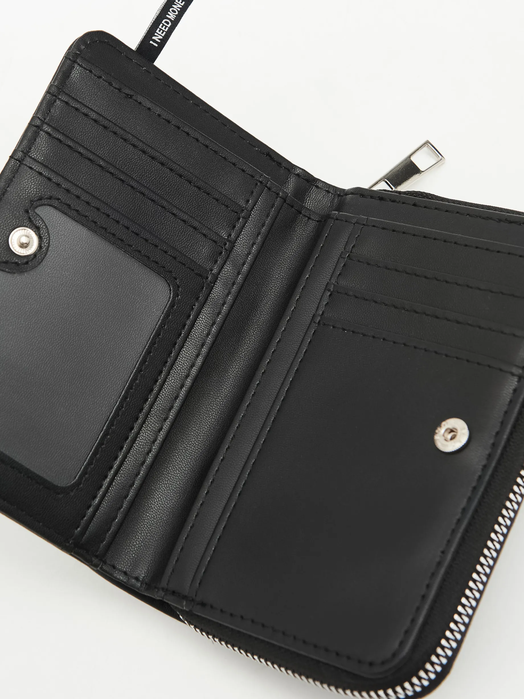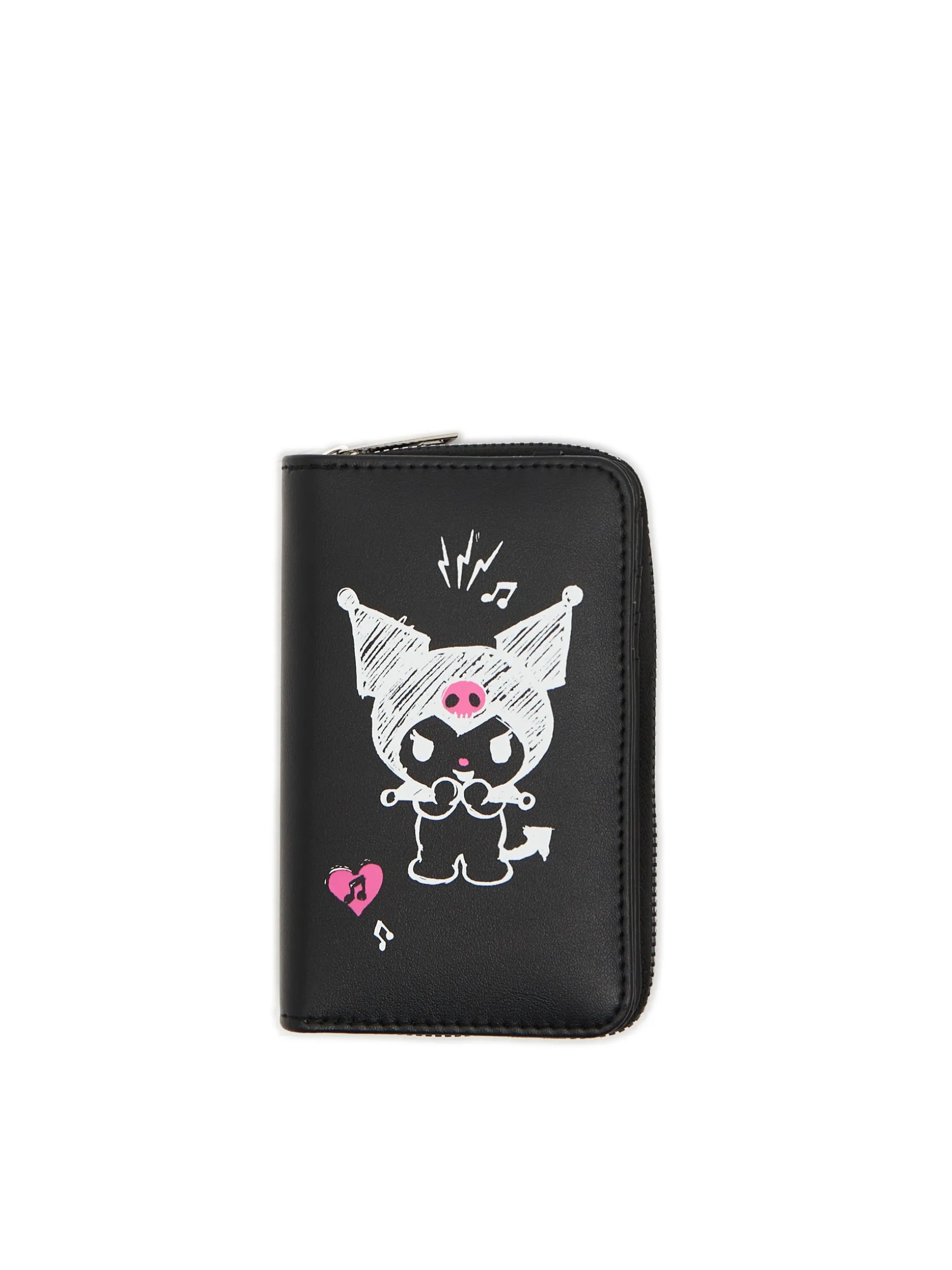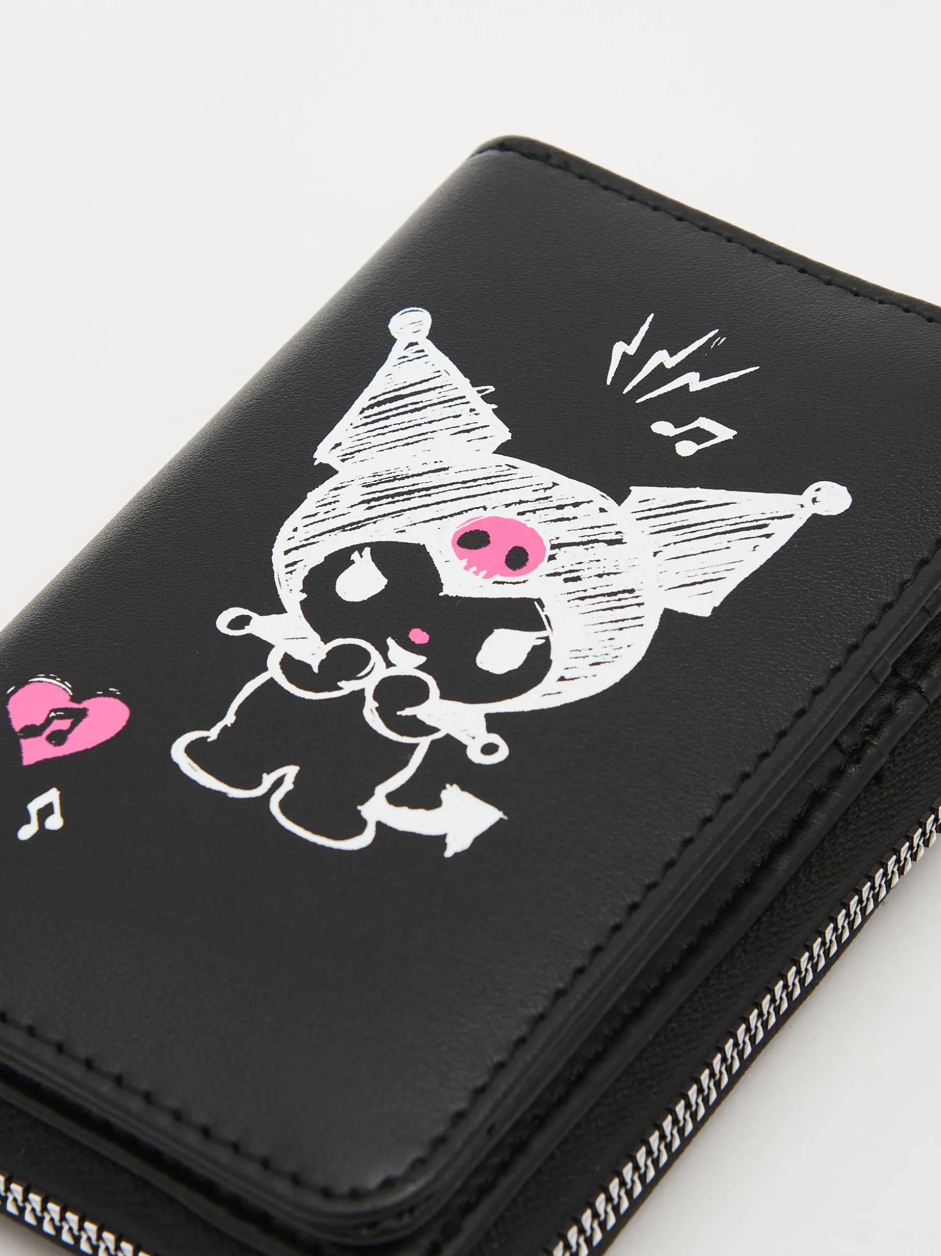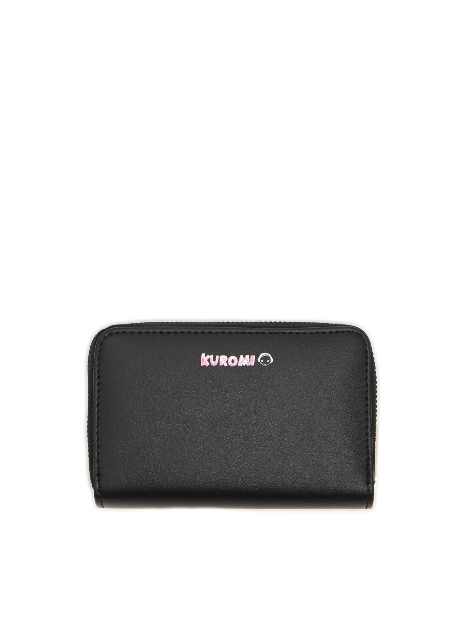 Czarny damski porfel, wykonany z imitacji skóry. zapięcie na zatrzask kieszonka na monety zapinana na suwak przegródki na karty i banknoty nadruk z motywem Kuromi Wymiary produktu: 9,5 x 14 cm © 2024 SANRIO CO., LTD.