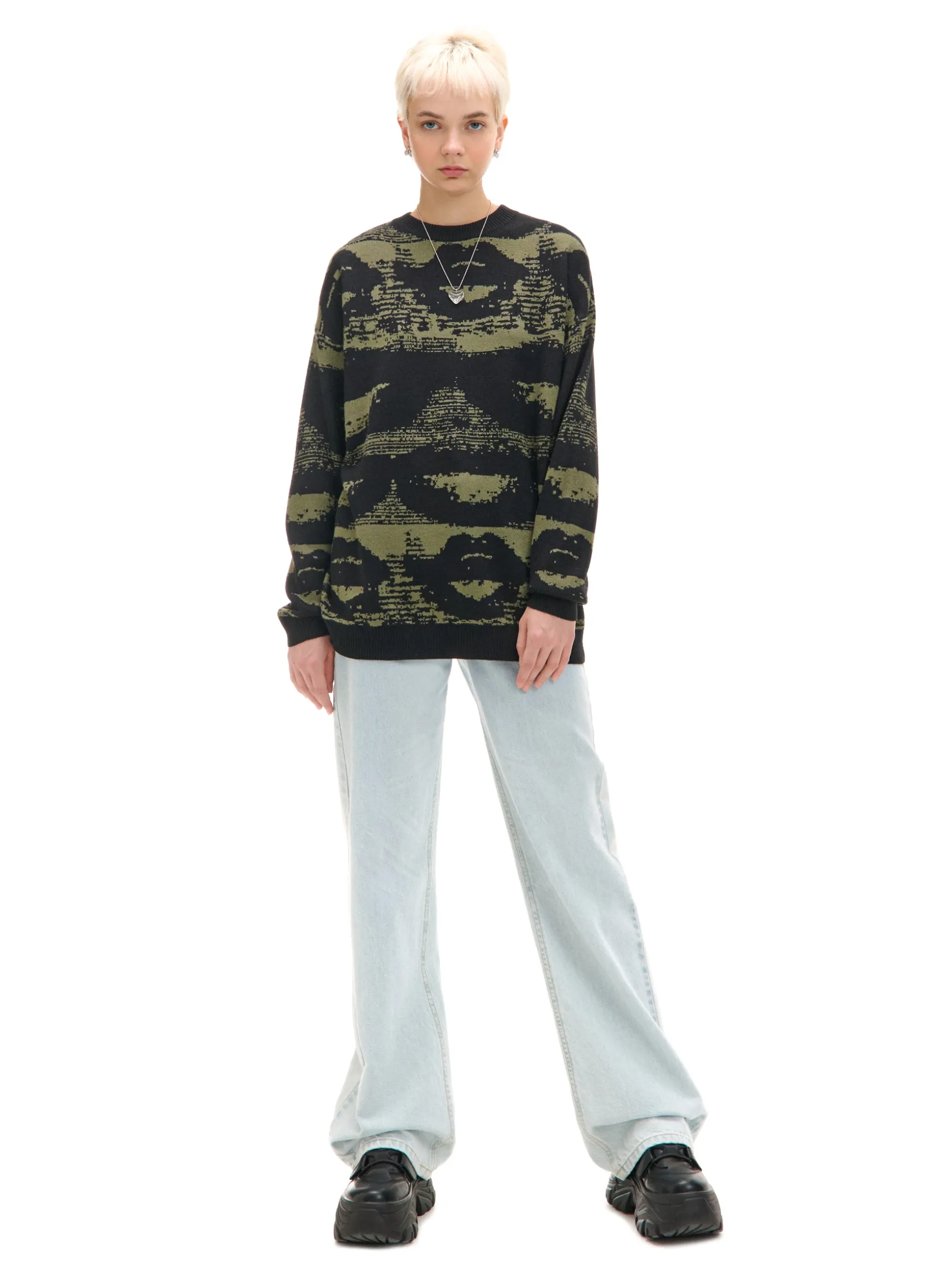 Sweter o kroju oversize uszyty z dzianiny w czarnym kolorze. Na całej powierzchni artystyczny nadruk z motywem ust. Ten item jest przyjemny w dotyku, więc otuli Cię w chłodne wieczory! uszyty z dzianiny o drobnym splocie krój oversize okrągły dekolt z lamówką dół i rękawy wykończone prążkowanym ściągaczem delikatny efekt sprania oryginalny print