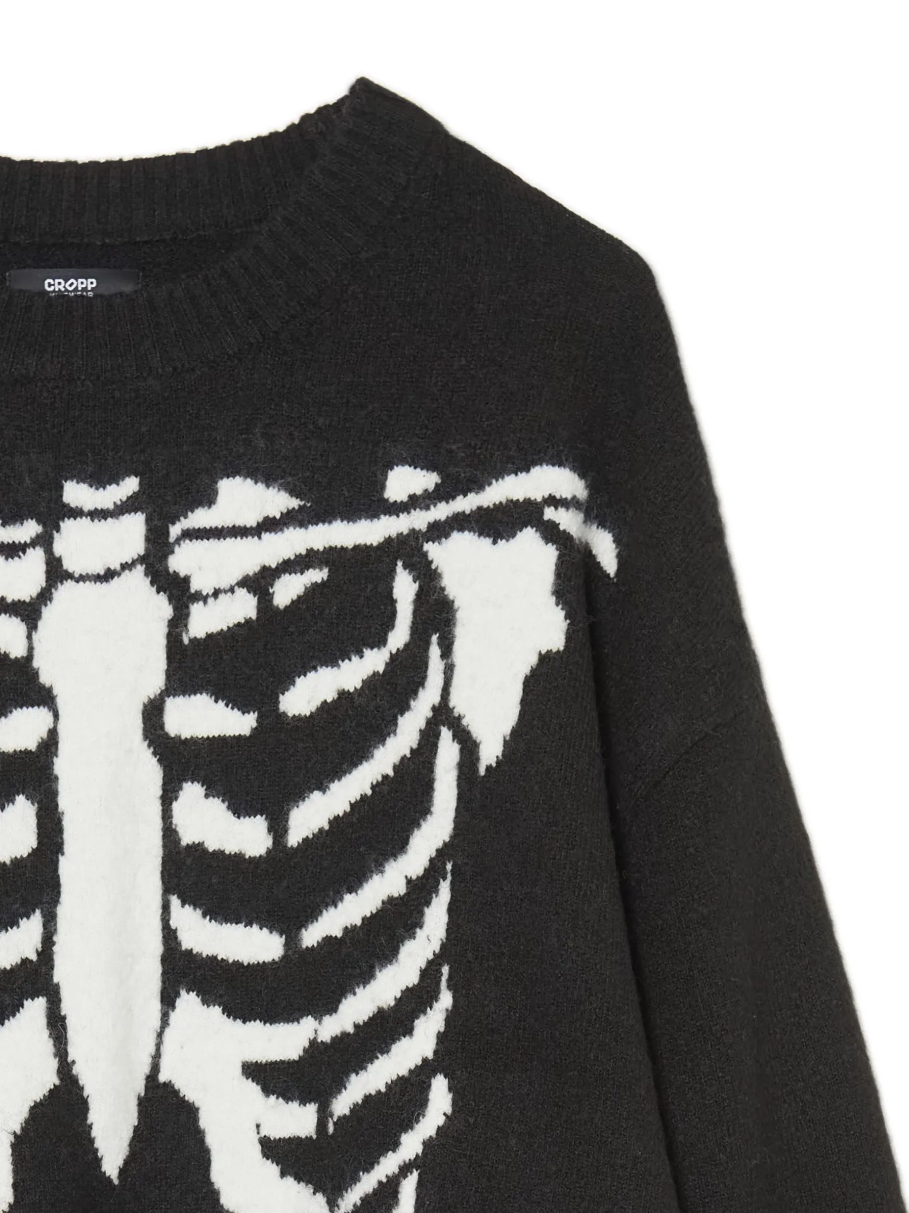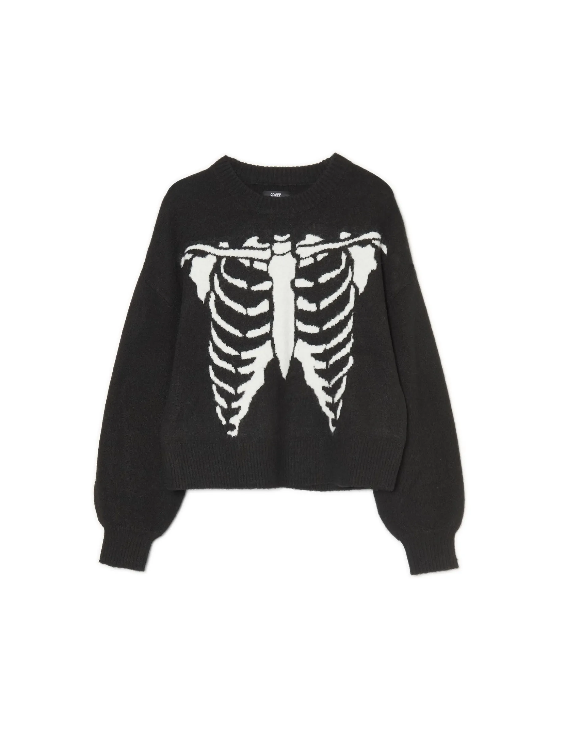 Czarny sweter damski o regularnym kroju, uszyty z elastycznej dzianiny. Z przodu kontrastowy nadruk.