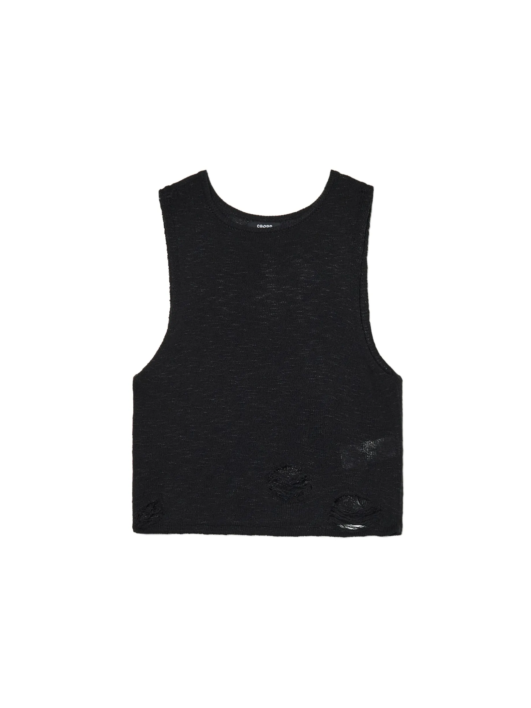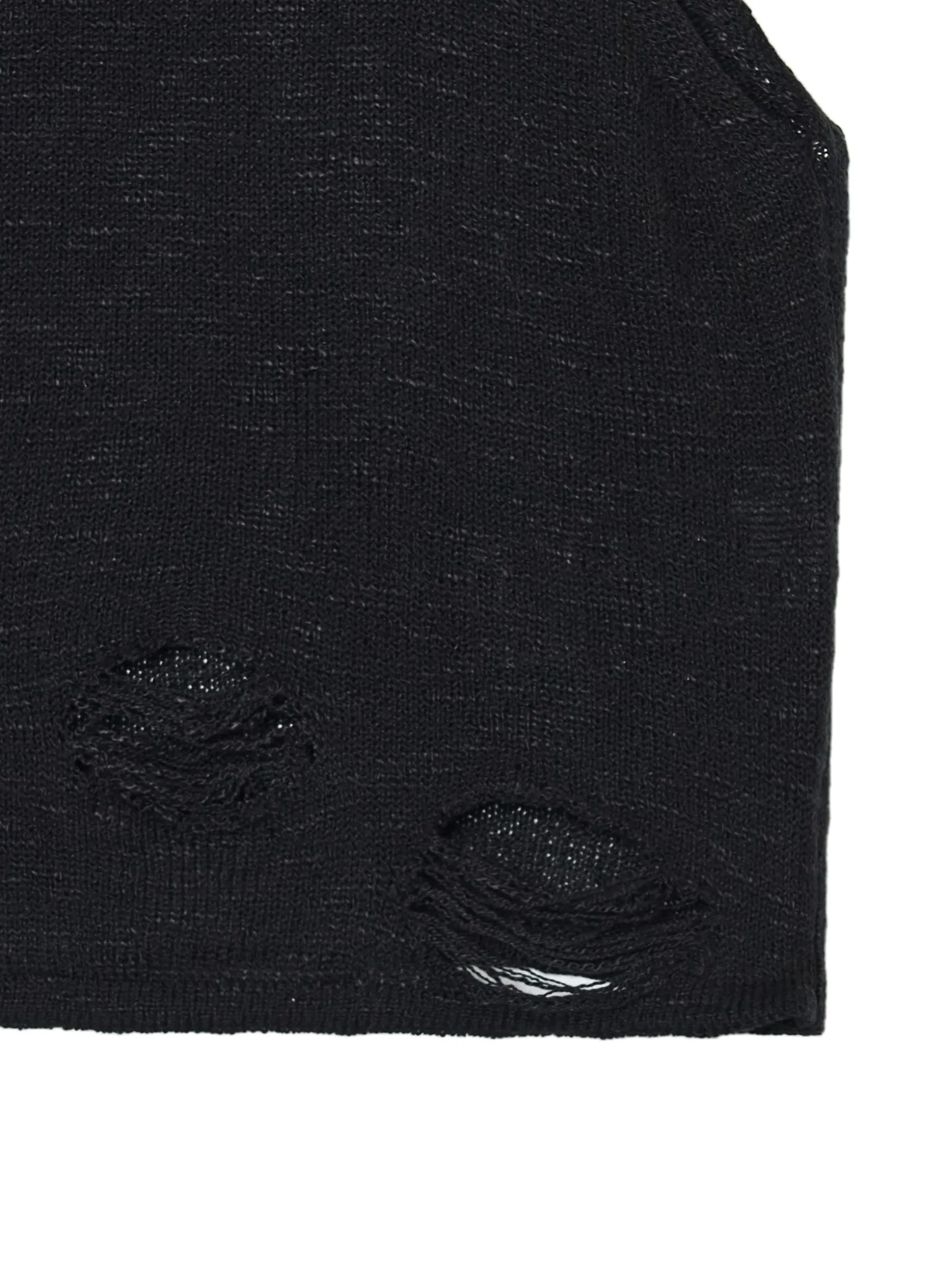 Damski czarny top typu tank uszyty z dzianiny imitującej sweter. Hitem tego modelu są delikatne przetarcia i prześwitujący materiał. wyjątkowo mocny, a jednocześnie wygodny materiał prosty krój szersze ramiączka przetarcia i postrzępienia