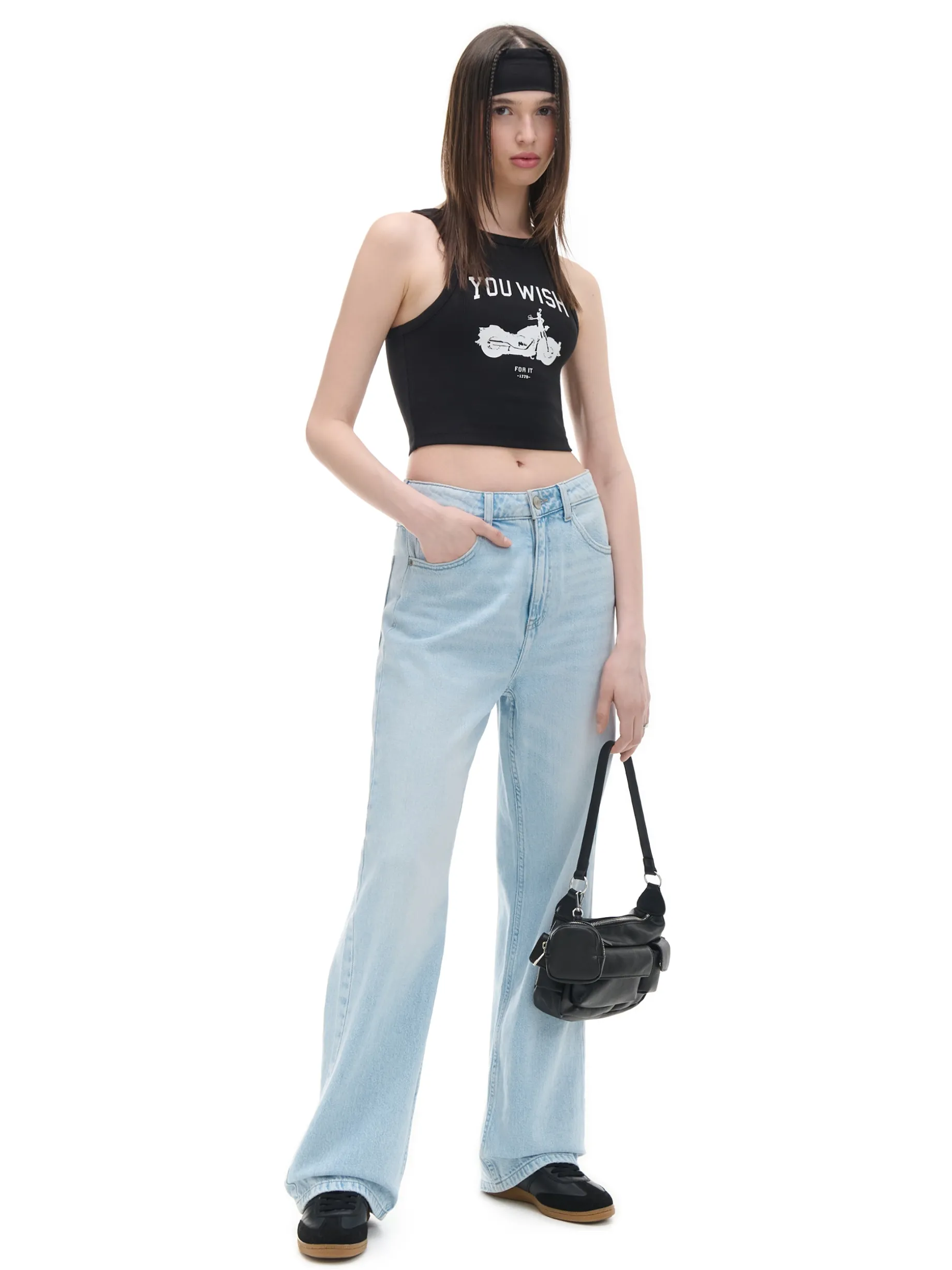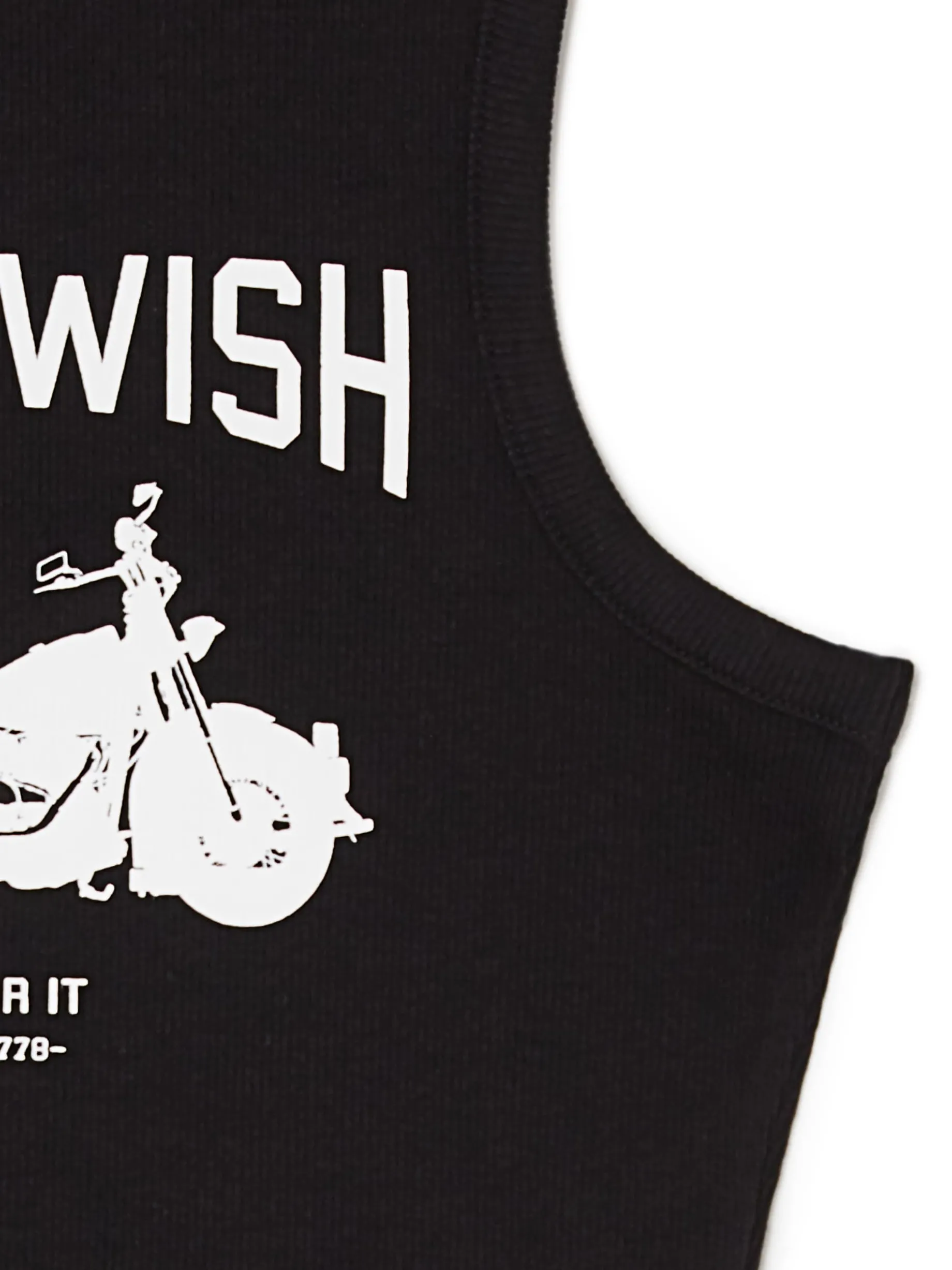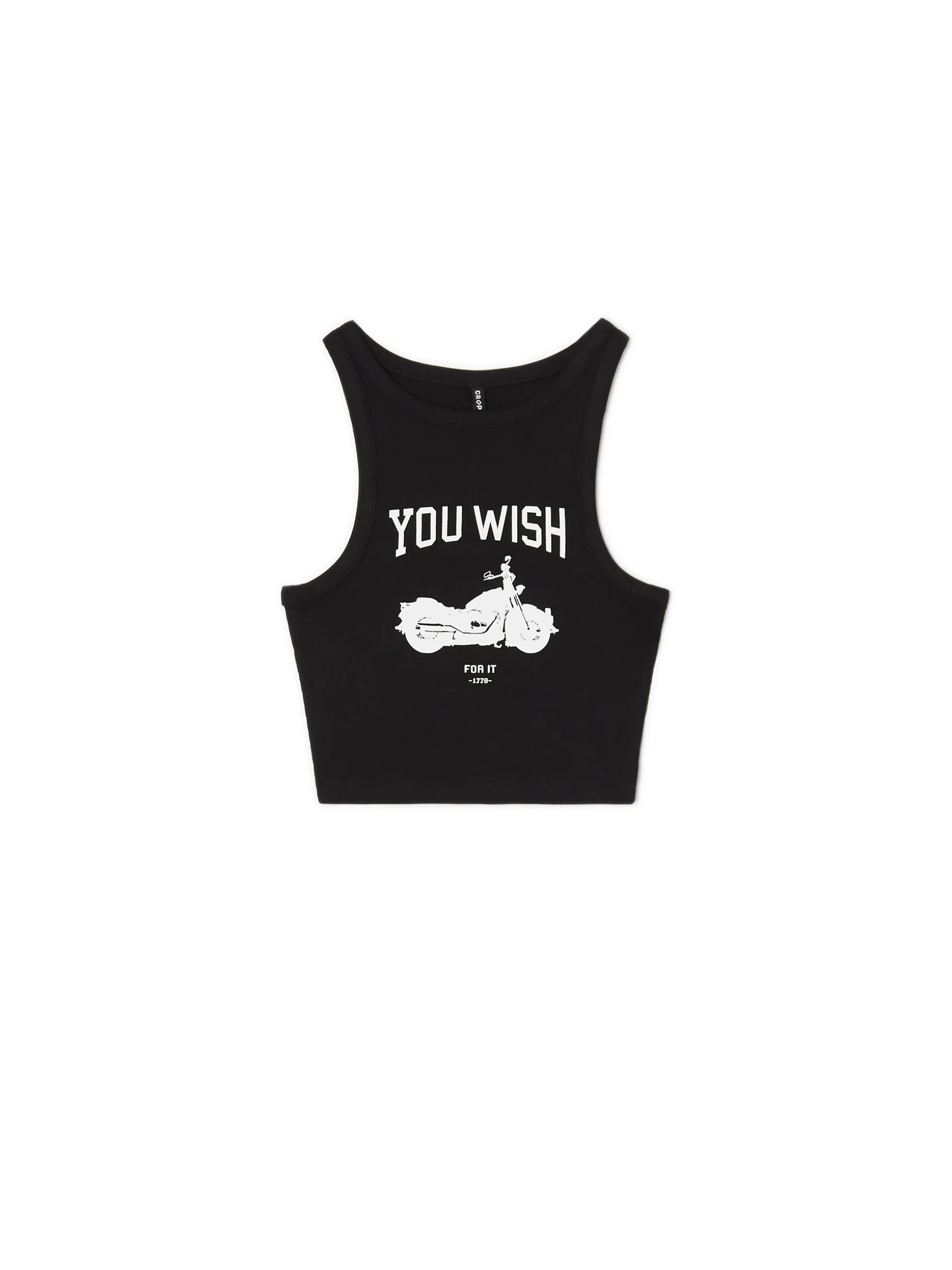 Ten czarny, damski top z nadrukiem świetnie fituje zarówno z marynarkami, jak i luźnymi bluzami. Dodatkowy, elastyczny materiał gwarantuje dopasowanie i komfort. Make you wish! Modelka prezentuje produkt w rozmiarze S/36. Wzrost modelki: 175 cm