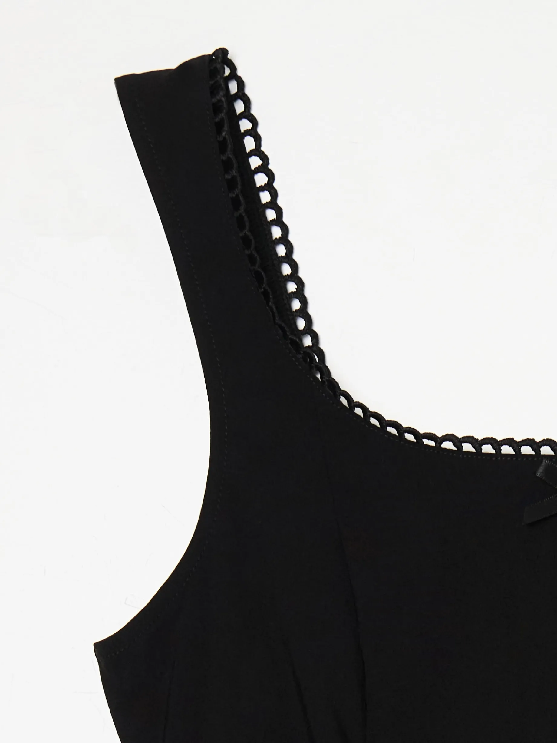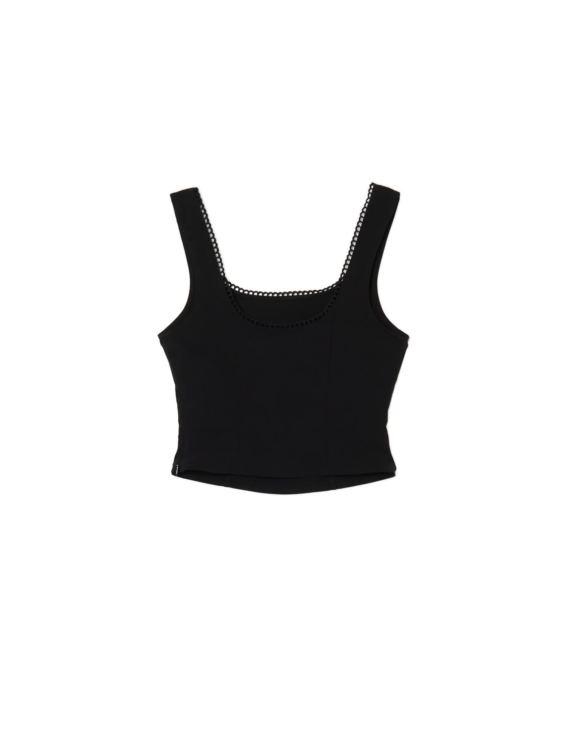 Damski top uszyty z mieszanki tkanin o dużej zawartości wiskozy. Ozdobą są wstawki modelujące sylwetkę, dekoracyjne wykończenie wokół dekoltu i mała kokardka na przodzie. wiskoza z domieszką elastycznych włókien dopasowany krój podkreślający sylwetkę zapięcie na kryty zamek z boku cienkie ramiączka modelujące zakładki z przodu kwadratowy dekolt z przodu i z tyłu ozdobne wykończenie przy dekolcie