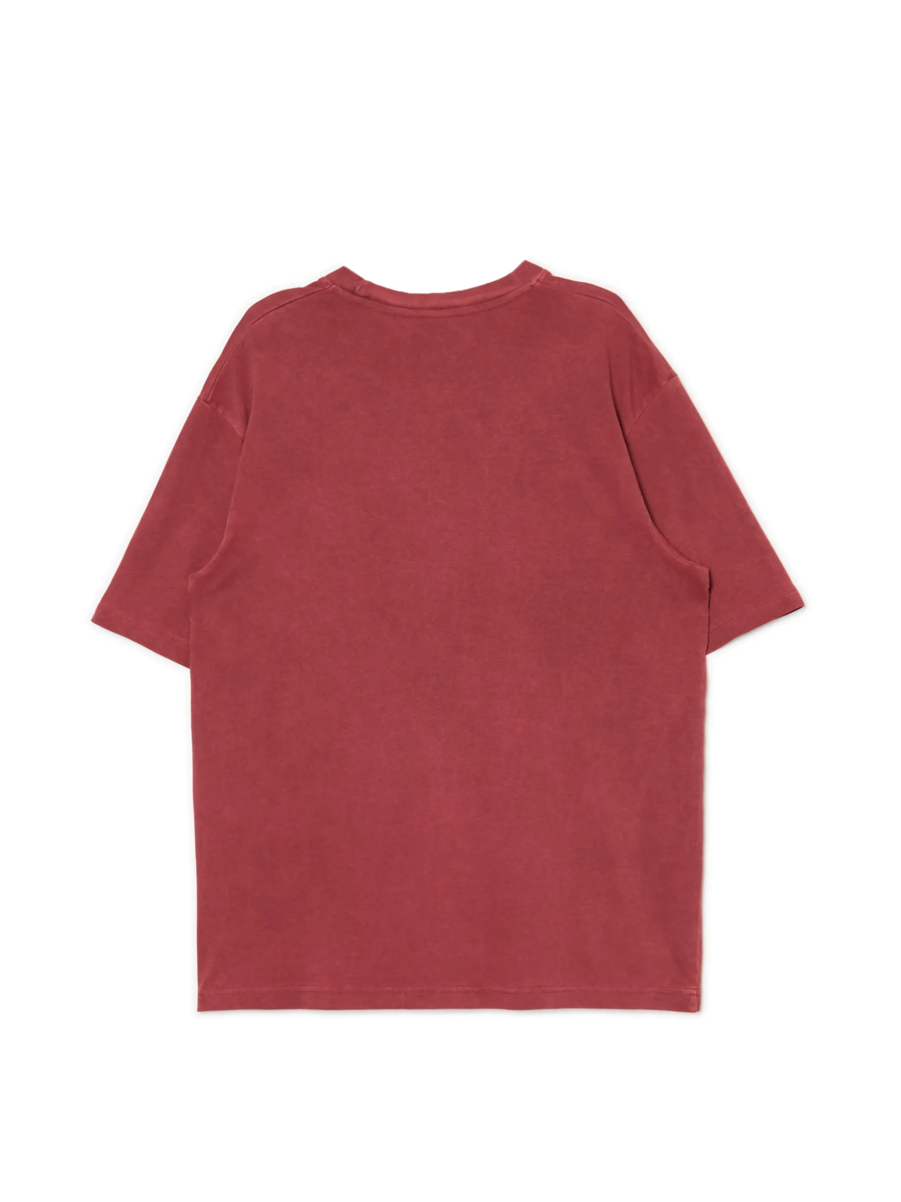 Męski T-shirt z krótkim rękawem, uszyty z bawełnianej dzianiny z małym nadrukiem na piersi. Barwiony karminowym pigmentem dla uzyskania intensywnego koloru materiału. 100% bawełny wygodny krój comfort krótkie, swobodne rękawy okrągły dekolt z lamówką efekt sprania na całości