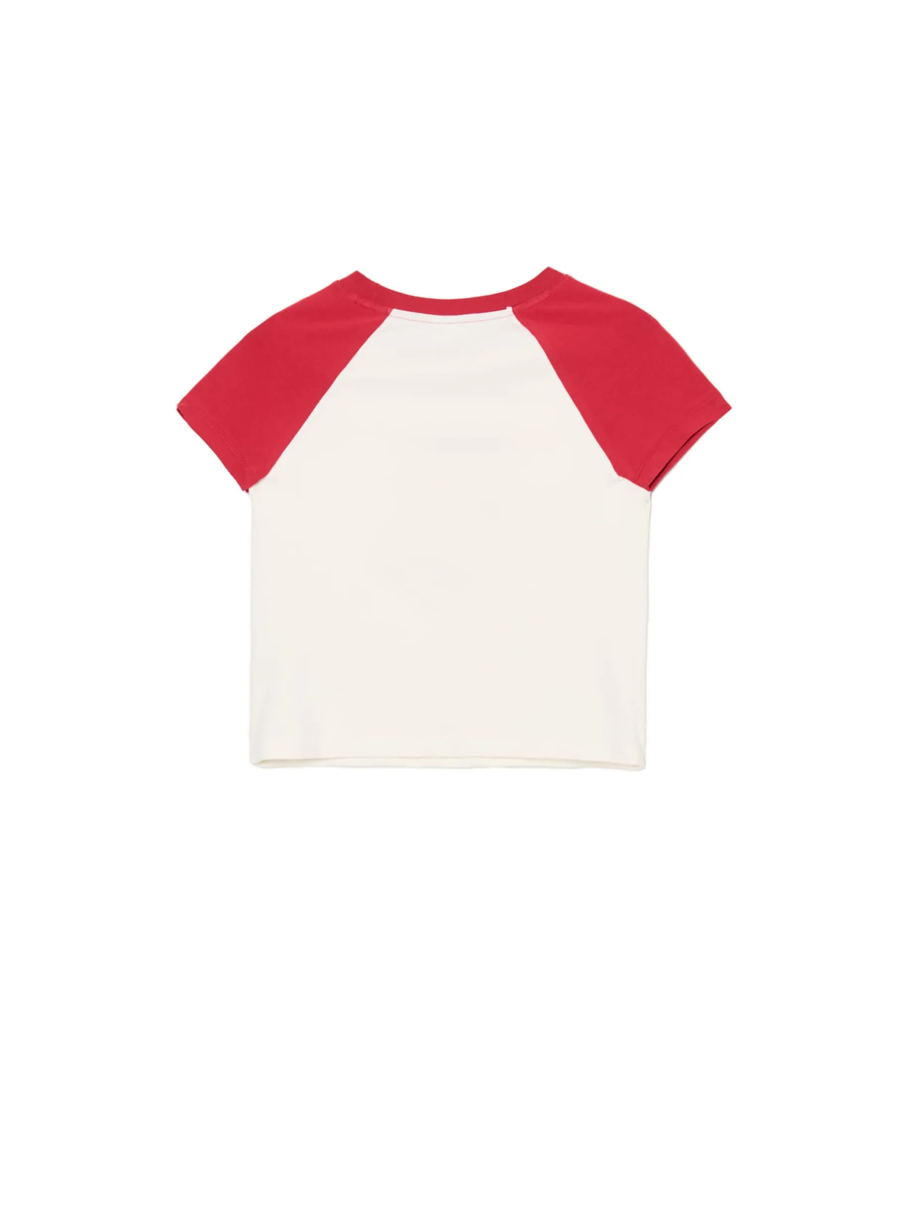 Koszulka damska uszyta z dzianiny o bardzo wysokiej zawartości bawełny. Z przodu nadruk z owocowym motywem. bawełna z dodatkiem elastycznych włókien dopasowany krój podkreślający sylwetkę krótkie, raglanowe rękawy oryginalny print
