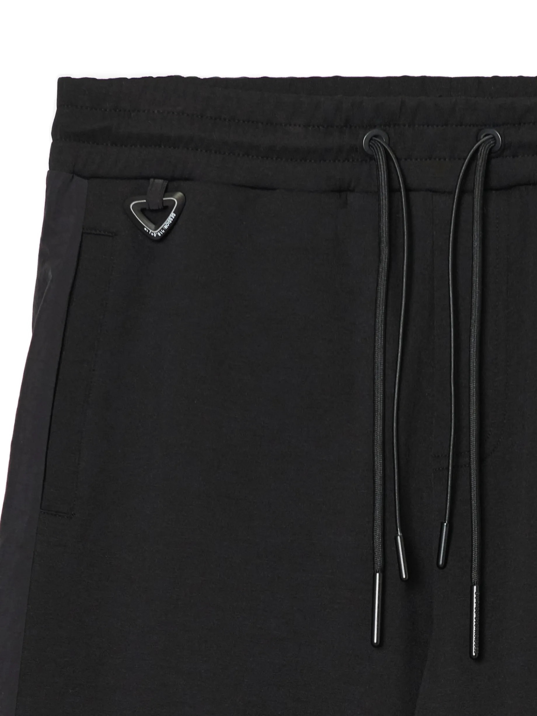 Męskie czarne dresy o kroju comfort uszyte z solidnej, dżersejowej dzianiny zawierającej bawełnę. Model wyróżniają tkaninowe wstawki na lampasach i tylnej kieszeni. Jako dodatek wszyta metalowa pętelka do zawieszania np. kluczy czy otwieracza do piwa. dzianina z dodatkiem elastycznych włókien wygodny krój comfort elastyczna gumka w pasie podwójne sznurowanie w pasie długie nogawki wykończone ściągaczem z boku nogawek ozdobny lampas otwarte kieszenie po bokach z tyłu kieszeń z zamkiem dodatkowa metalowa szlufka z nadrukiem naszywka z napisem Cropp