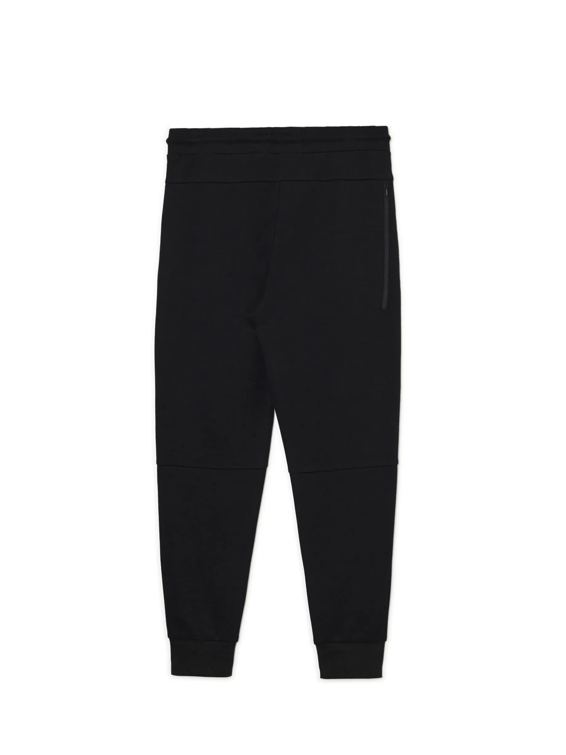 Czarne męskie spodnie typu jogger o kroju regular, uszyte z solidnej, dżersejowej dzianiny zawierającej bawełnę. Dzięki kieszeniom na zamek, Twoje rzeczy będą bezpieczne podczas różnych aktywności. dresowe spodnie typu jogger dzianinowy materiał z bawełną regularny stan gumka w pasie ze sznurkiem do regulacji długie. swobodne nogawki zakończone ściągaczem kieszenie boczne z zamkami ozdobne przeszycia