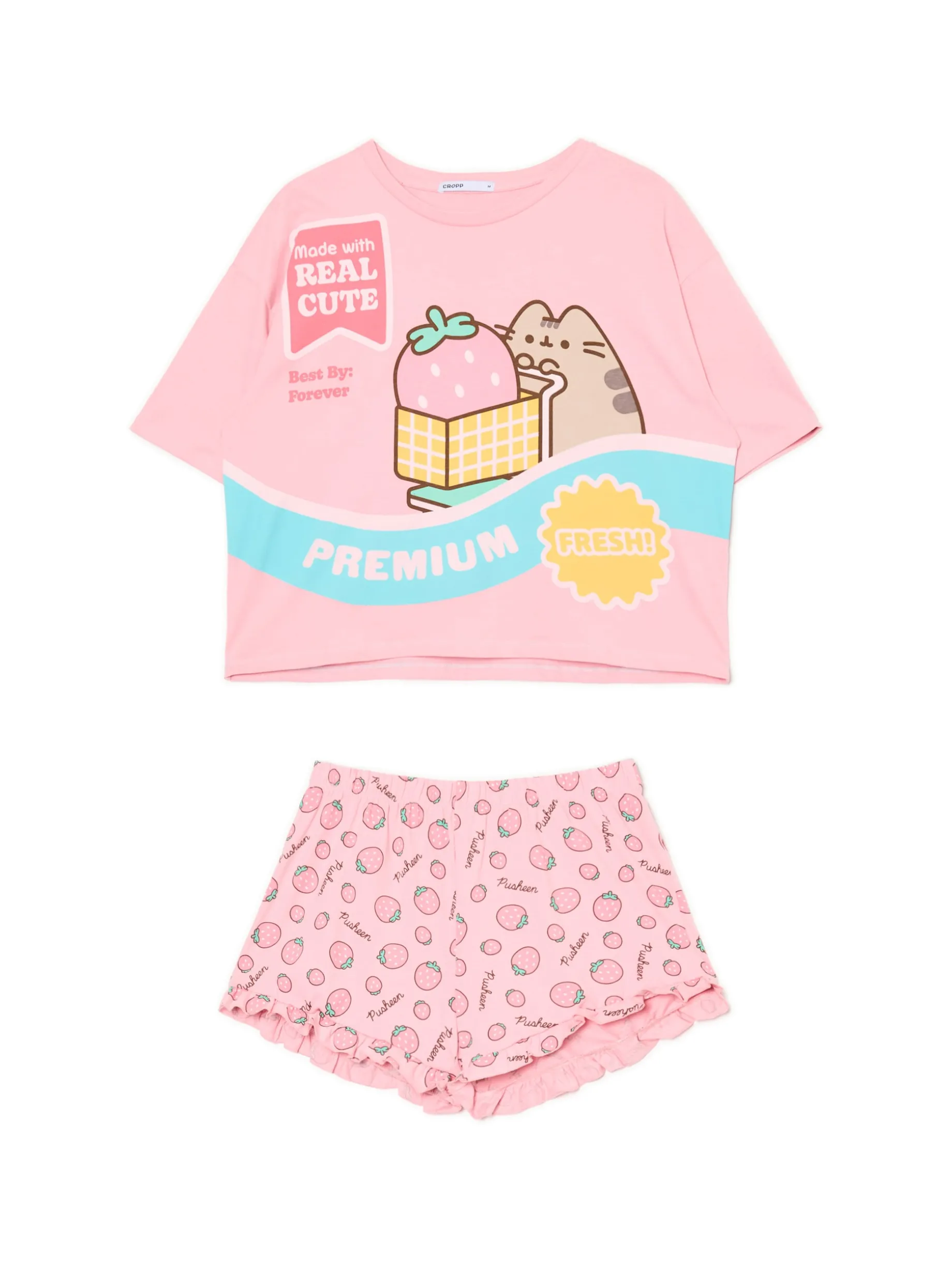 Damska dwuczęściowa piżama, uszyta z bawełnianej dzianiny. Zestaw składa się z wygodnej koszulki i szortów. Góra z krótkim rękawem i nadrukiem Pusheen. Dół z motywem truskawek i ozdobną falbaną. Wrzuć Pusheena do koszyka! 100% bawełny krótkie rękawy koszulka z nadrukiem Pusheen krótkie, swobodne nogawki spodenki z nadrukiem all over w truskawki dół wykończony falbaną © 2024 Pusheen Corp.
