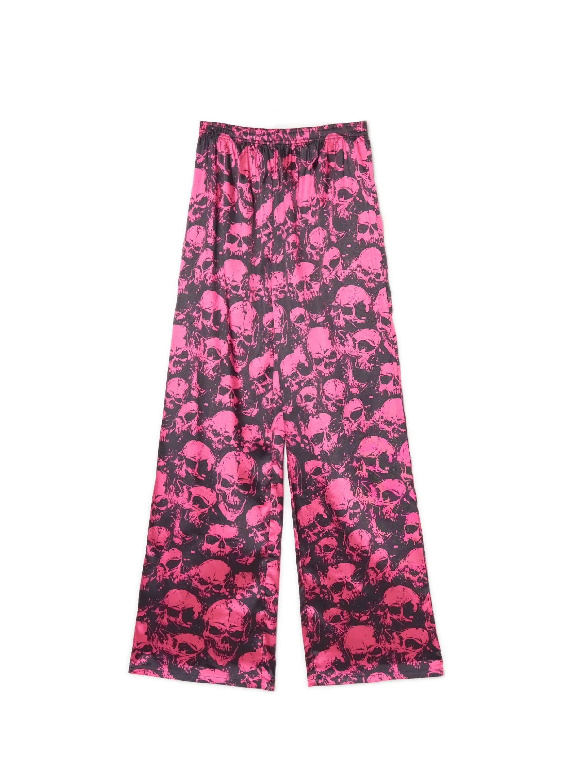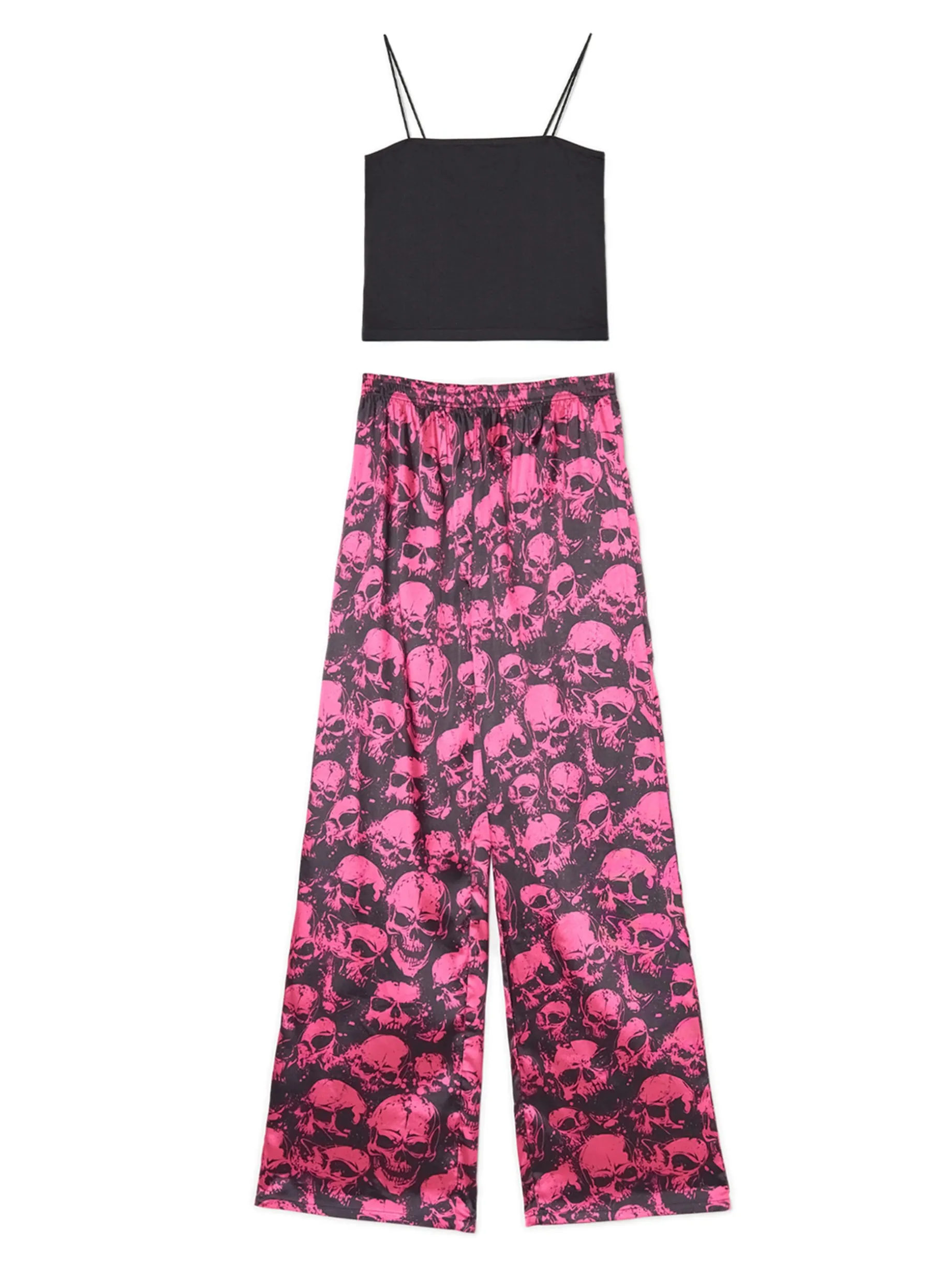 Dwuczęściowa piżama damska uszyta z lekkiego materiału. Piżama składa się z topu na ramiączkach i spodni z szerokimi nogawkami oraz motywem czaszek na całości.