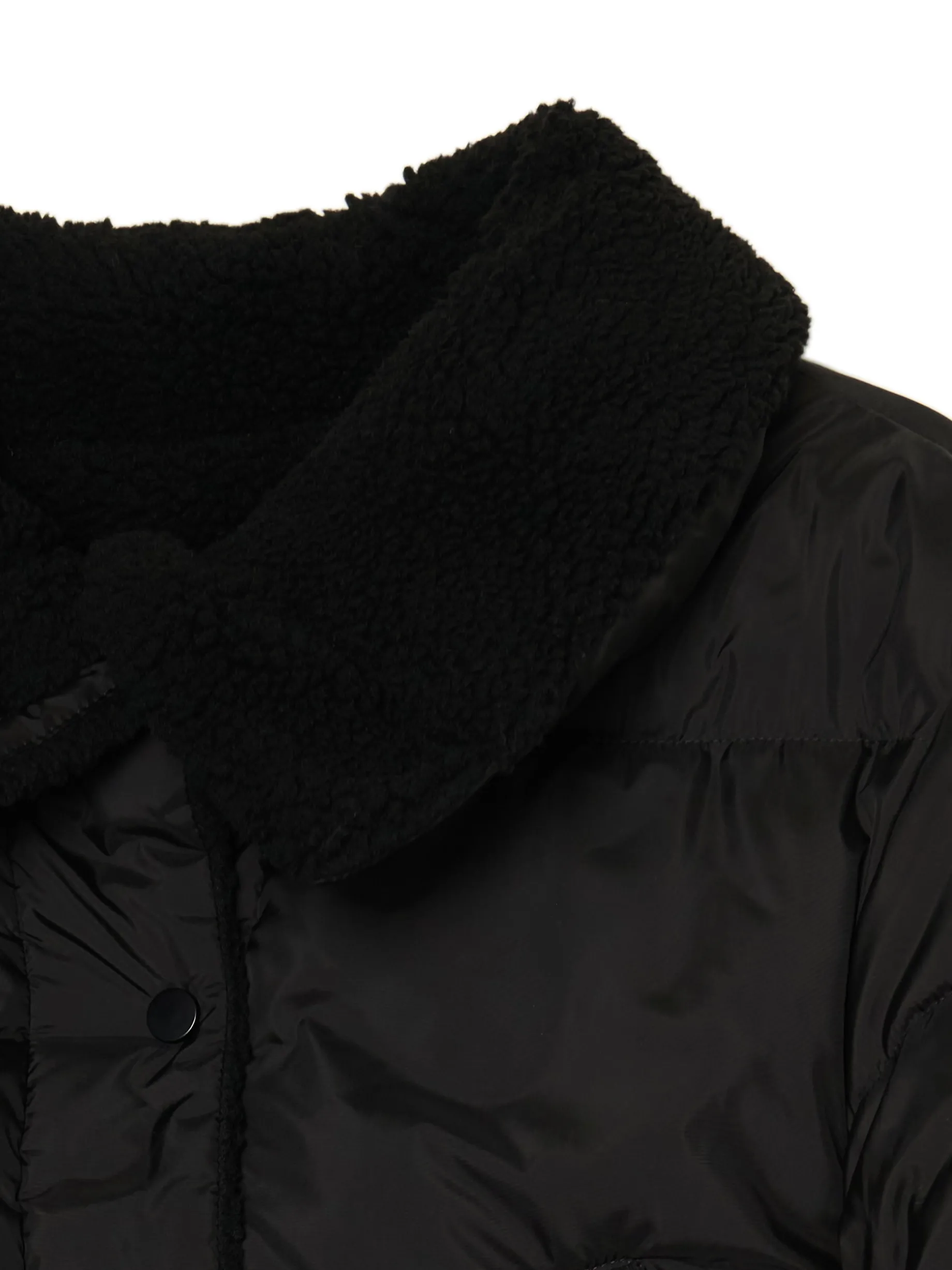 Dwie różne kurtki w jednym modelu! Hitowy damski model pufferki uszyty z jednej strony z lekkiej, trwałej tkaniny, a z drugiej z imitacji baranka. W zależności od nastroju i pomysłu na wyjątkową stylizację – wybierz odpowiednią stronę. przejściowa kurtka sherpa krój oversize pikowanie na całości zapięcie na zatrzaski na całej długości wykończenie na podszyciu ze sztucznego baranka kołnierz z szerokimi klapami boczne kieszenie z zatrzaskami dostępna w dwóch kolorach