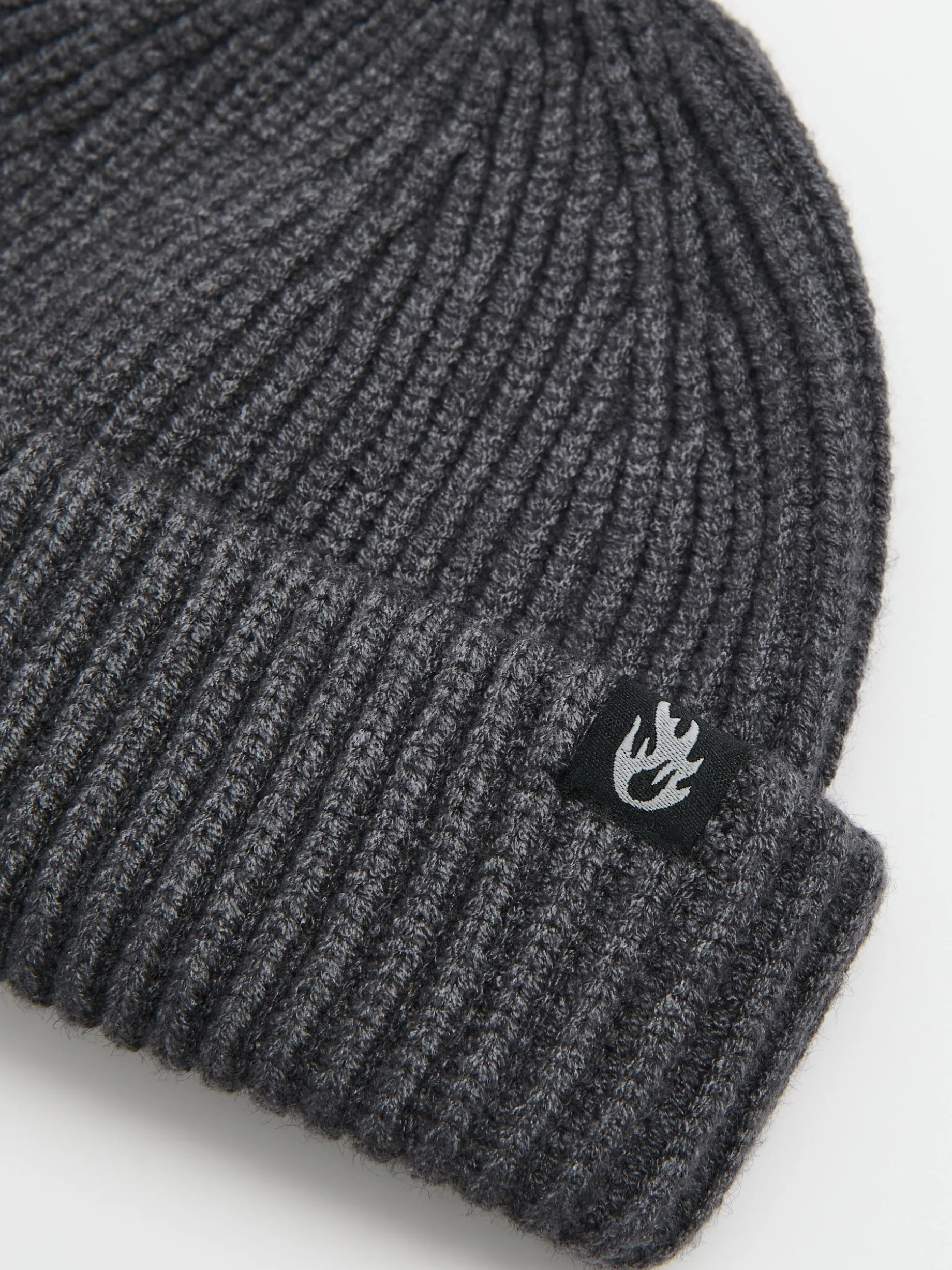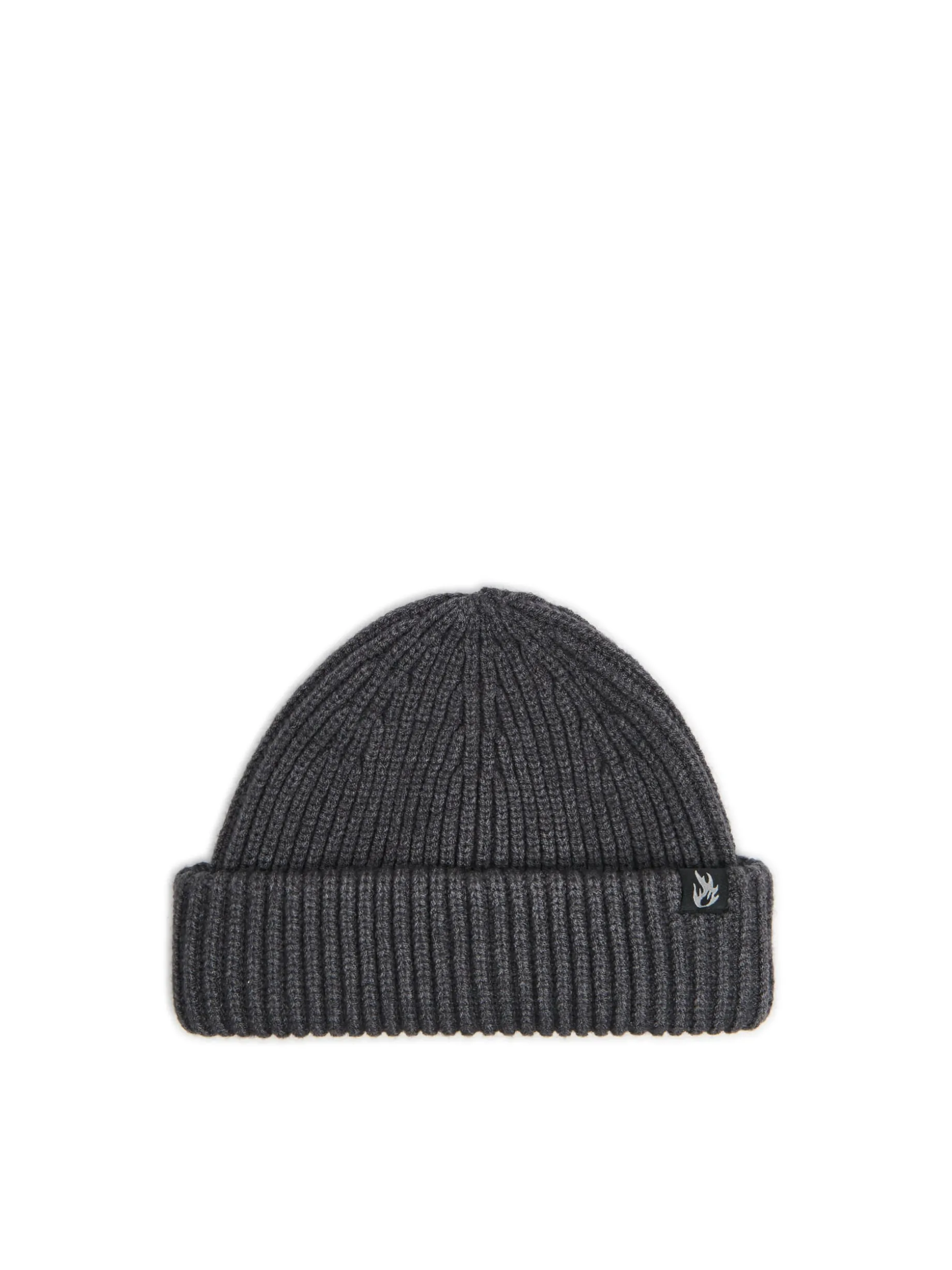Szara męska czapka beanie o skróconym fasonie, wykonana z dzianiny o ryżowym splocie zawierającej wiskozę. Z przodu kontrastująca metka z motywem płomieni. Czapka dostępna w dwóch kolorach. ciepła czapka na zimę lekki materiał z wiskozą prosty krój naszywka z przodu
