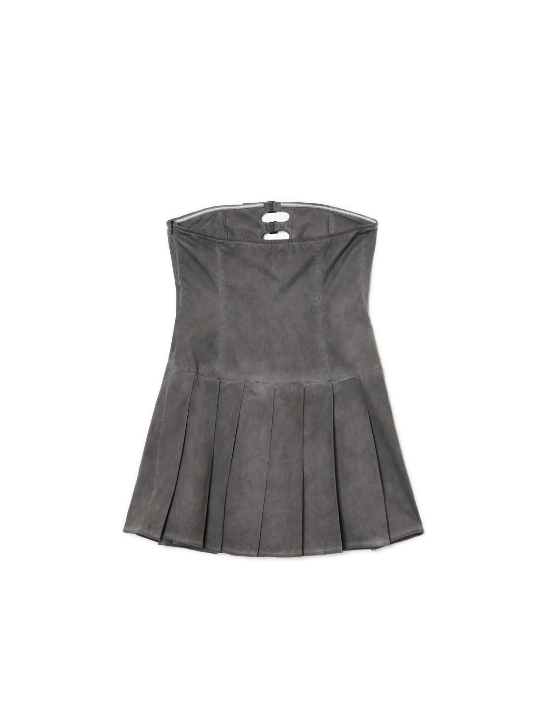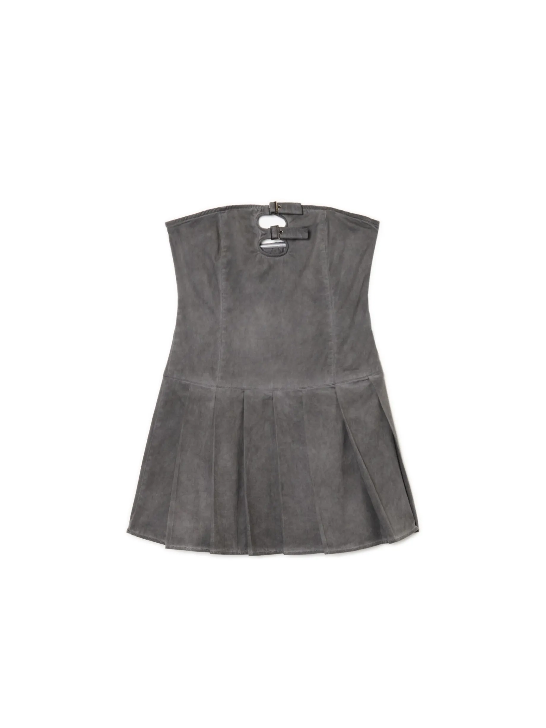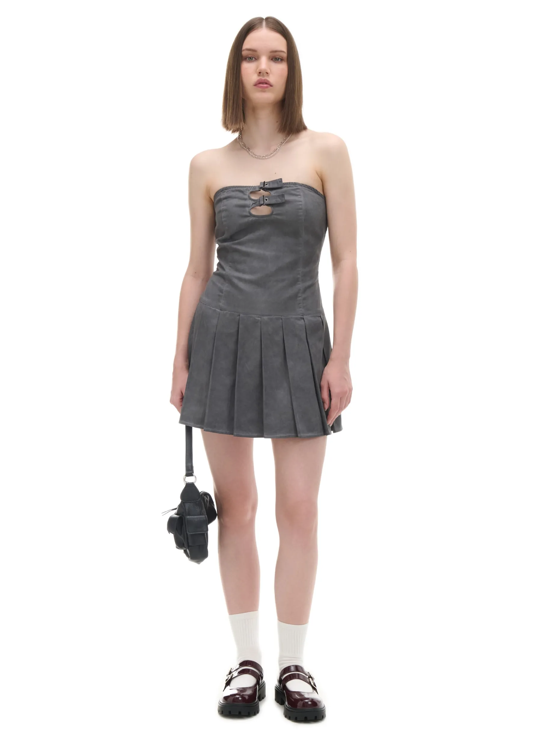 Krótka letnia sukienka, uszyta z szarej bawełnianej tkaniny. Plażowe must-have dla fanek stylu Y2K! długość mini i dopasowany krój bez ramiączek ozdobne paski ze sprzączkami przy dekolcie zapięcie na kryty zamek z boku krótka spódnica z plisami