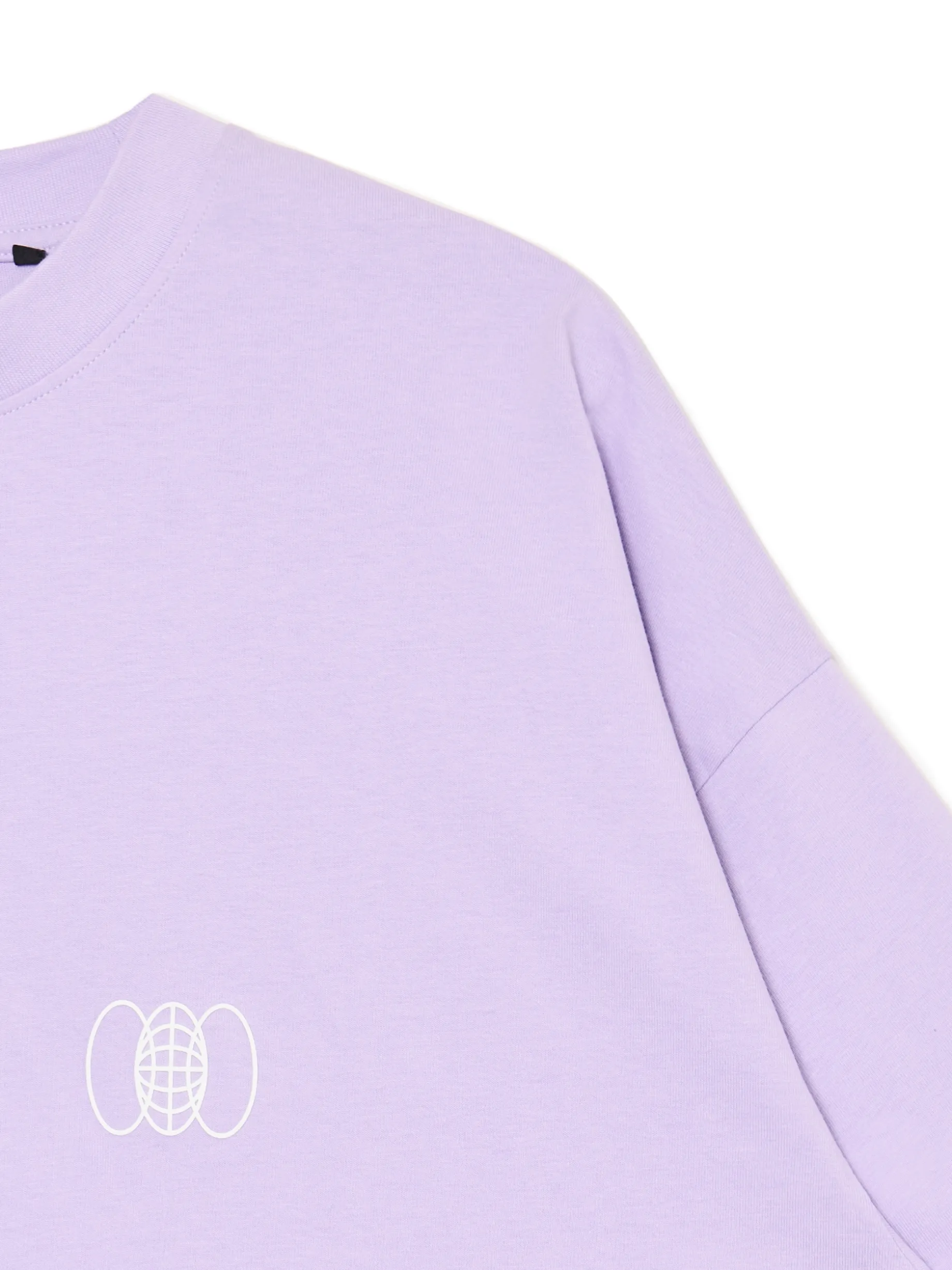 T-shirt męski w kolorze lawendowym, uszyty z bawełnianego materiału. Ozdobą tego modelu jest drobny nadruk na piersi i duży na plecach. 100% bawełny obszerny krój typu boxy krótkie, swobodne rękawy delikatnie obniżona linia ramion mały nadruk na piersi, duży nadruk na plecach Wzrost modela: 185 cm