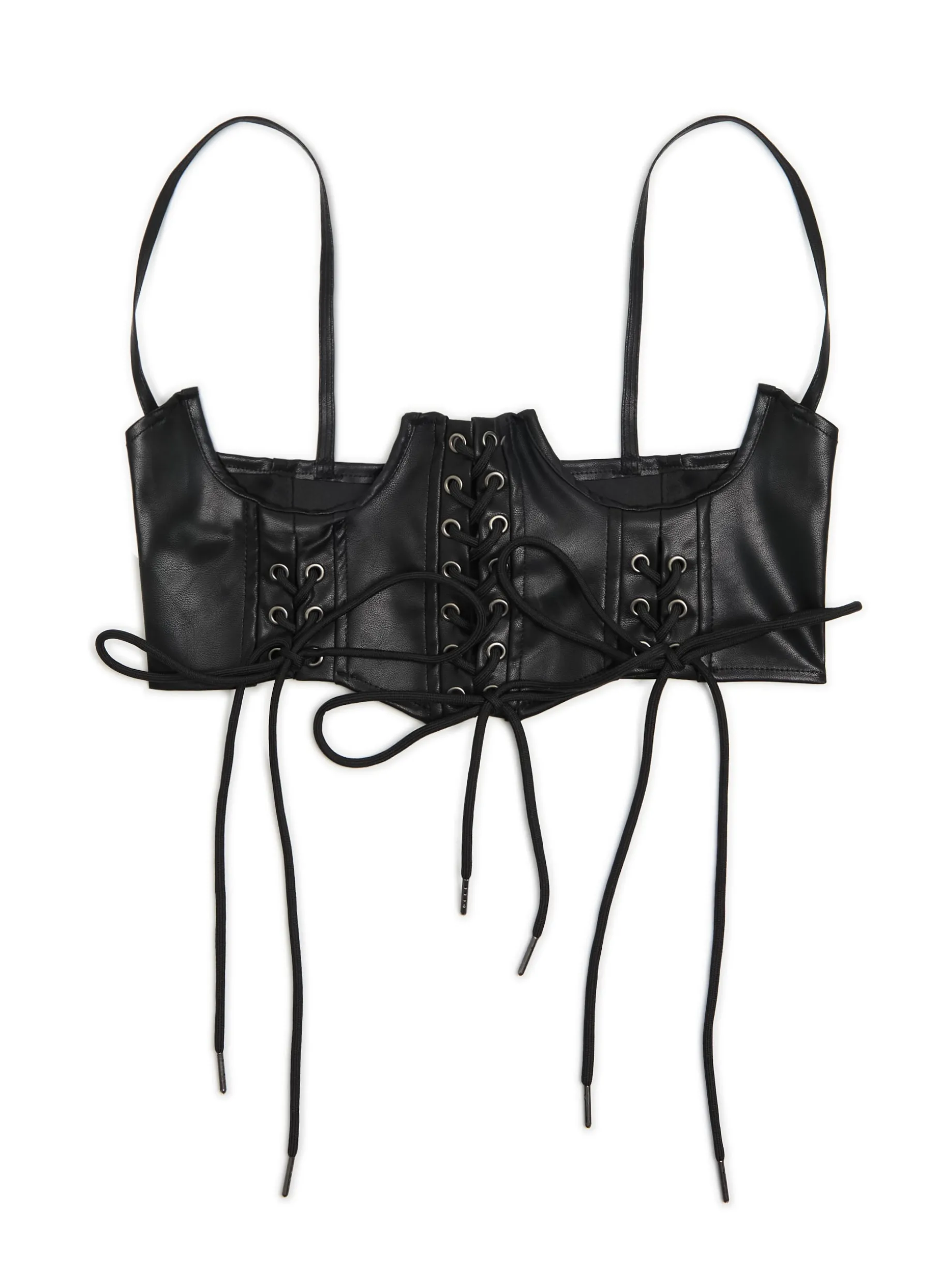 Damski top o dopasowanym, gorsetowym fasonie. Uszyty z materiału imitującego skórę. Cienkie ramiączka, szerokość regulowana sznurkami, w środku gładki materiał. Idealny dodatek do koszulek i sukienek.