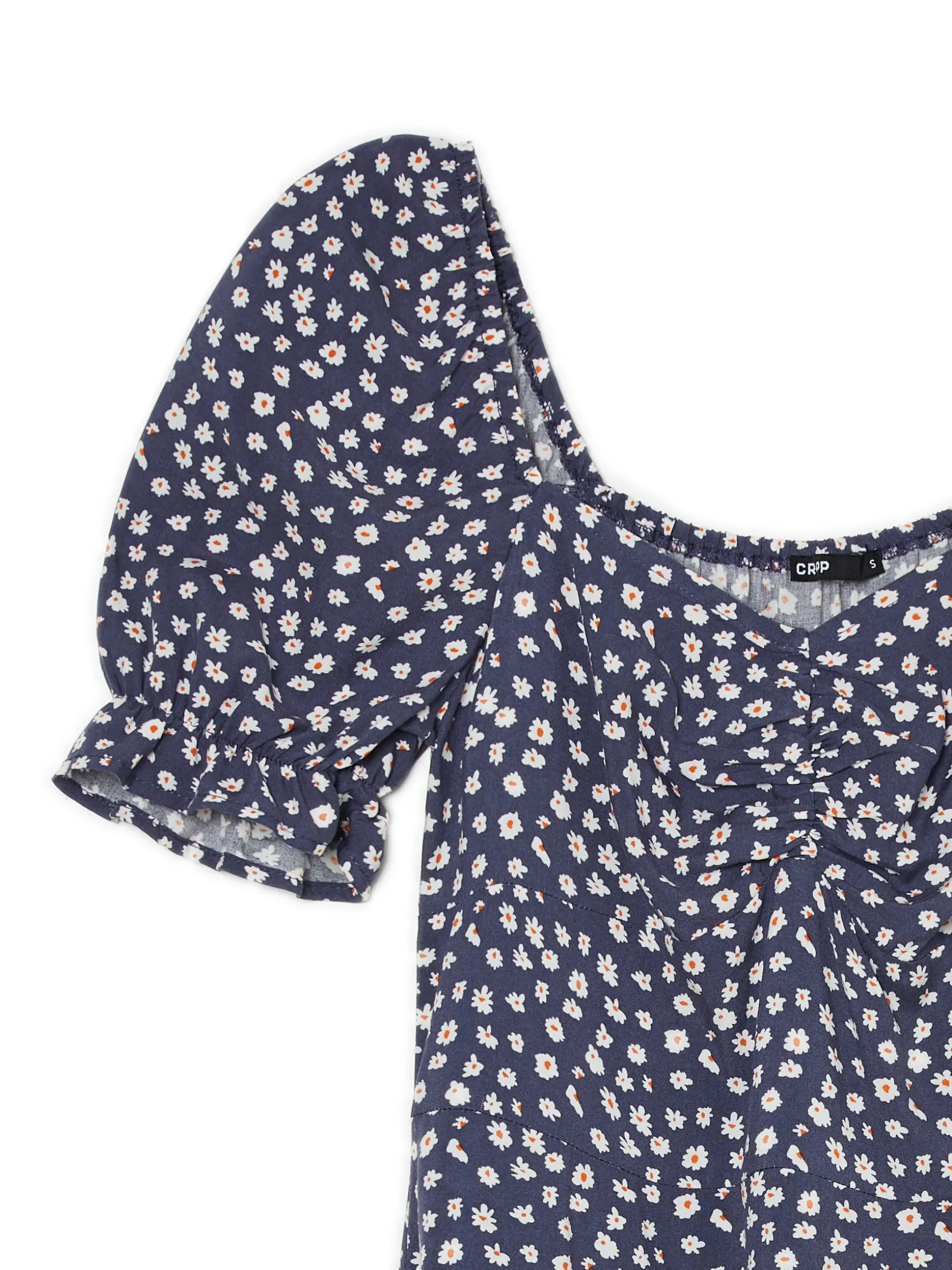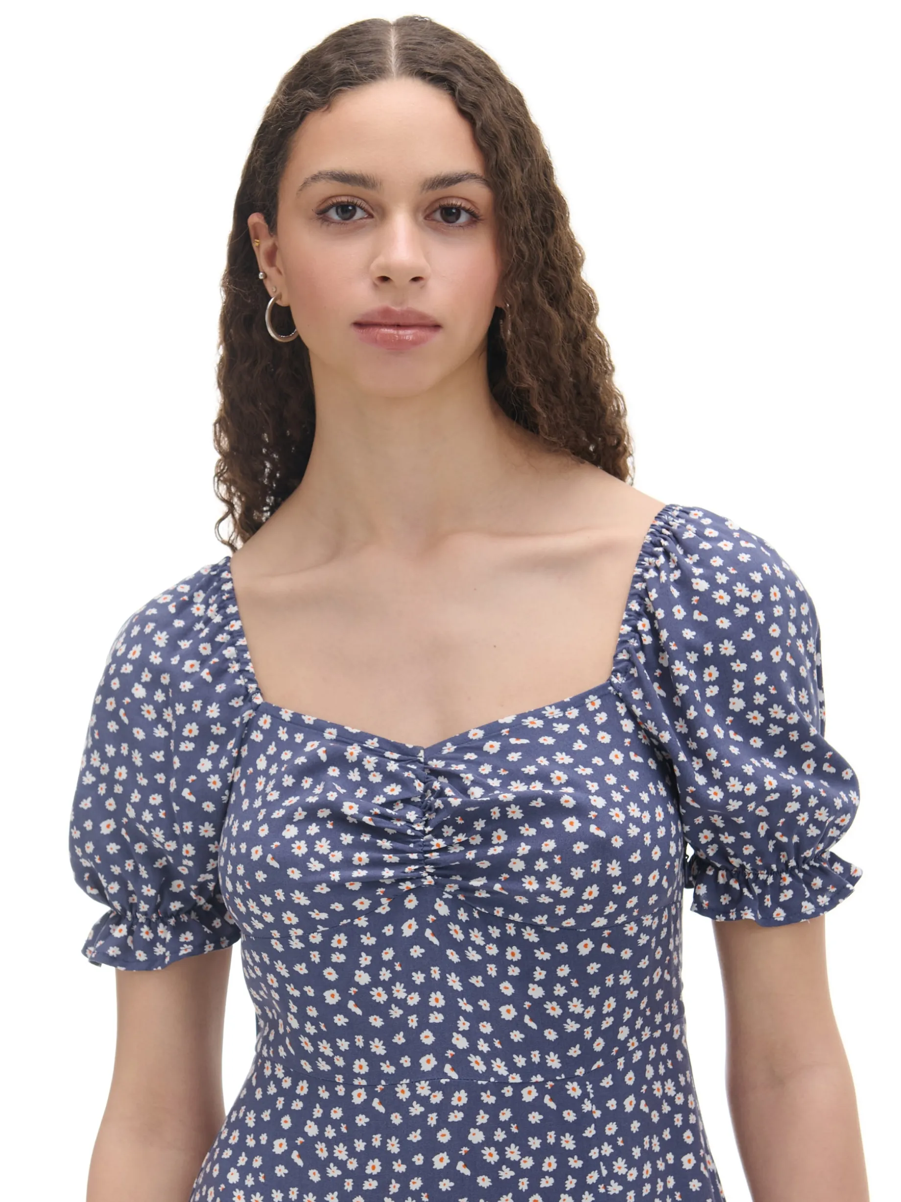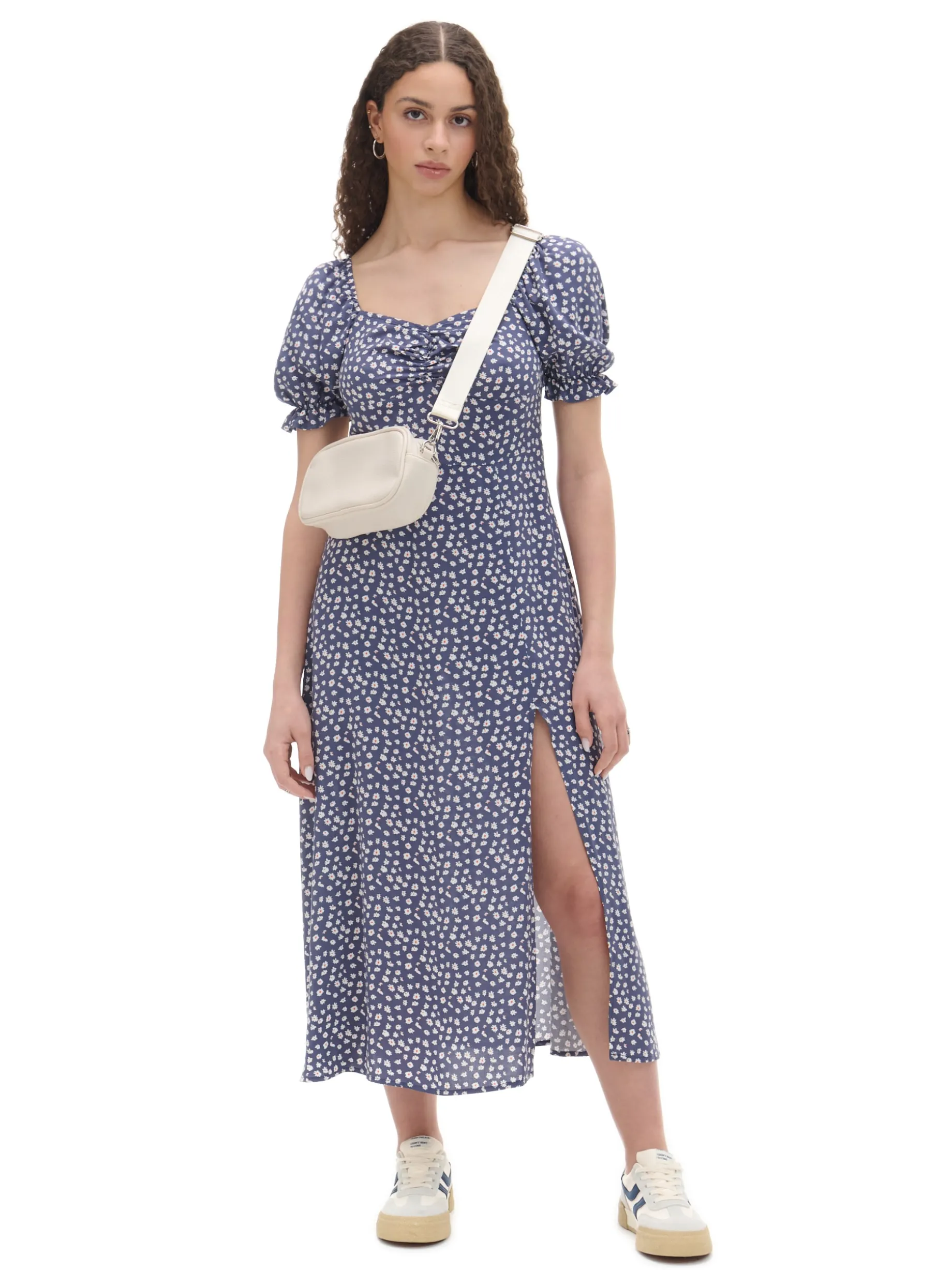 Delikatna damska granatowa sukienka z kwiatowym wzorem, idealna na letnie dni. 100% wiskozy długość midi rozcięcie z boku dekoracyjne marszczenie pod biustem krótkie, bufiaste rękawy zakończone gumką Wzrost modelki: 170 cm