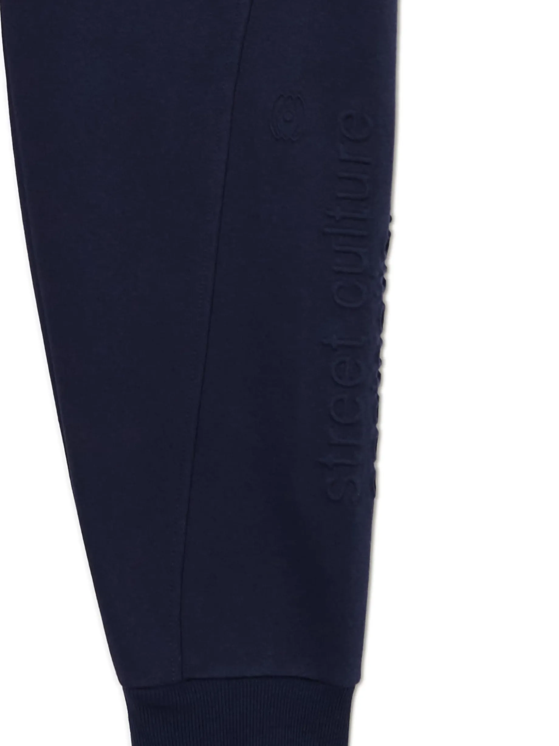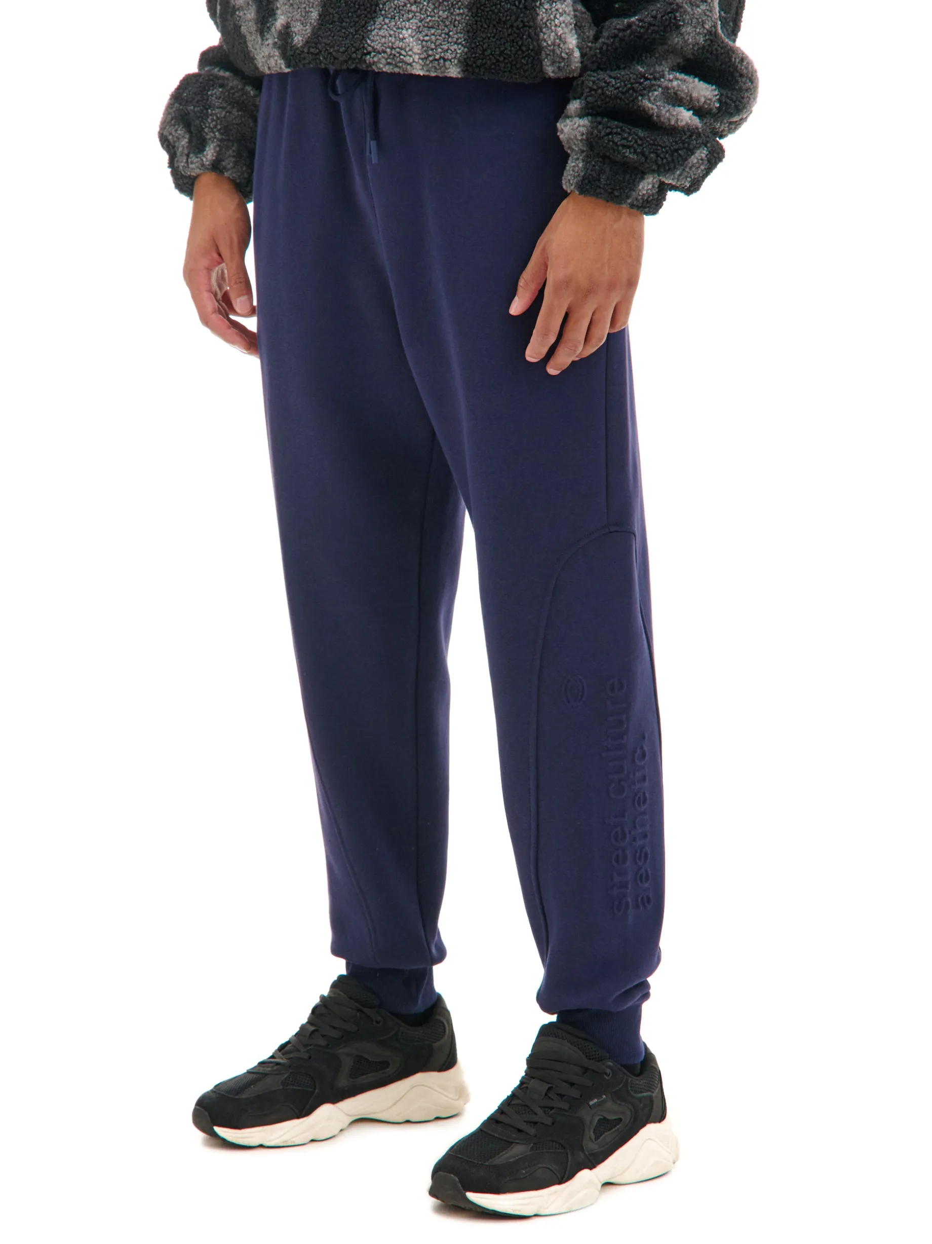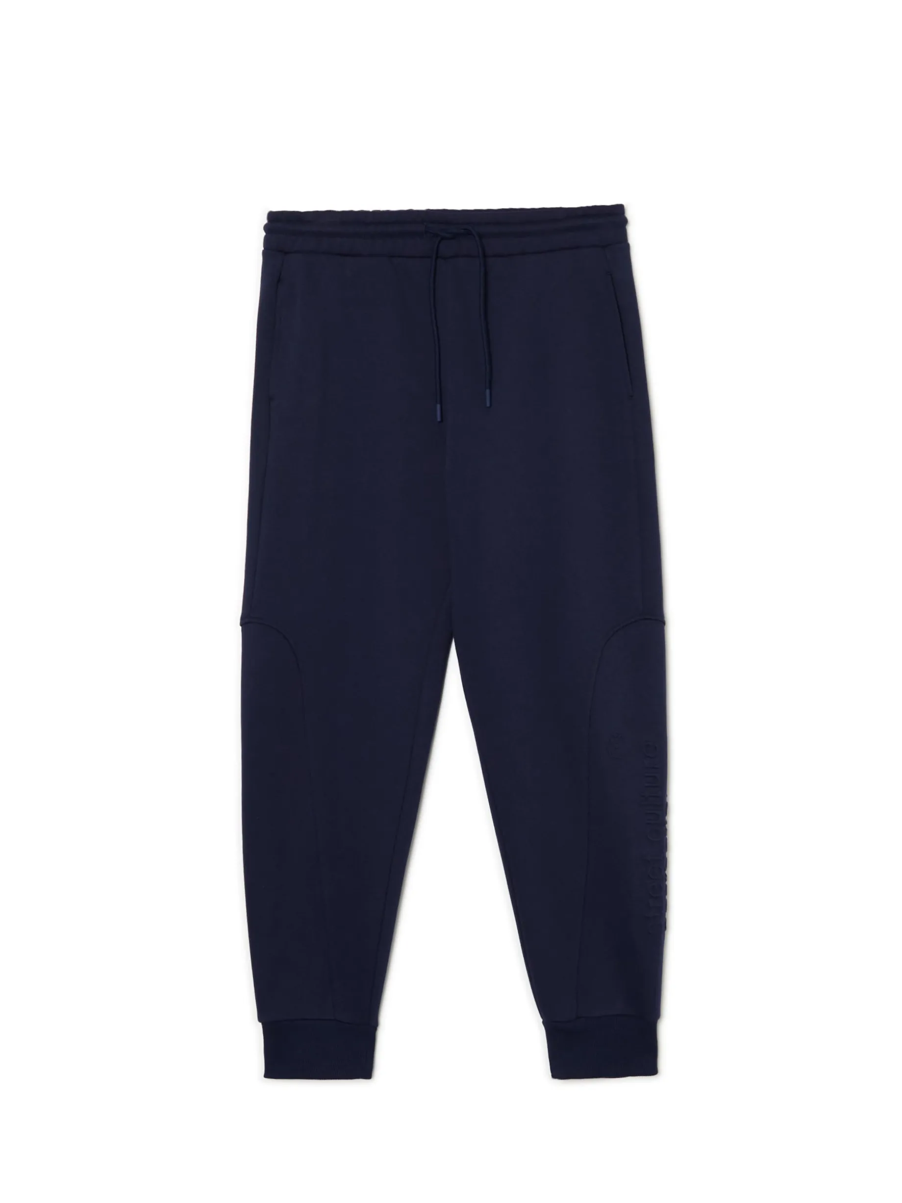 Granatowe męskie dresy z wyjątkowym nadrukiem na nogawce techniką emboss. Materiał jest miękki w dotyku i delikatnie wypukły, przez co wpisuje się zarówno w sportowy, jak i casualowy styl. dzianinowy materiał z bawełną dresowe joggery o kroju regular guma w pasie ze sznurkiem do regulacji otwarte kieszenie po bokach naszywana kieszeń z tyłu nadruk na nogawce z wykorzystaniem techniki emboss naszywka Cropp