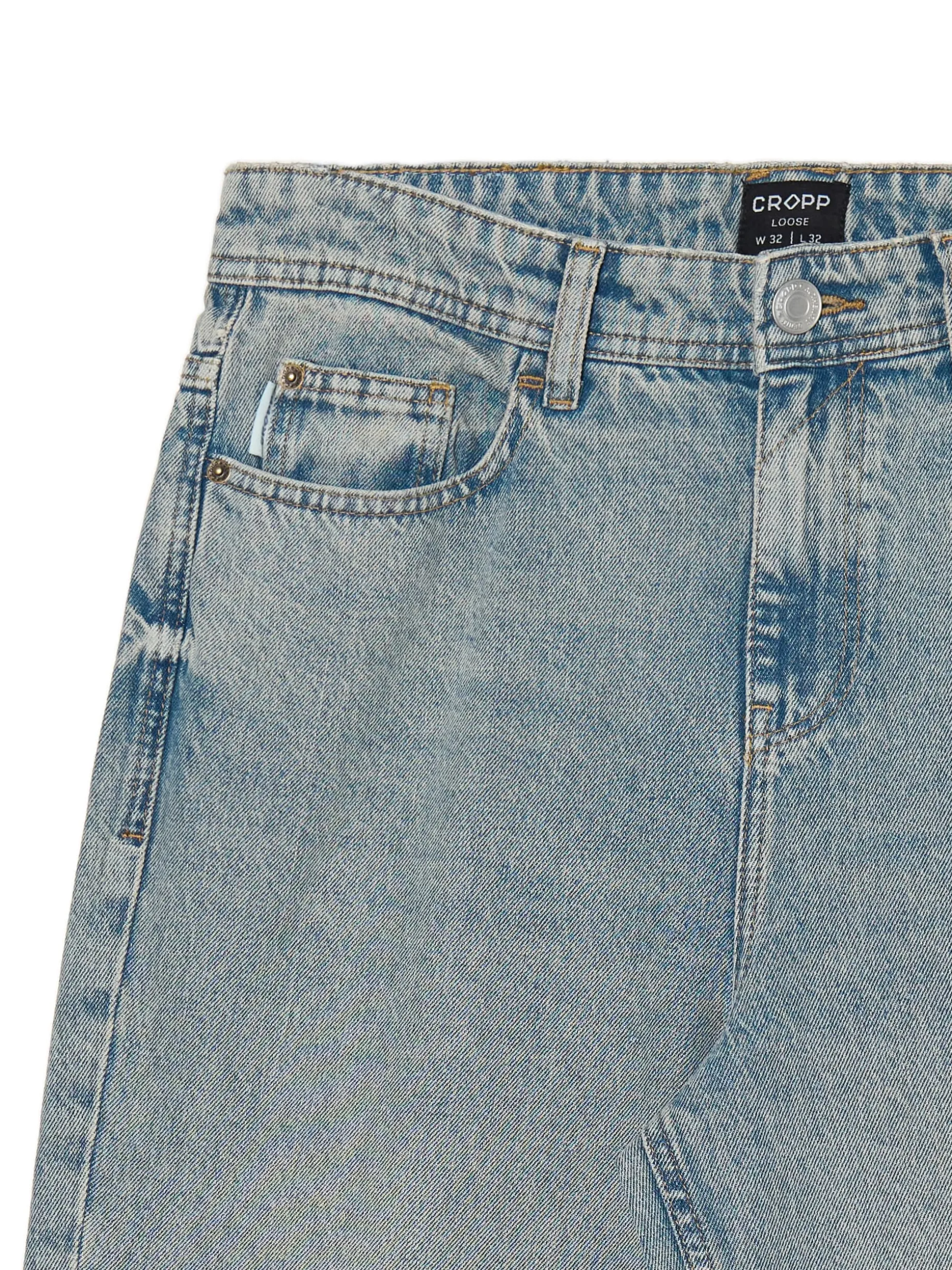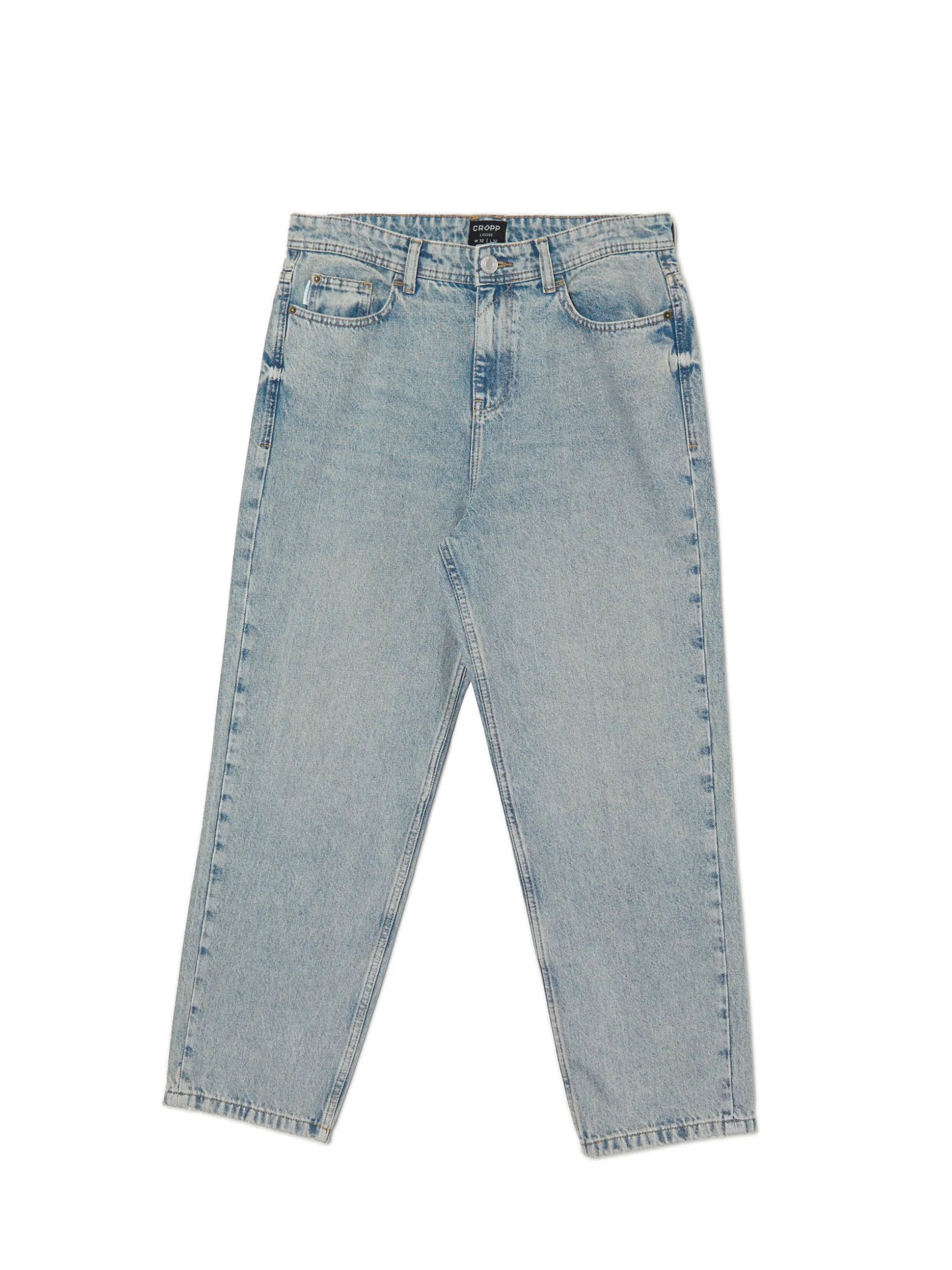 Jasnoniebieskie męskie jeansy o kroju loose, uszyte w 100% z bawełny. w pasie zamek i guzik obniżony krok cztery kieszenie luźna nogawka, lekko zwężana ku dołowi efekt sprania materiału szlufki na pasek Wzrost modela: 185 cm