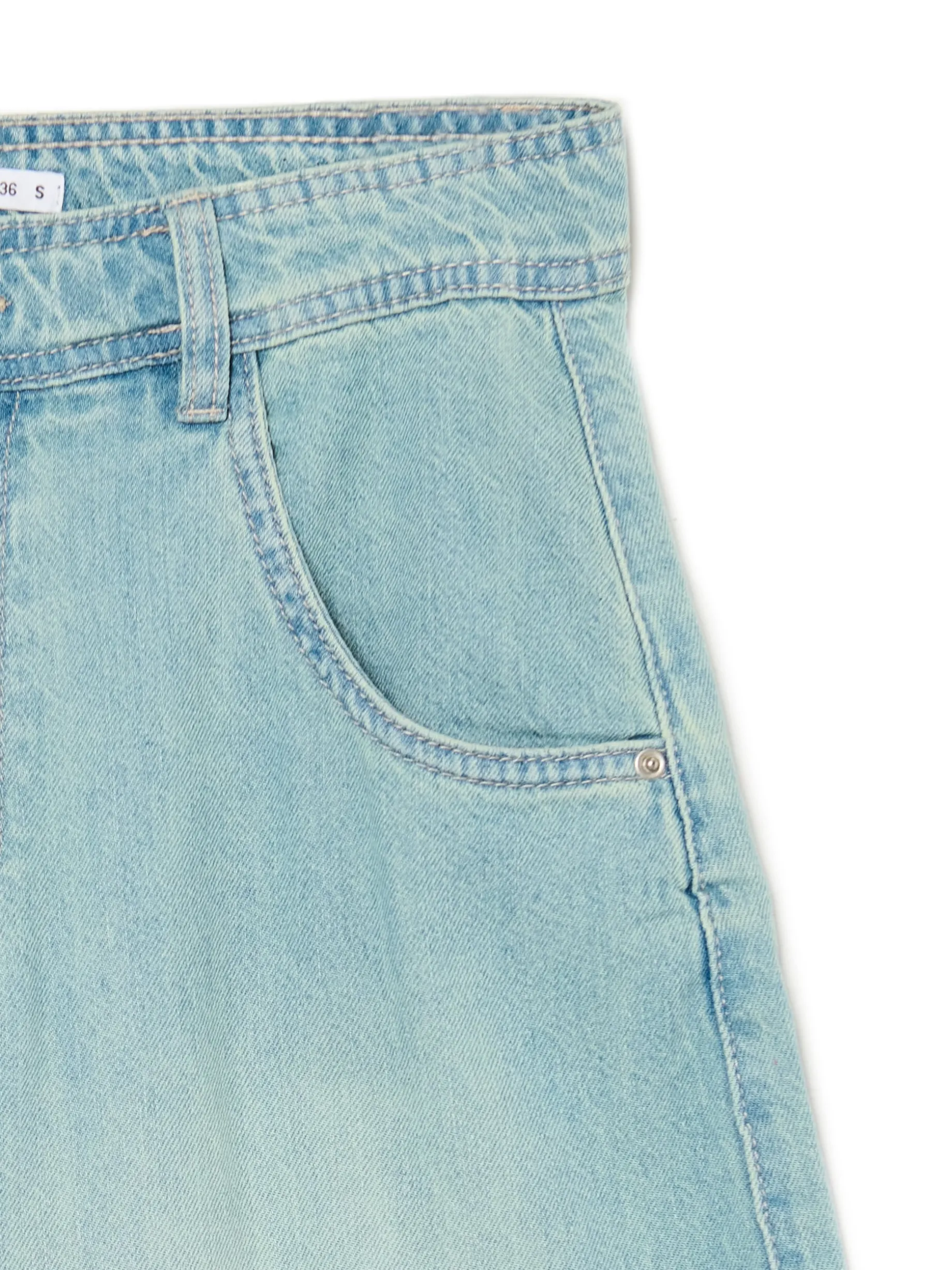 Damskie denimowe spodnie o unikatowym kroju. Wyposażone w wygodne zapięcie, praktyczne kieszenie i delikatny efekt sprania. Idealne na spontany! 100% bawełny długie, szerokie nogawki zapięcie na zamek i guzik szerokie szlufki na pasek 6 kieszeni, w tym kieszenie cargo delikatny efekt sprania Wzrost modelki: 177 cm