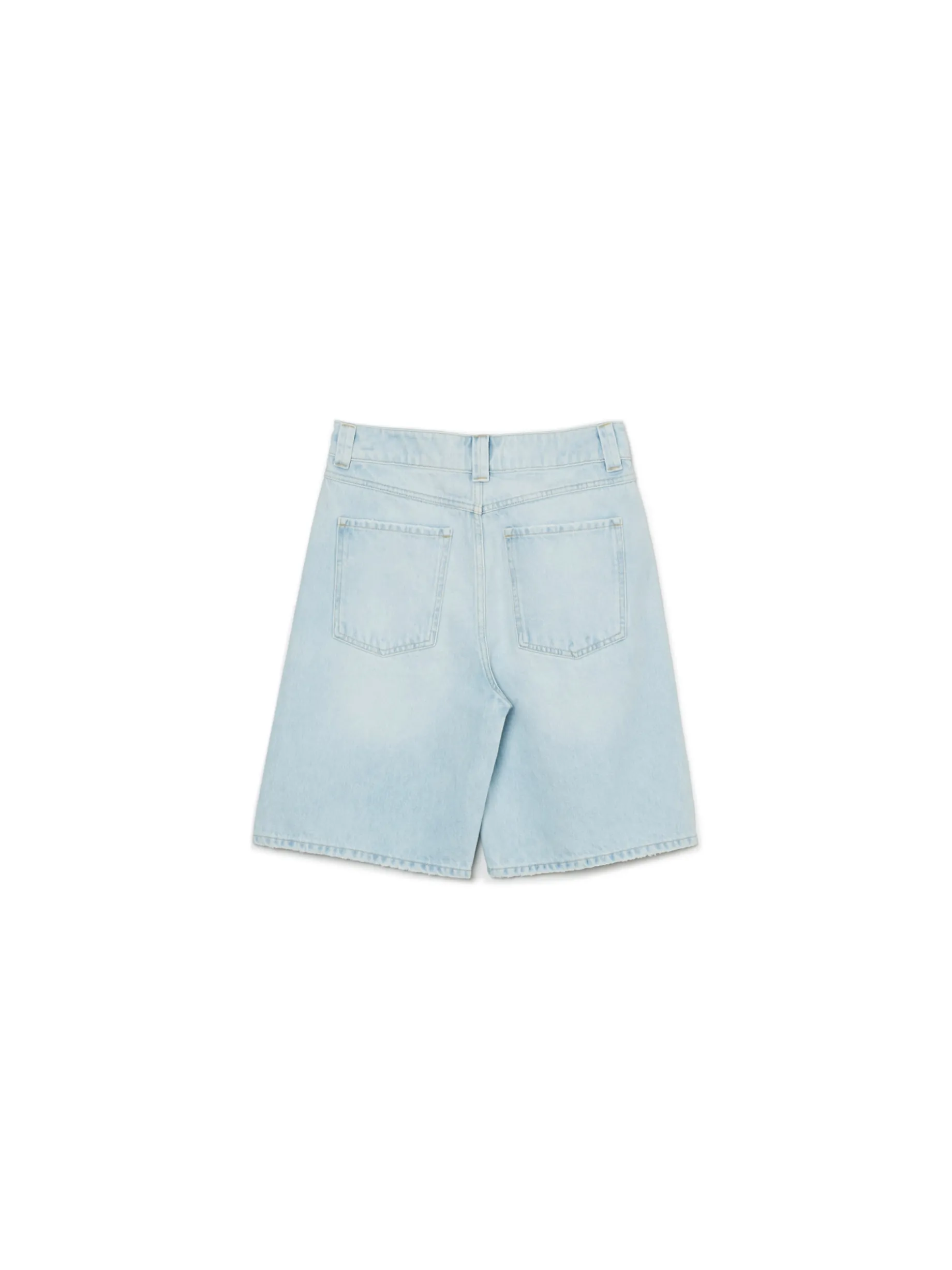 Damskie bermudy w jasnym odcieniu jeansowego materiału idealne na letnie dni. Dla balansu denim jest niezbędny… check it! 100% bawełny w składzie jeansowe bermudy o kroju baggy zapinane na zamek i guzik dwie pary kieszeni z przodu i z tyłu modny efekt sprania Wzrost modelki: 172 cm