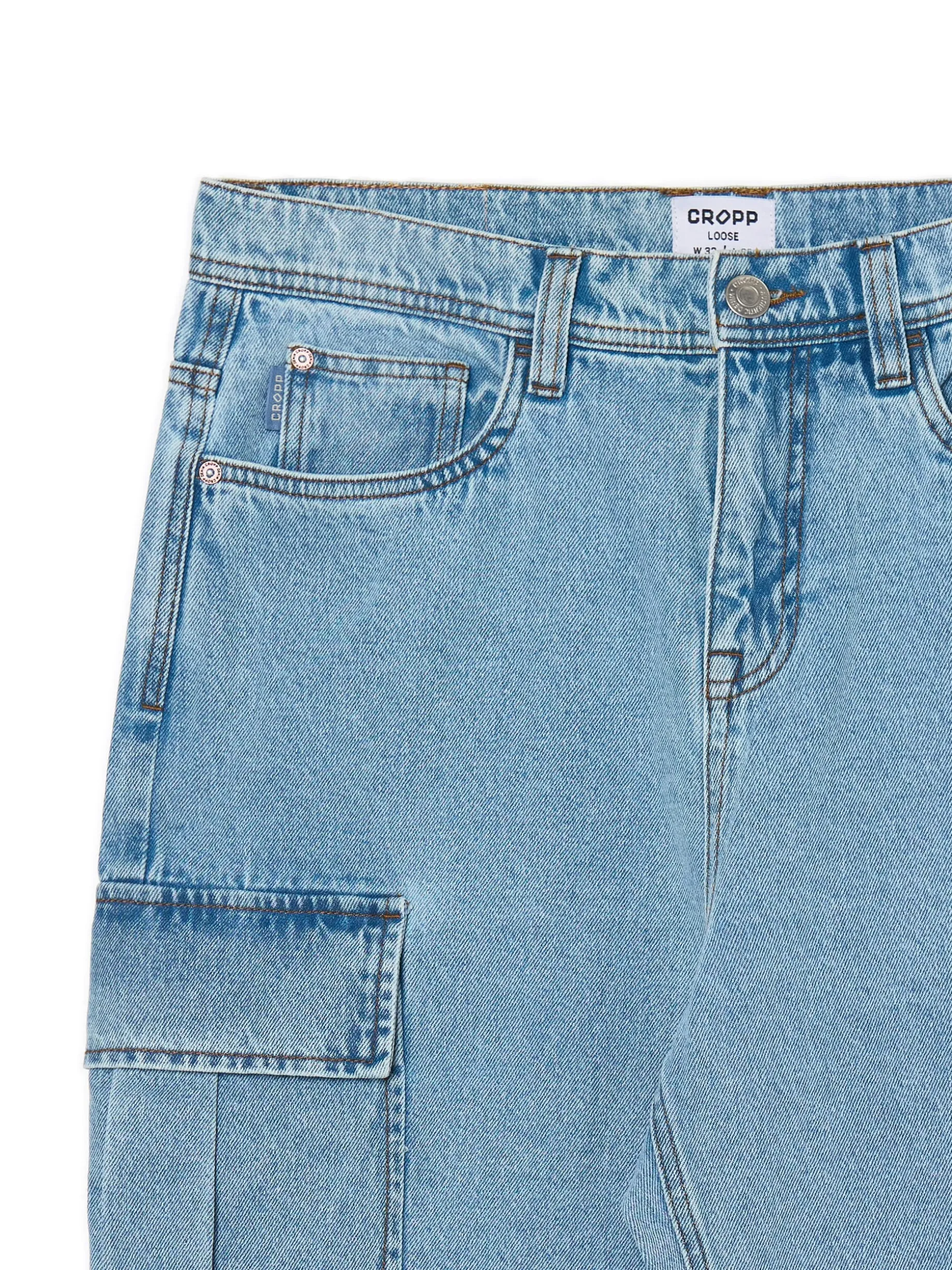 Jasnoniebieskie męskie spodnie jeansowe o kroju loose, uszyte z bawełny. luźny fason zapięcie na zamek i guzik 7 kieszeni, w tym kieszenie typu cargo dostępne w innej wersji kolorystycznej