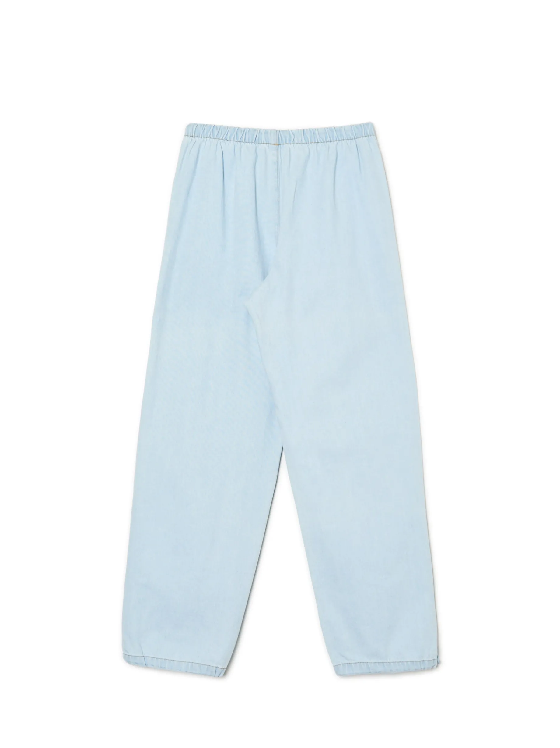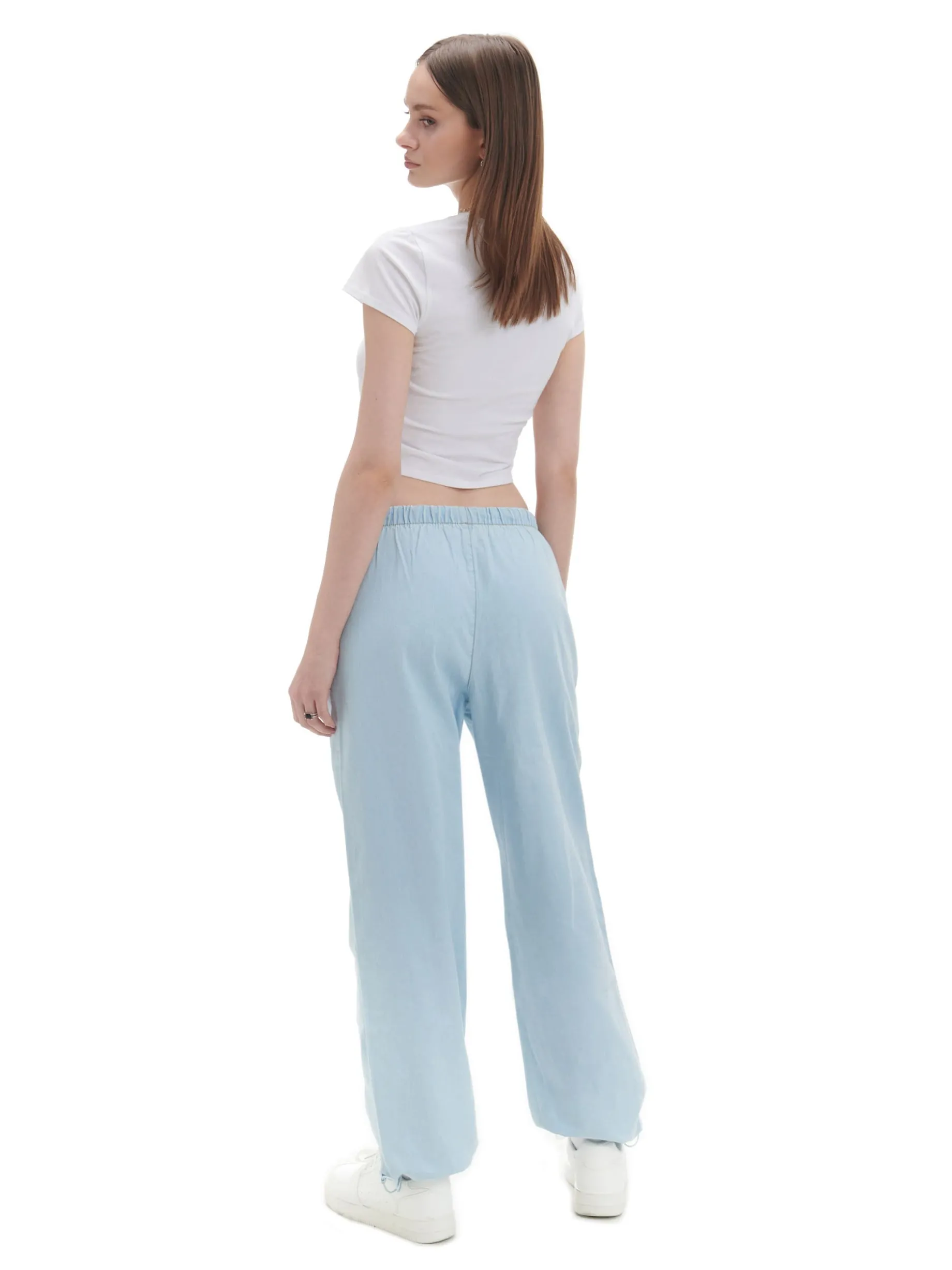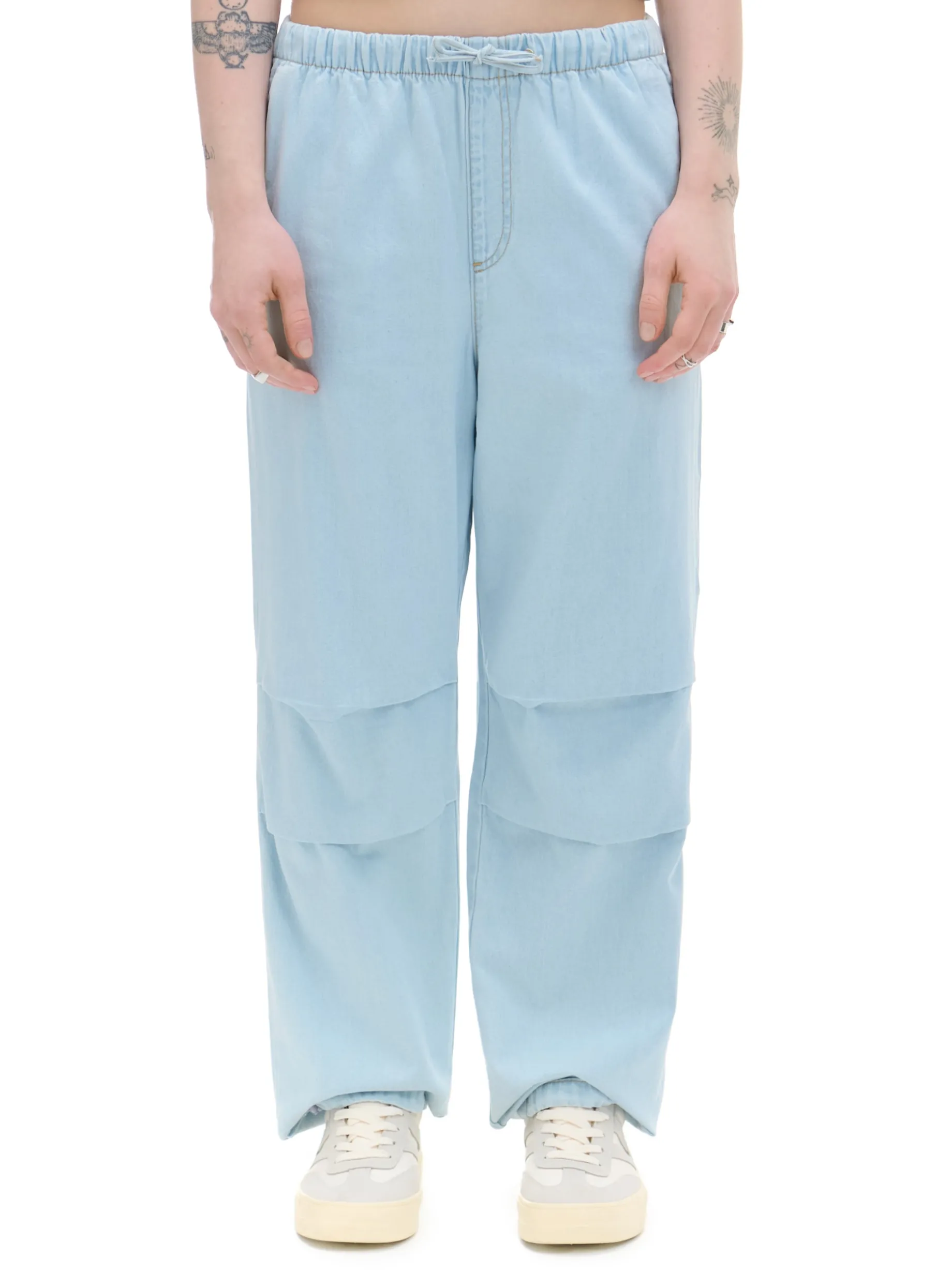 Damskie spodnie jeansowe o swobodnym fasonie parachute, uszyte z bawełny. W pasie gumka i sznurek do regulacji, boczne kieszenie, szeroka nogawka z regulacją u dołu.