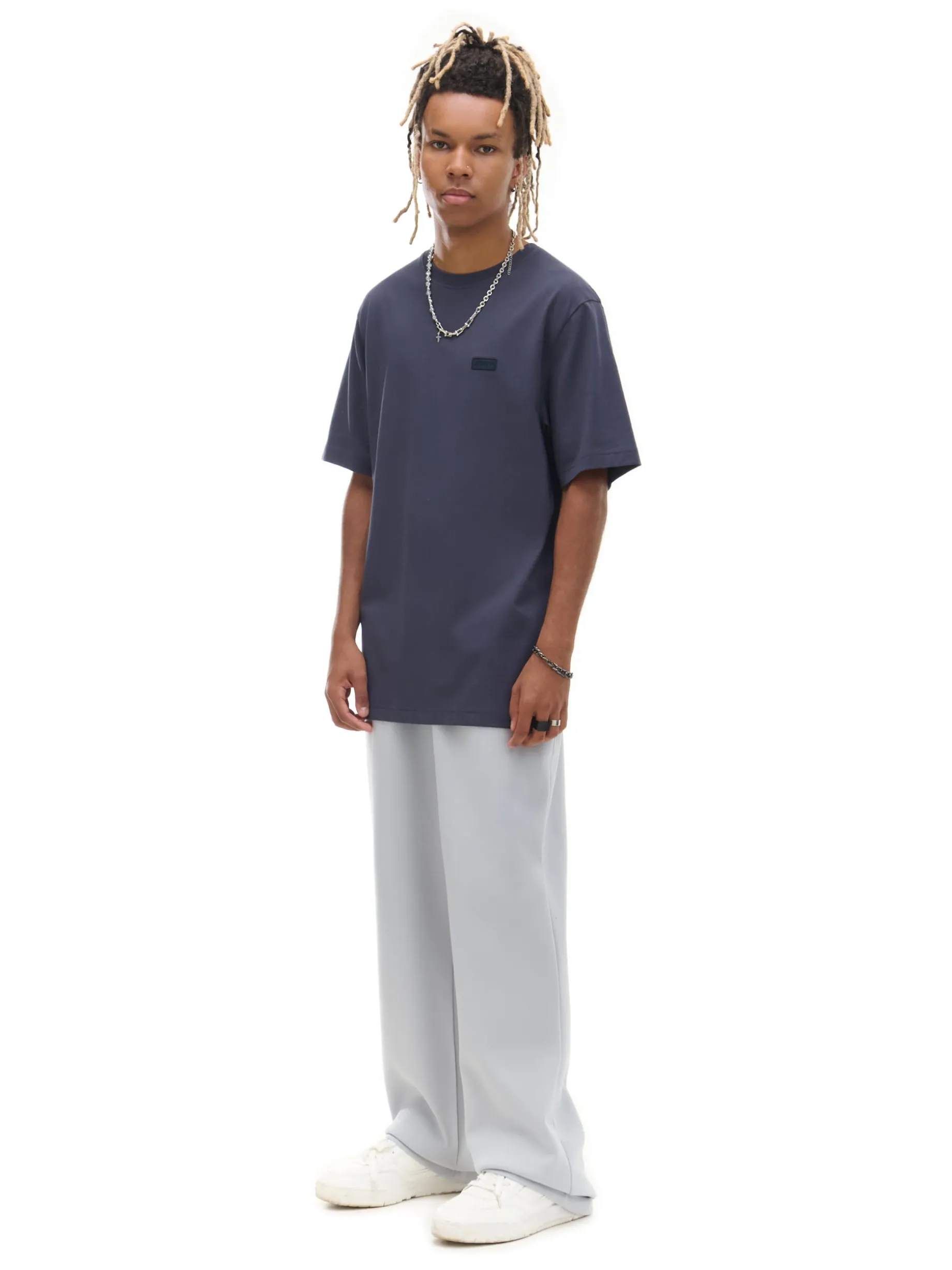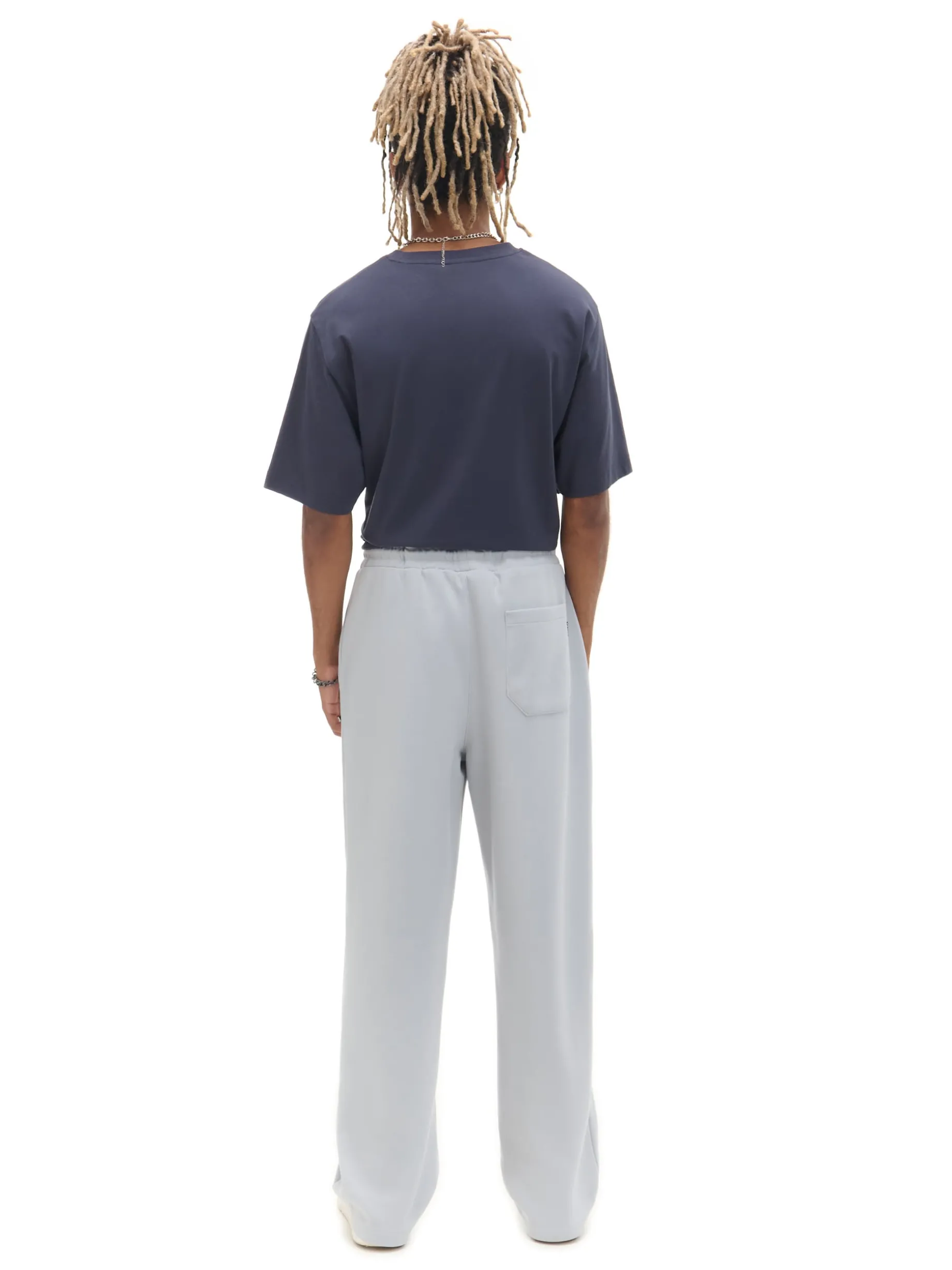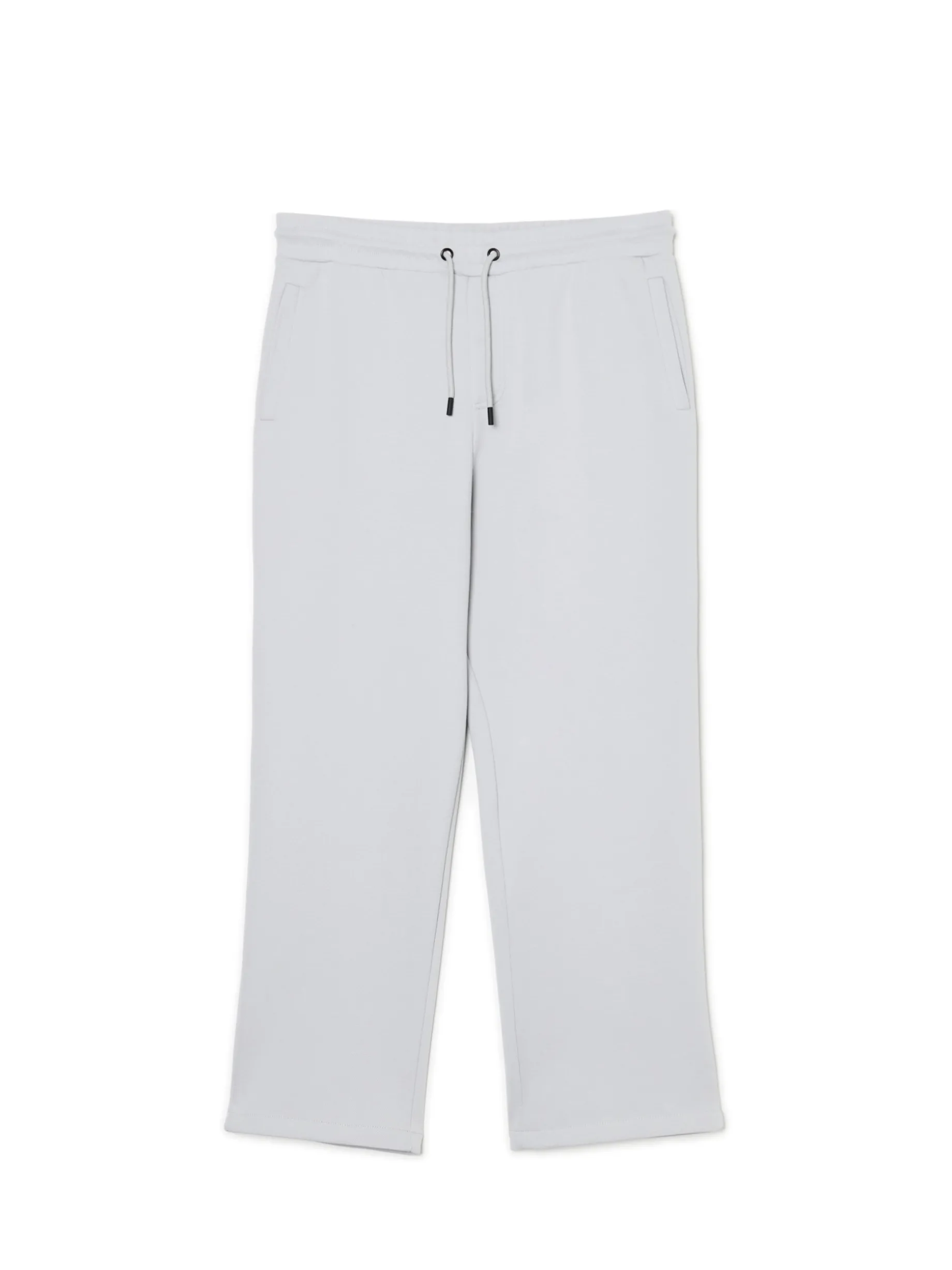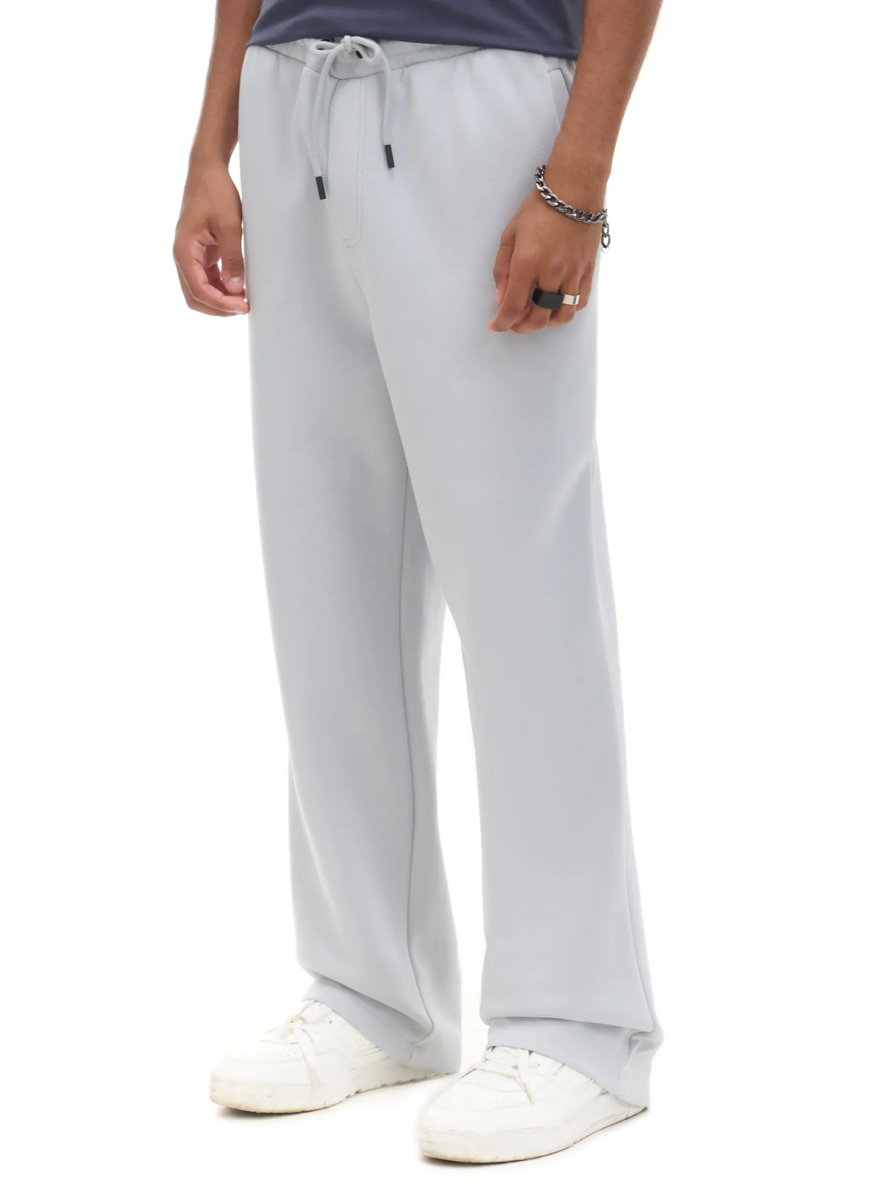 Męskie spodnie uszyte z mieszanki dzianin z bawełną i elastycznych włókien w odcieniu szarości. Item, który warto mieć w swojej szafie! dzianinowy materiał z bawełną swobodny, luźny krój gumka w pasie ze sznurkiem do regulacji otwarte kieszenie po bokach naszywana kieszeń z tyłu