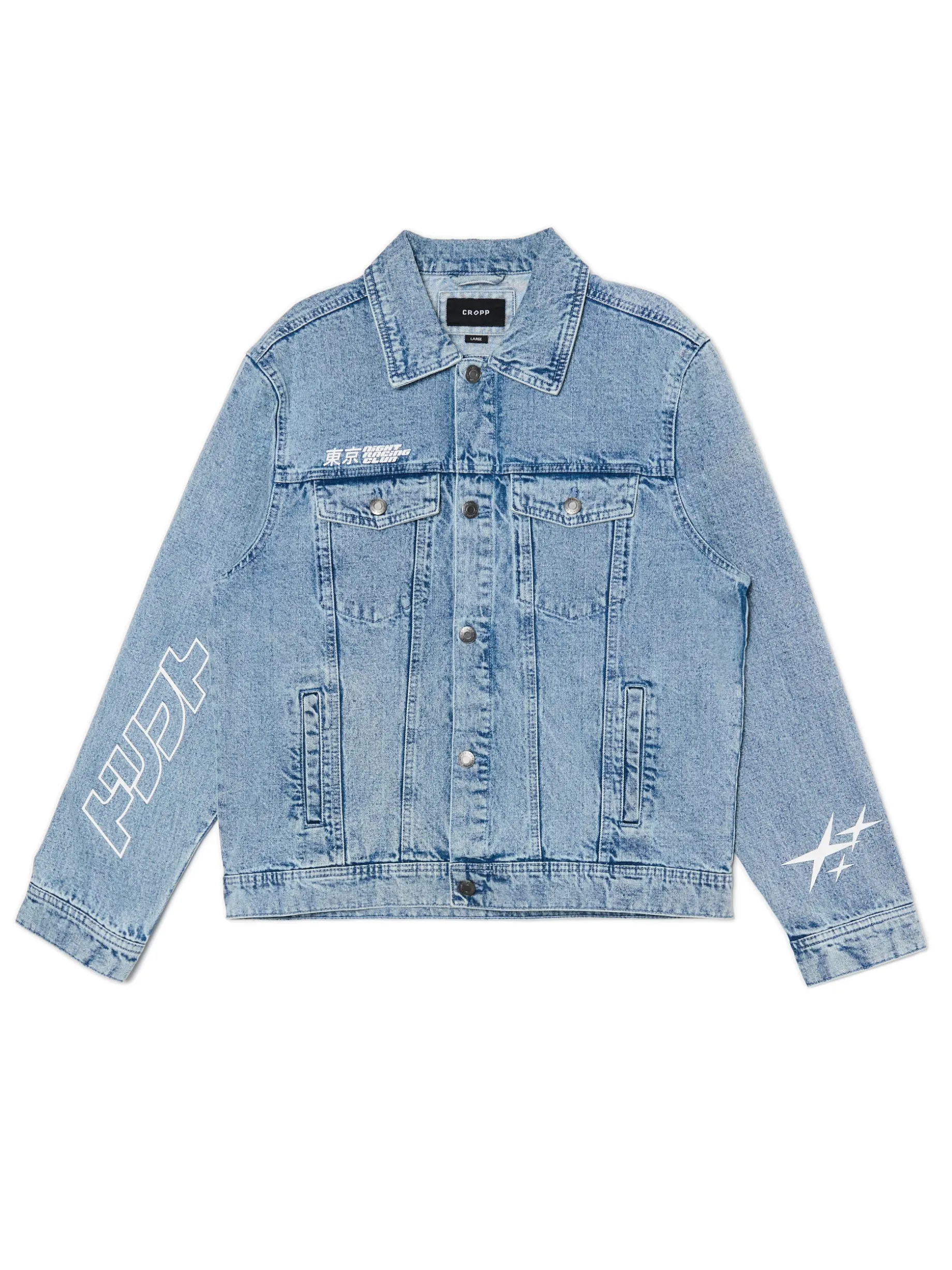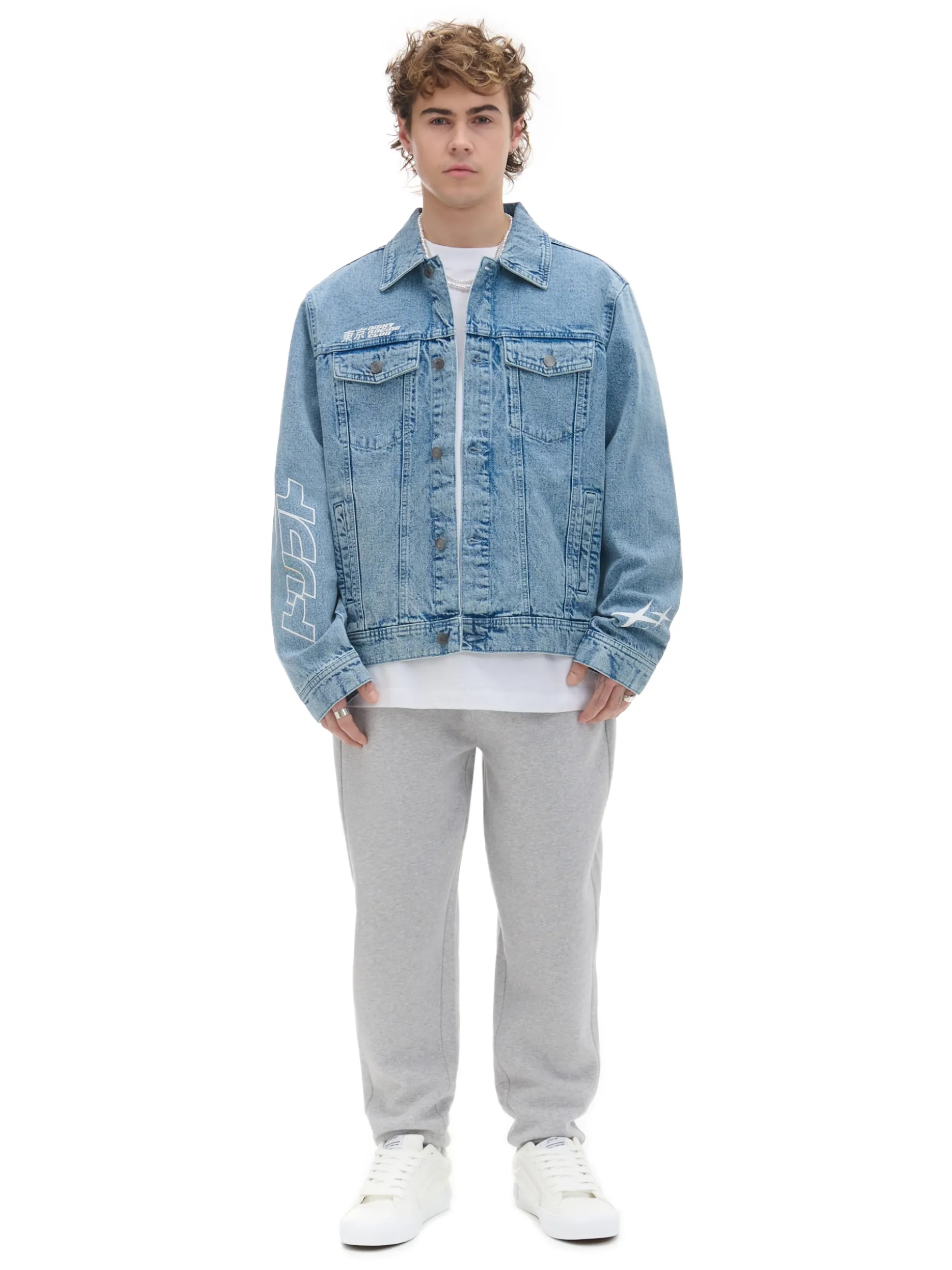 Męska jeansowa kurtka w klasycznym odcieniu denimu i oryginalnymi nadrukami szuka właściciela. uszyta w 100% z bawełny swobodny krój kurtka i mankiety zapinane na guziki 4 kieszenie – para z przodu zapinana na guziki i druga po bokach asymetryczne nadruki z przodu, na plecach i rękawach