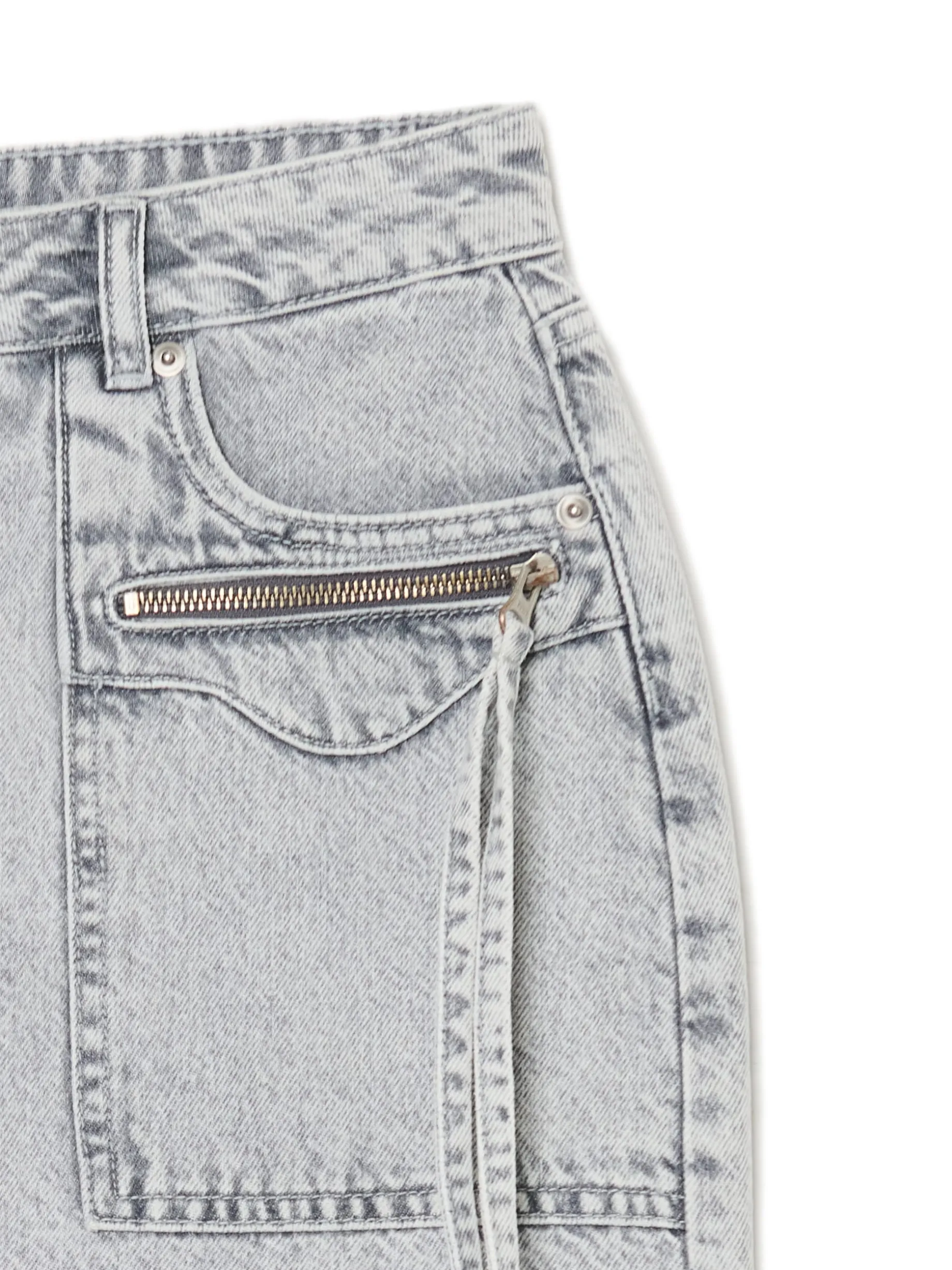 Damska spódnica o długości mini, uszyta z bawełny. Ozdobą tego modelu są frędzle z tego samego materiału przy kieszeniach. denim o szarym odcieniu z delikatnym efektem sprania długość mini zapięcie na zamek i guzik cztery funkcyjne kieszenie, w tym dwie z zapięciem na zamek dwie naszyte kieszenie tylnie surowe wykończenie brzegów ozdobne frędzle przy zamkach Wzrost modelki: 172 cm