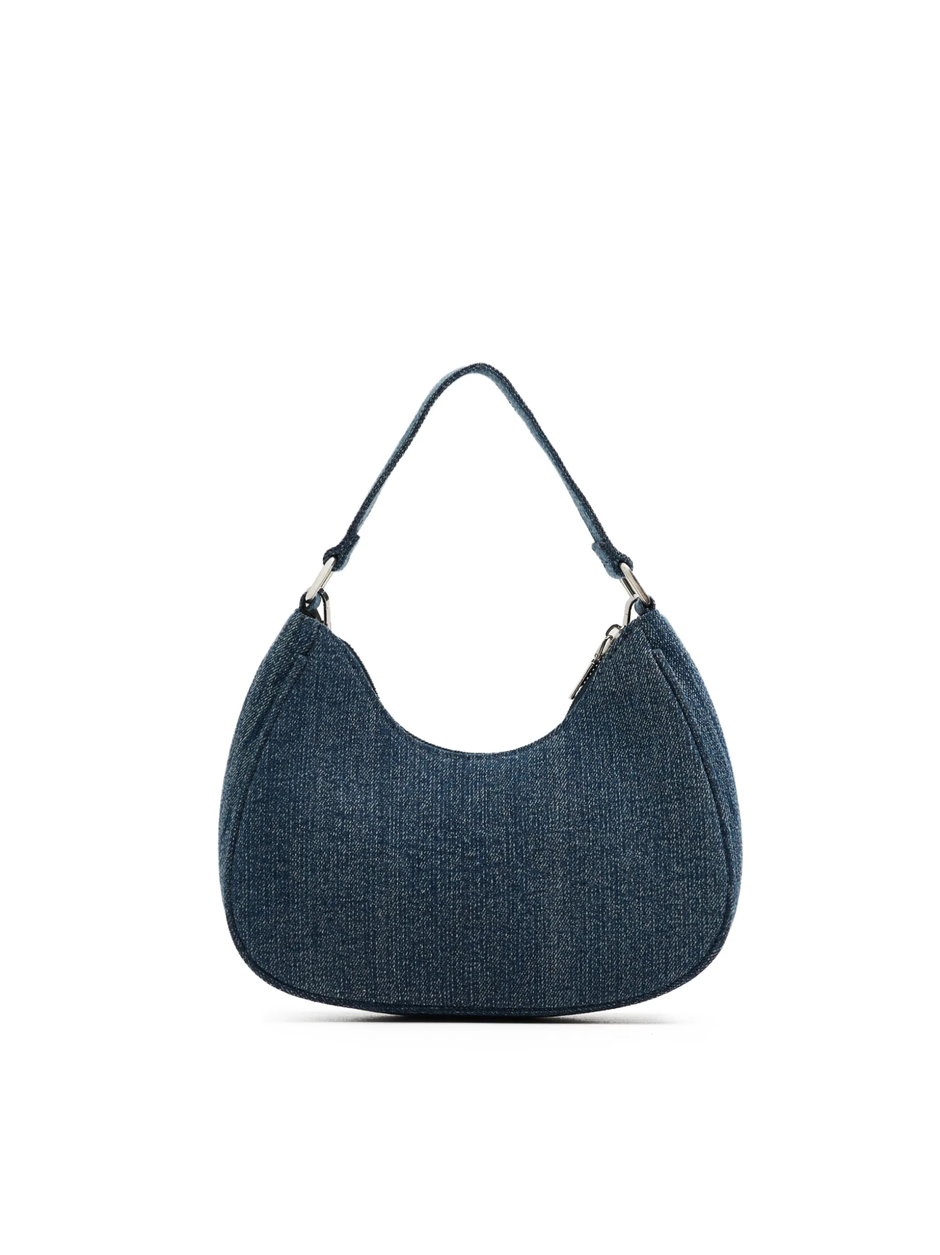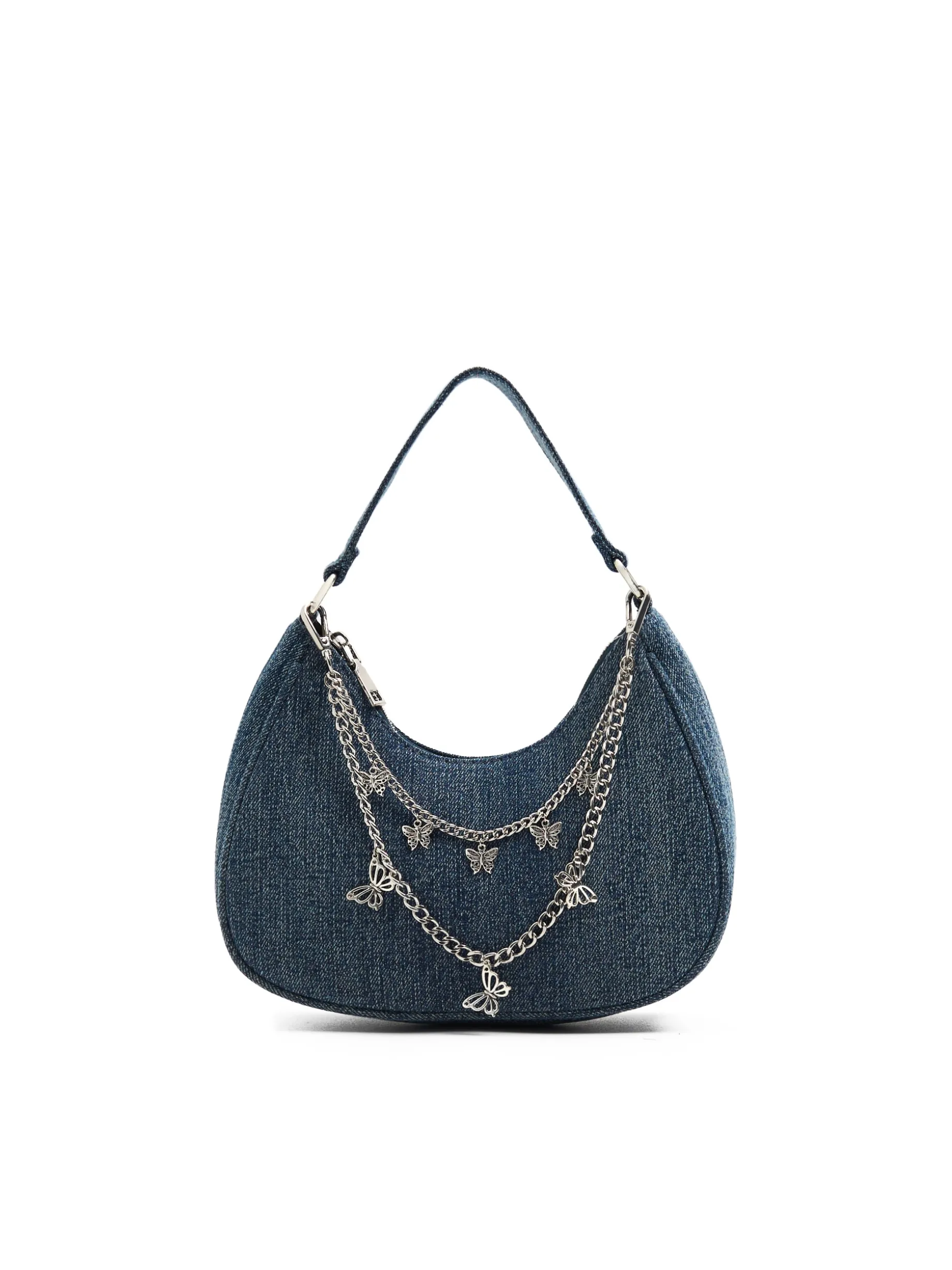 Niewielka damska torebka na ramię, uszyta z grantowego materiału imitującego jeans. Idealna dla fanek Y2K! krótki pasek na ramię zapięcie na suwak w środku dodatkowa kieszonka, zapinana na suwak podwójny odczepiany łańcuch z zawieszkami w kształcie motylków Wymiary produktu: 20 x 25 cm