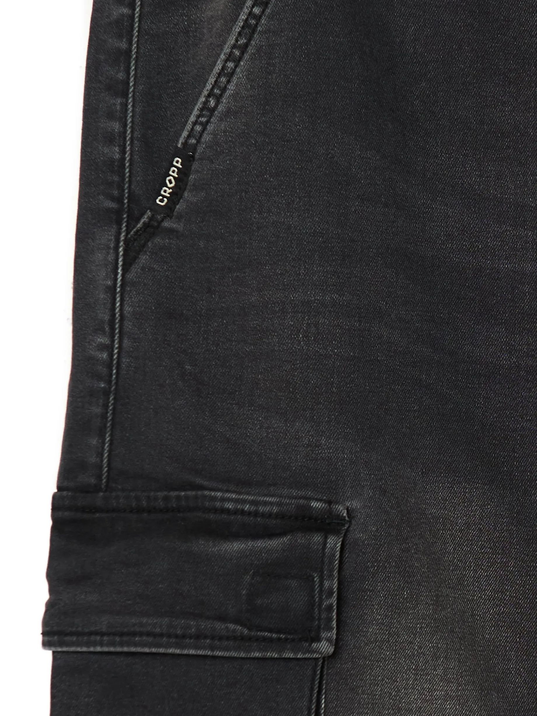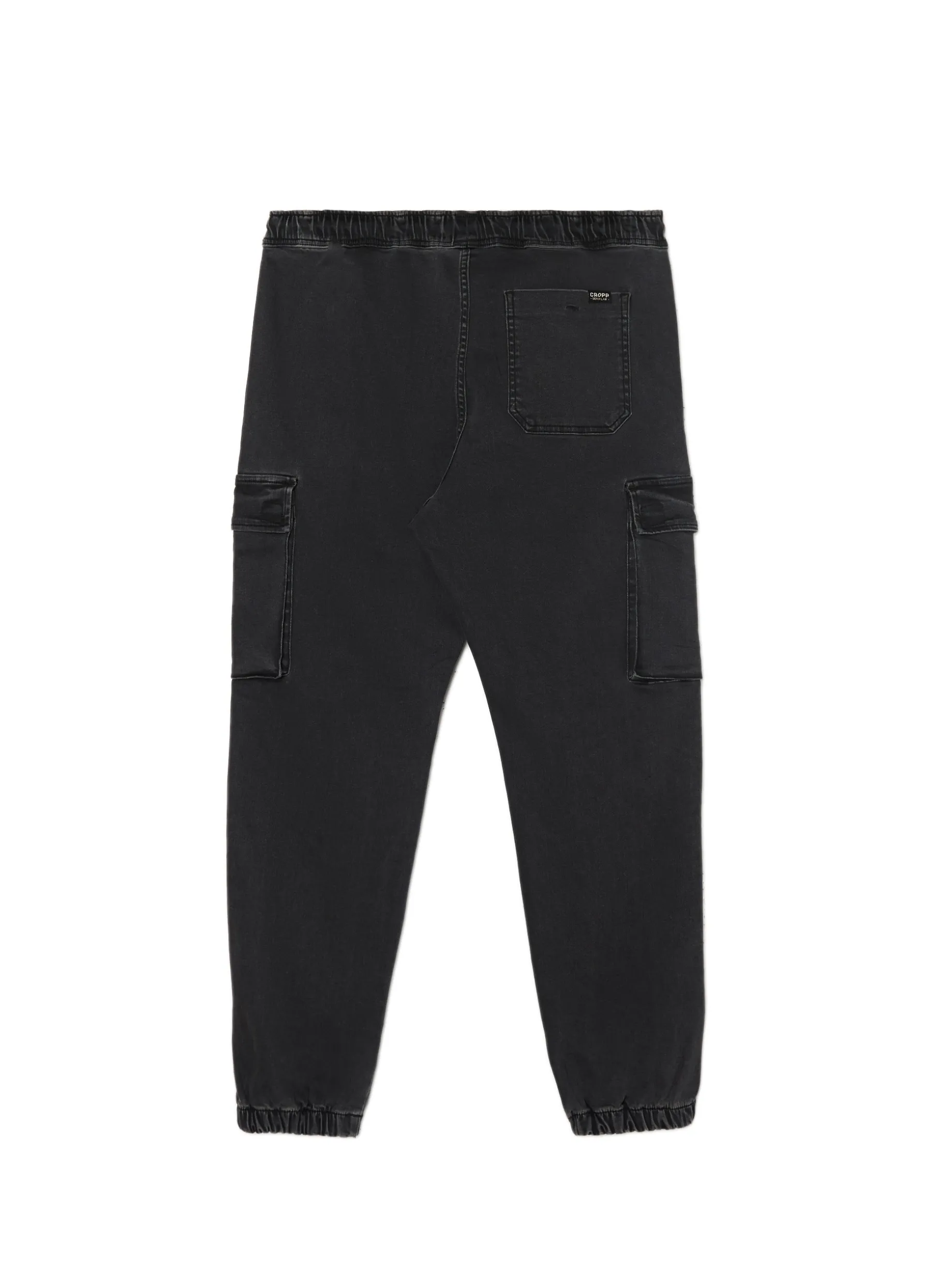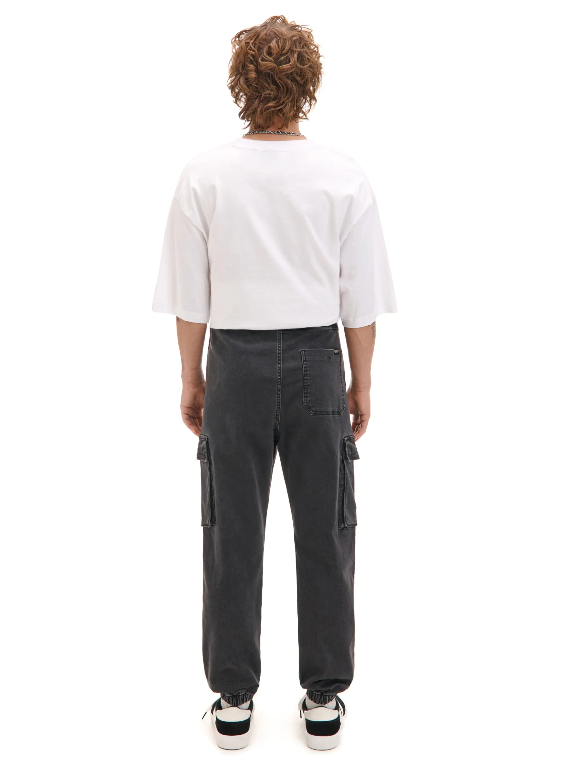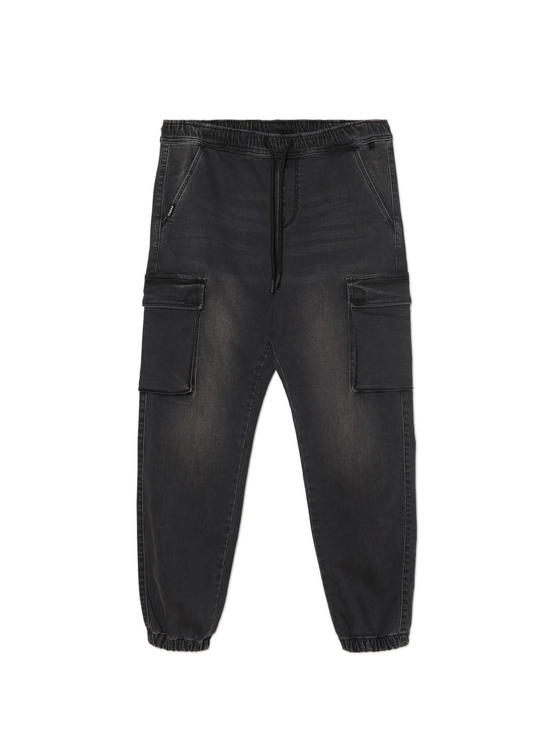 Jeansowe ciemnoszare spodnie męskie o kroju jogger, uszyte z bawełny z dodatkiem elastanu. w pasie gumka i sznurek do regulacji 5 kieszeni, w tym kieszenie typu cargo nogawka ze ściągaczem jeansy dostępne w innej wersji kolorystycznej