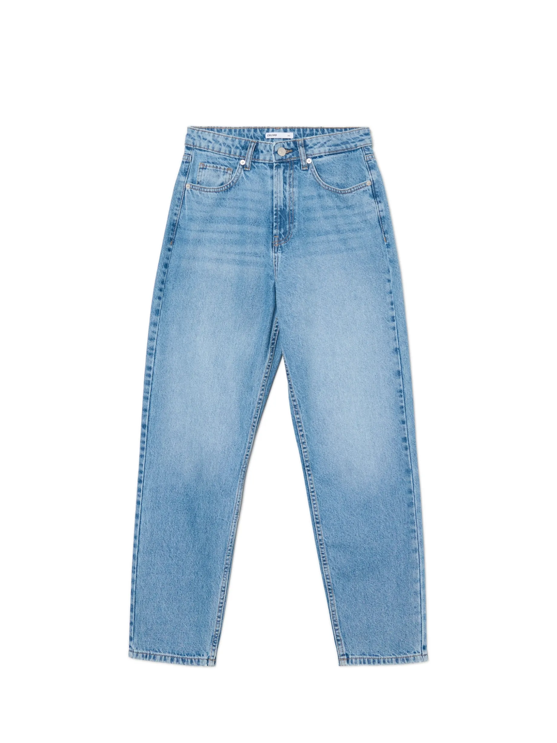 Damskie spodnie jeansowe o kroju mom, uszyte z bawełnianej tkaniny. Klasyk, który warto mieć w swojej szafie! 100% bawełny fason typu mom zapięcie na zamek i guzik pięć kieszeni szlufki na pasek blisko siebie