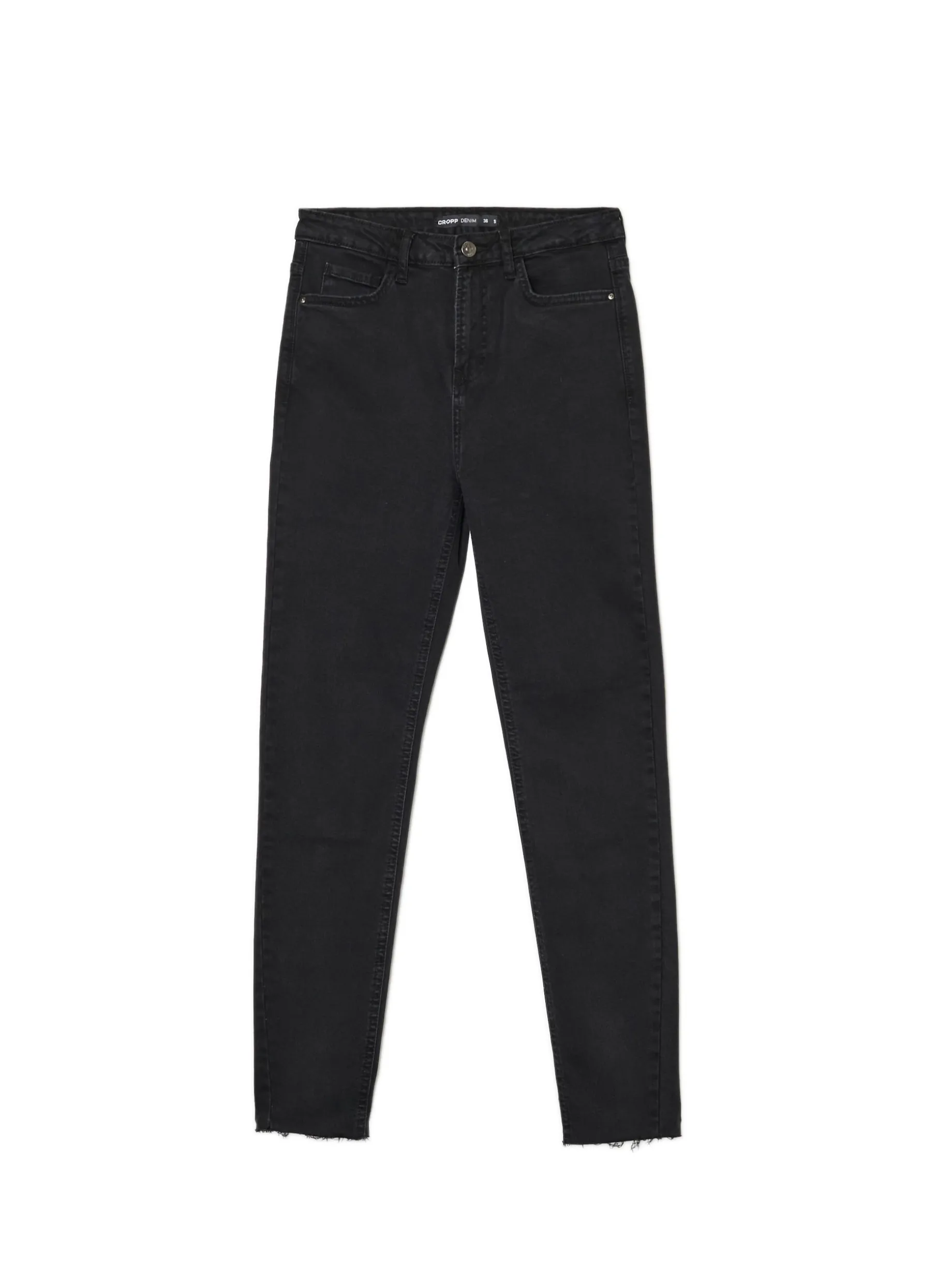 Damskie spodnie jeansowe typu skinny, uszyte z bawełnianej tkaniny z dodatkiem elastycznych włókien. To surowe wykończenie nogawek fituje z casualowymi stylizacjami. denimowe spodnie typu skinny zapięcie na zamek i guzik pięć kieszeni szlufki na pasek ozdobne przetarcia i postrzępienia surowe wykończenie brzegów