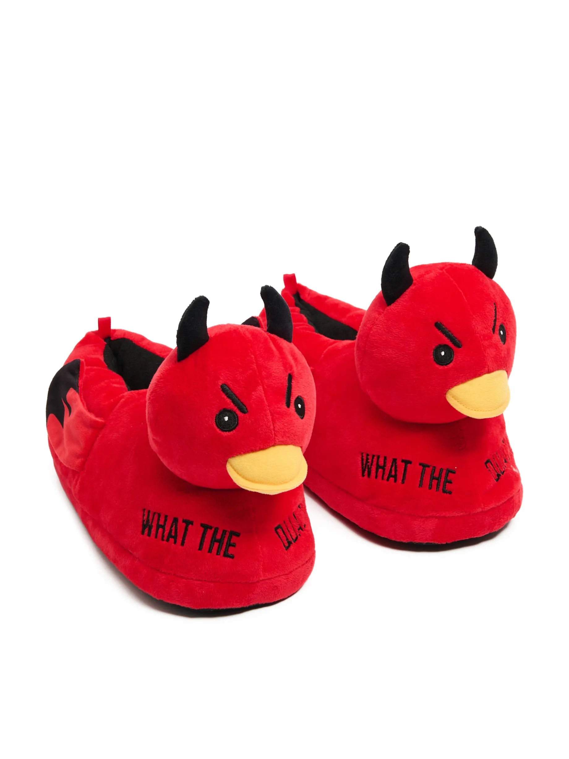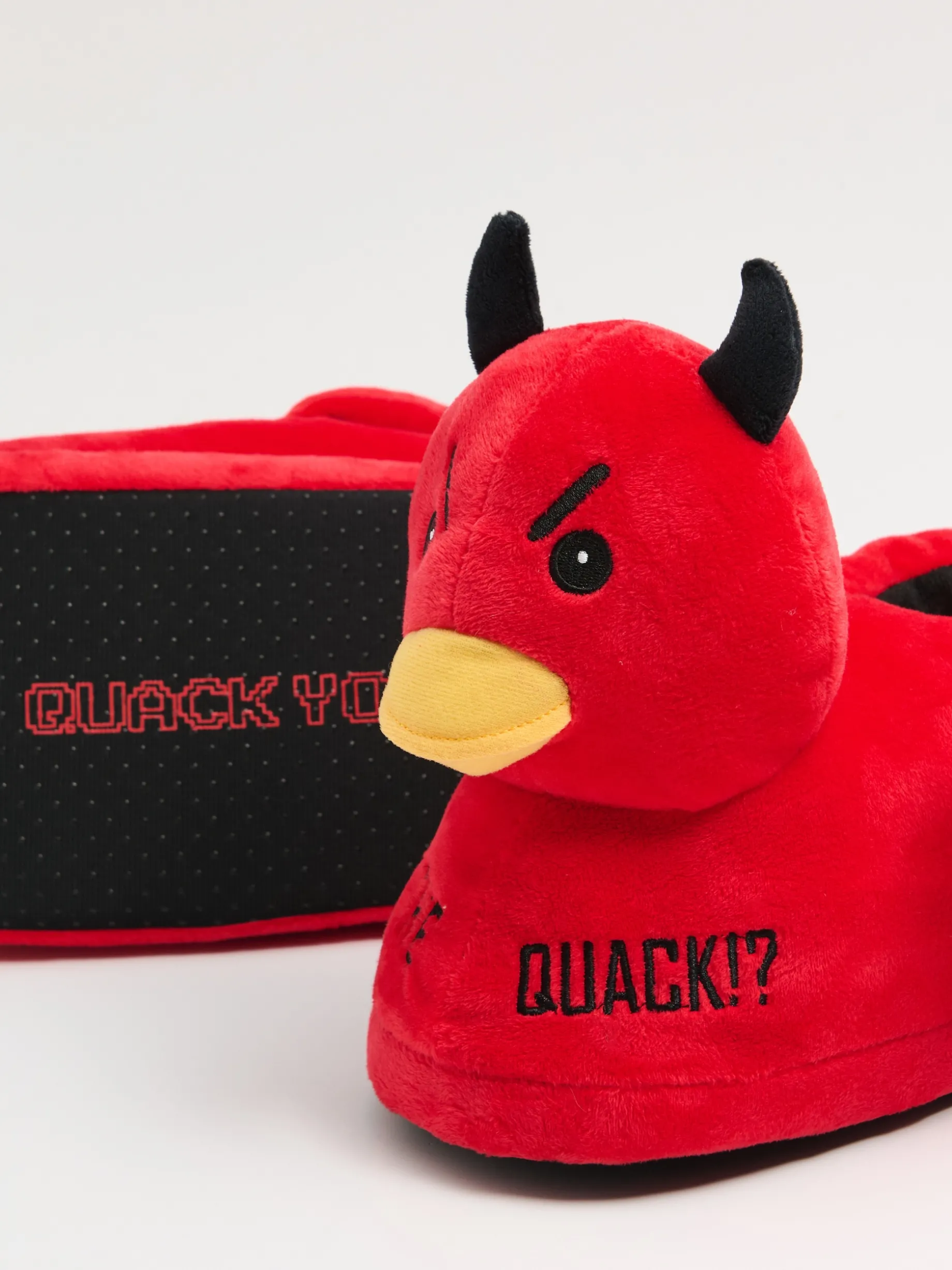 Zastanawiasz się what the quack? Nie musisz nic mówić, wystarczy, że założysz te męskie domowe kapcie w kształcie diabelskich kaczek. Uszyte z miękkiej w dotyku, gładkiej dzianiny w kolorze czerwonym. Idealny item podczas: chillowania na kanapie grania na kompie podkradania snacków