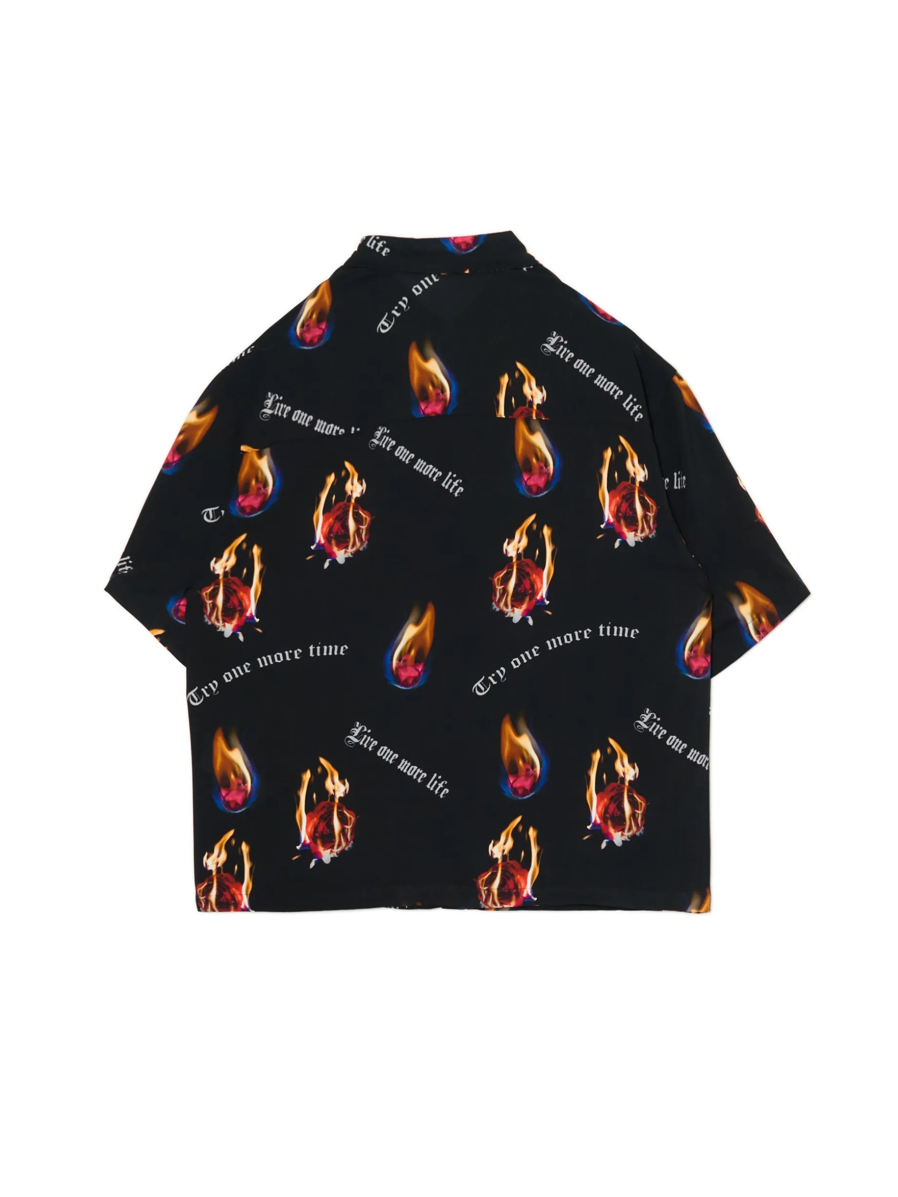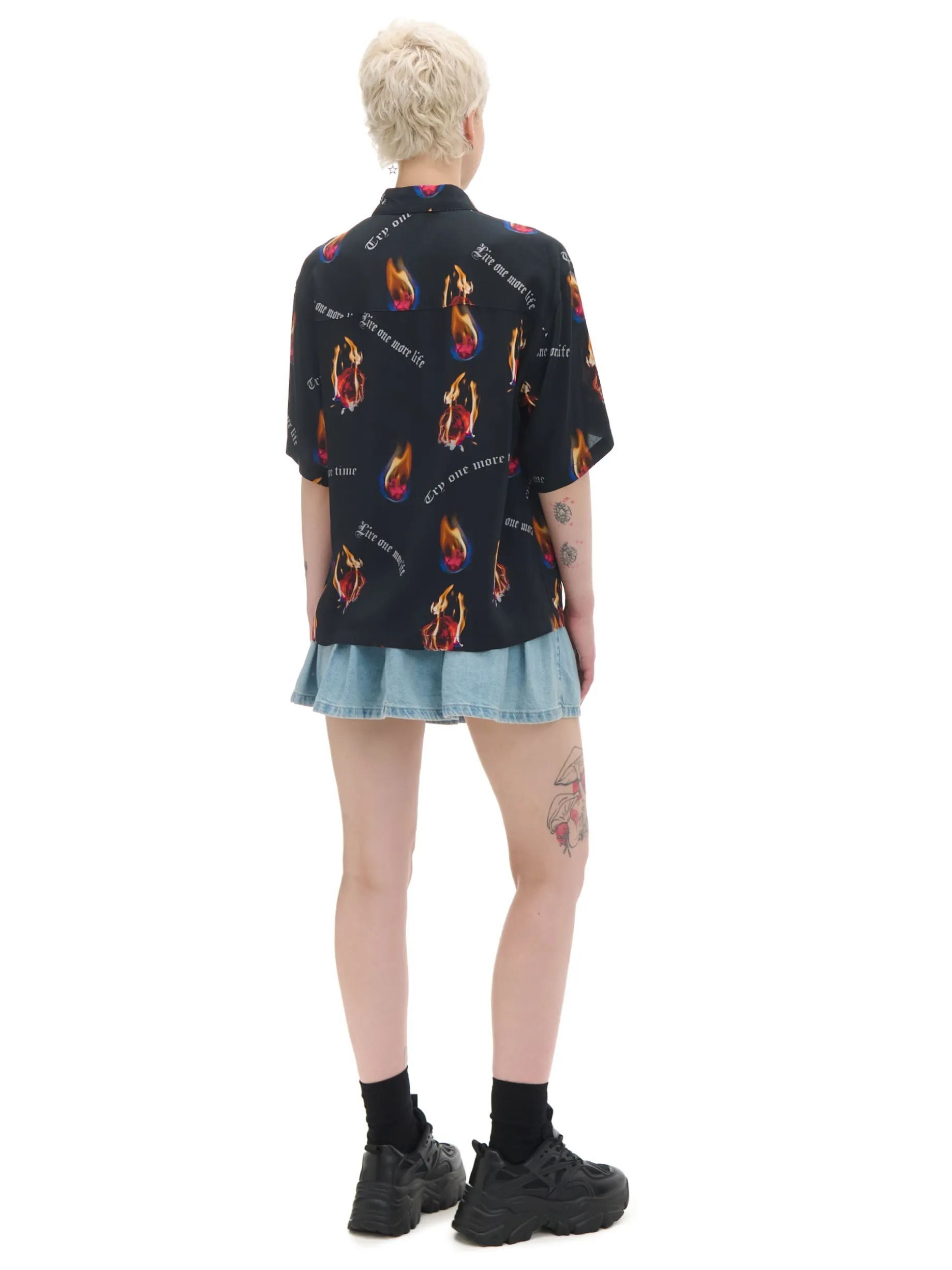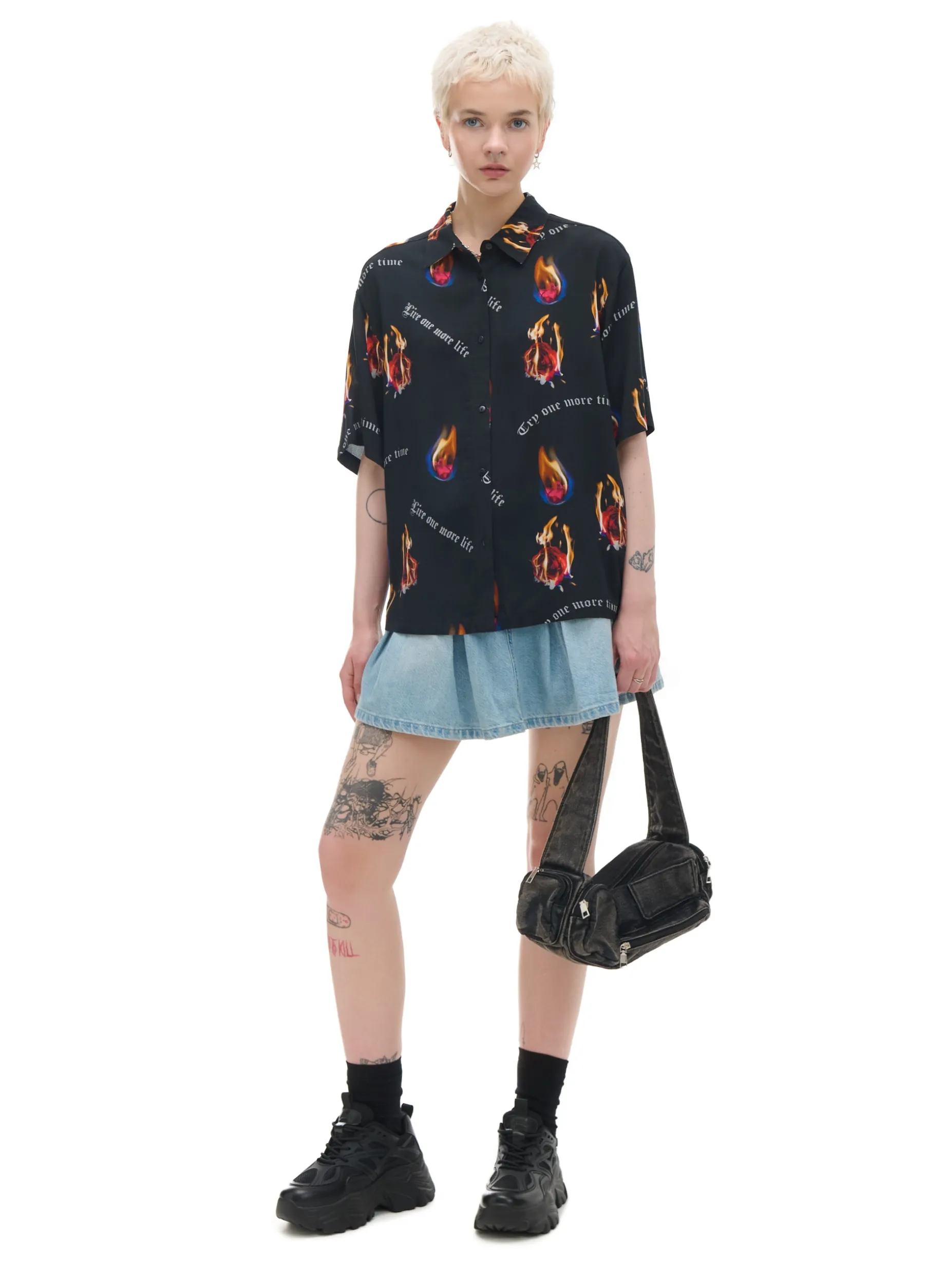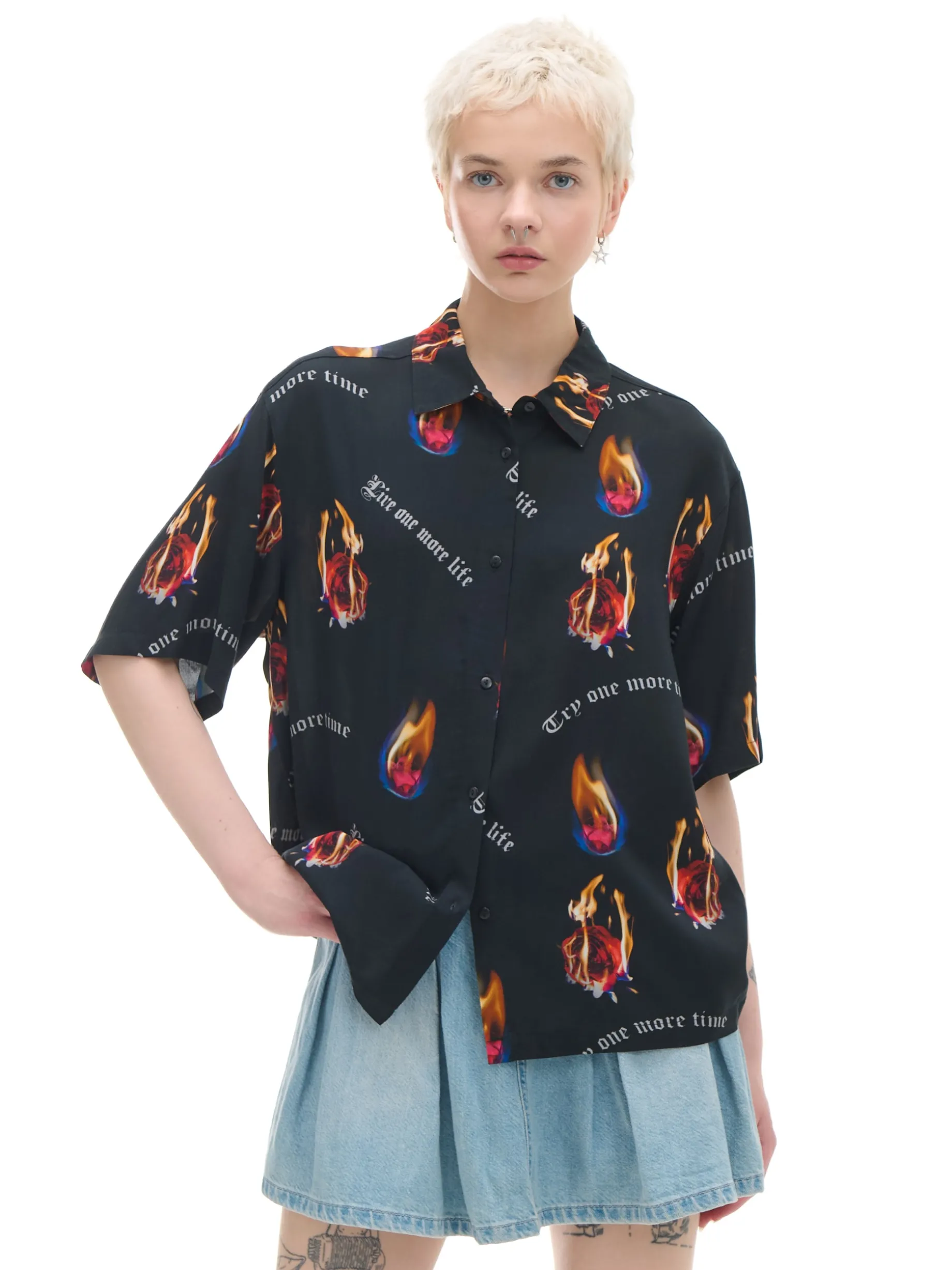 Damska koszula uszyta w 100% z wiskozy w typie shacket (shirt & jacket). Ozdobę stanowi nadruk z płonącymi różami i motywacyjnymi sentencjami.