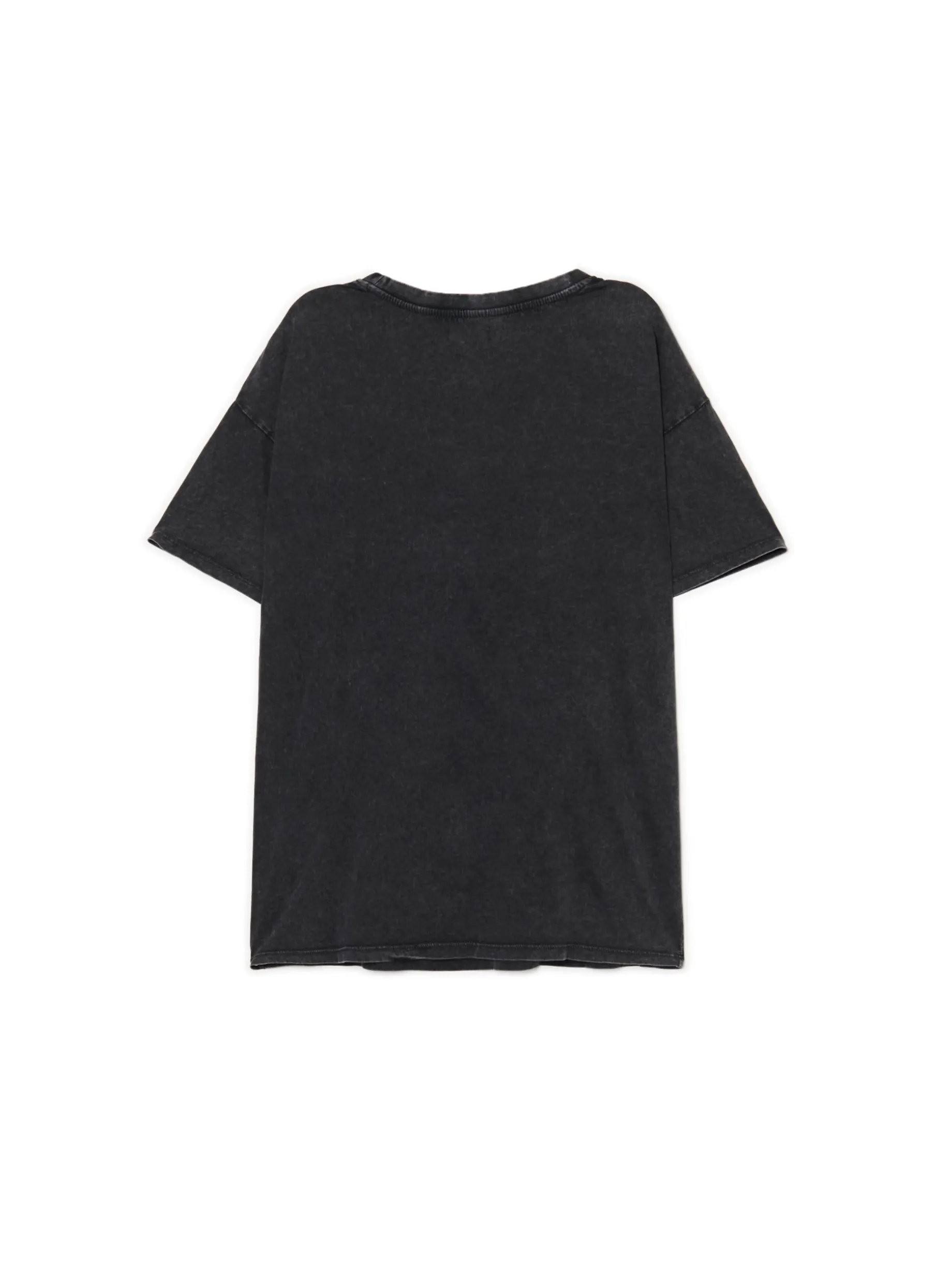 Damski T-shirt uszyty z bawełnianego materiału w kolorze czarnym z efektem sprania i dużym nadrukiem z przodu. Wrzuć wisienkę do koszyka! 100% bawełny krój oversize krótkie, swobodne rękawy oryginalny print
