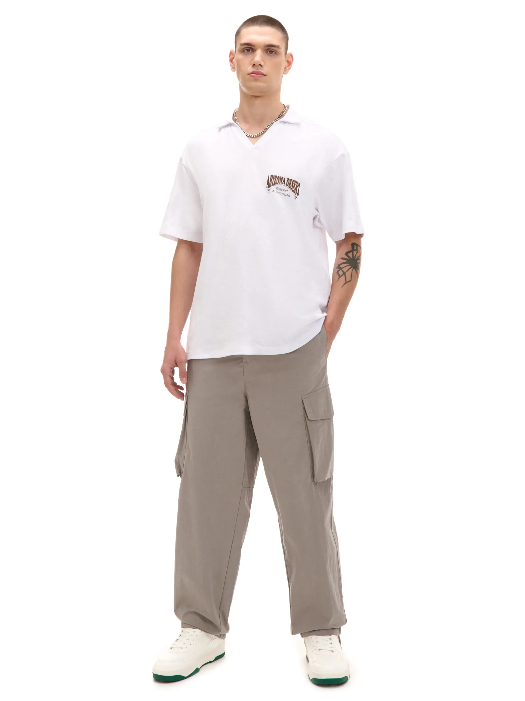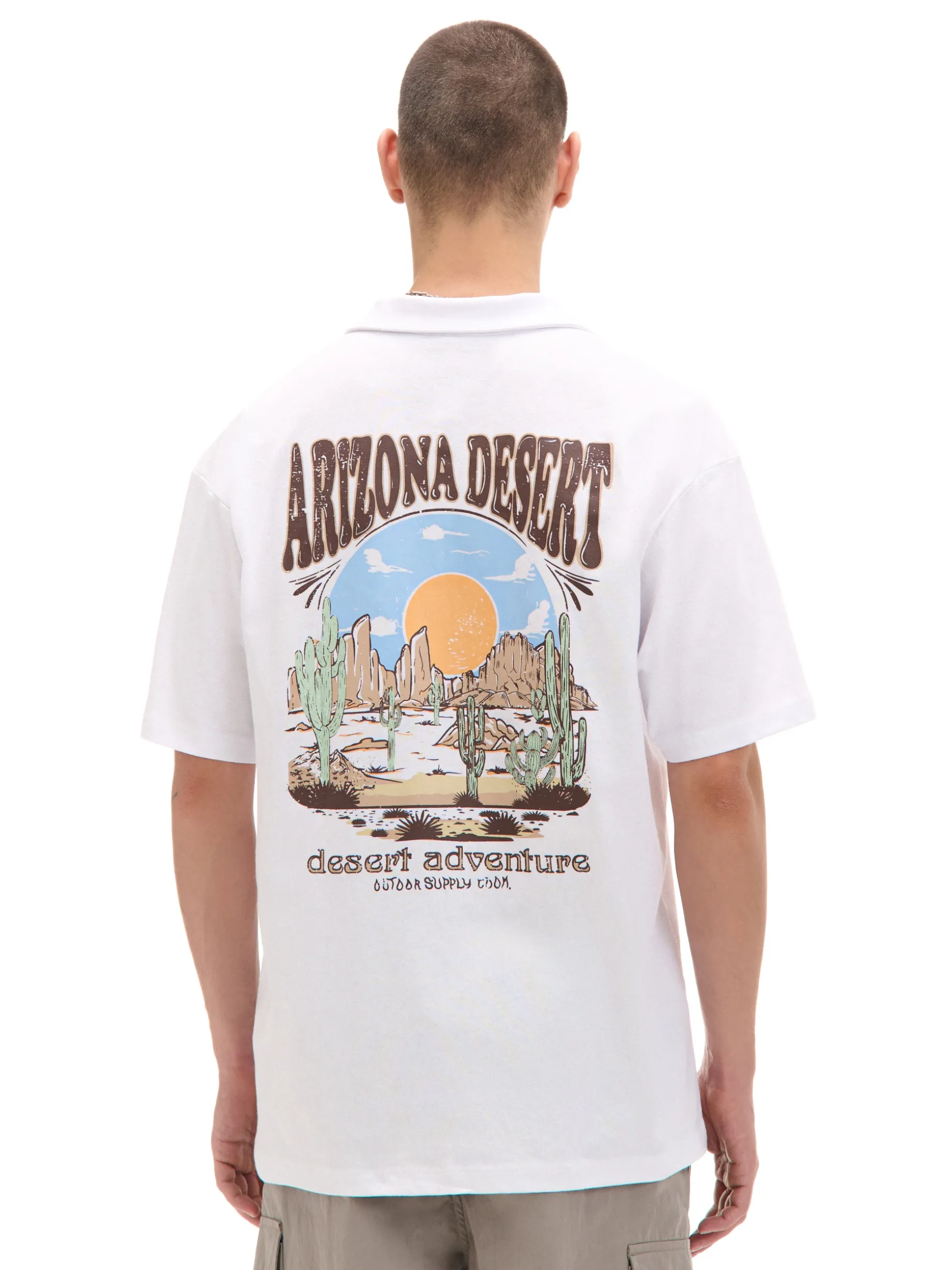 T-shirt męski typu polo uszyty z bawełnianej dzianiny w kolorze białym. Po obu stronach kolorowe nadruki nawiązujące do pustynnych obszarów Arizony. 100% bawełny wygodny krój comfort klasyczny kołnierzyk polo krótkie, ścięte rękawy delikatnie obniżona linia ramion mały nadruk na piersi, duży nadruk na plecach