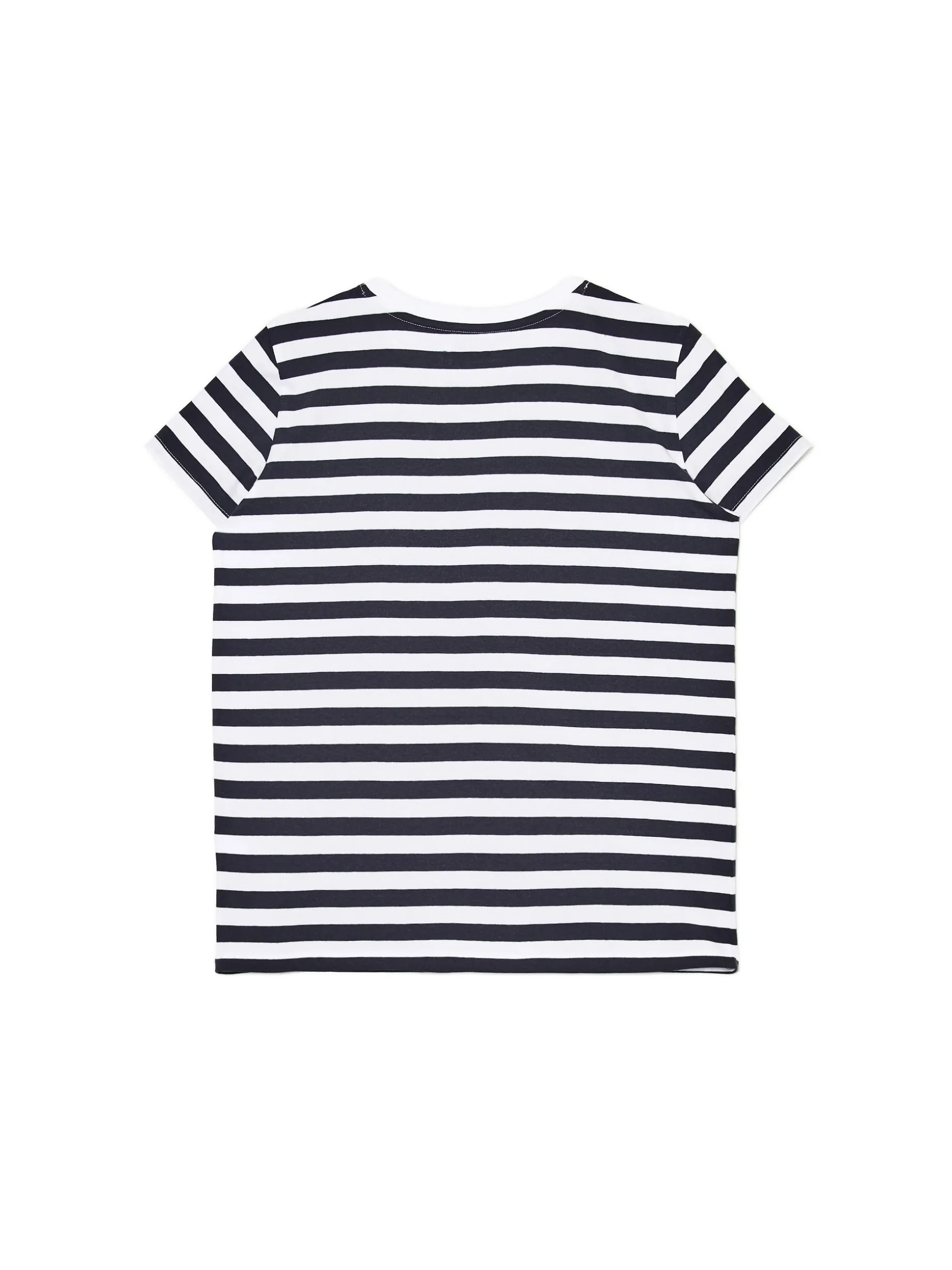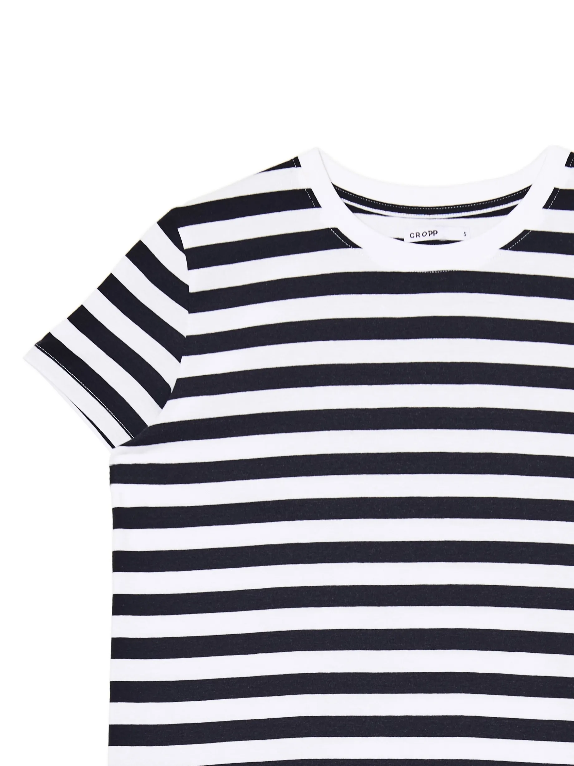 Damska koszulka o regularnym kroju, uszyta w 100% z bawełny. Na całości wzór w poziome czarno-białe paski. Wzrost modelki: 168 cm