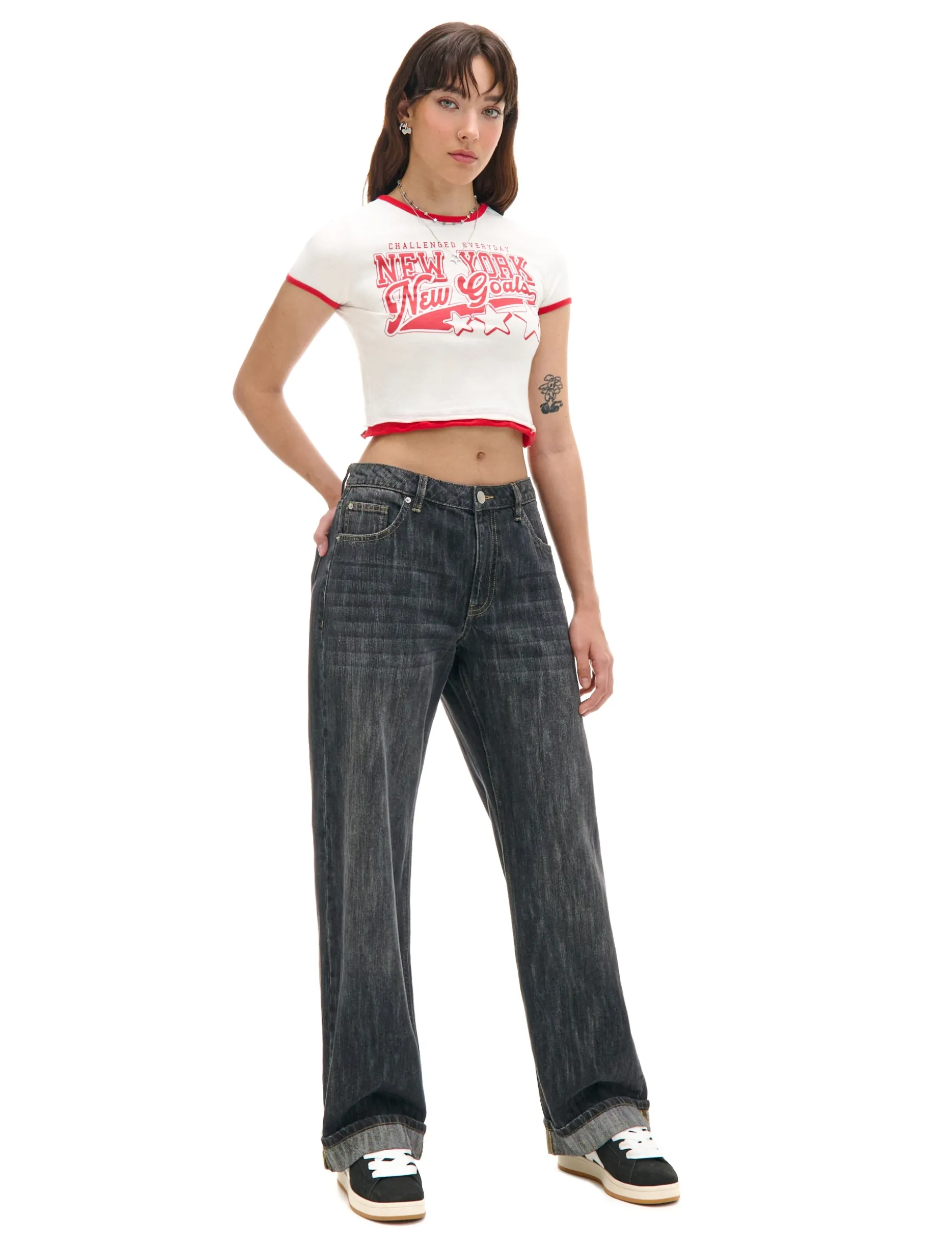 Koszulka damska o dopasowanym kroju, uszyta z elastycznej mieszanki dzianin. Ten model z surowym wykończeniem brzegów i kontrastowym nadrukiem wyróżni Cię w tłumie. bawełna z dodatkiem elastycznych włókien dopasowany krój podkreślający sylwetkę okrągły dekolt krótkie, swobodne rękawy kontrastowe wykończenie lamówką surowe wykończenie brzegów duży nadruk z przodu