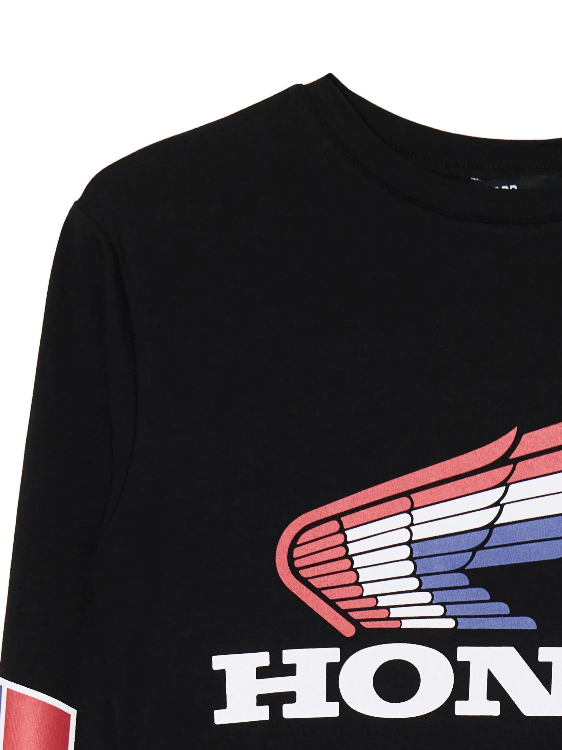 Czarna damska koszulka z długim rękawem uszyta z bawełny z domieszką elastycznych włókien. Wyobraź sobie siebie w tym efektownym outficie. Idealny match! dzianina z domieszką elastycznych włókien dopasowany krój podkreślający sylwetkę półokrągły dekolt z lamówką długie, dopasowane rękawy kolorowe nadruki z Honda Racing na przodzie i rękawach Wzrost modelki: 172 cm