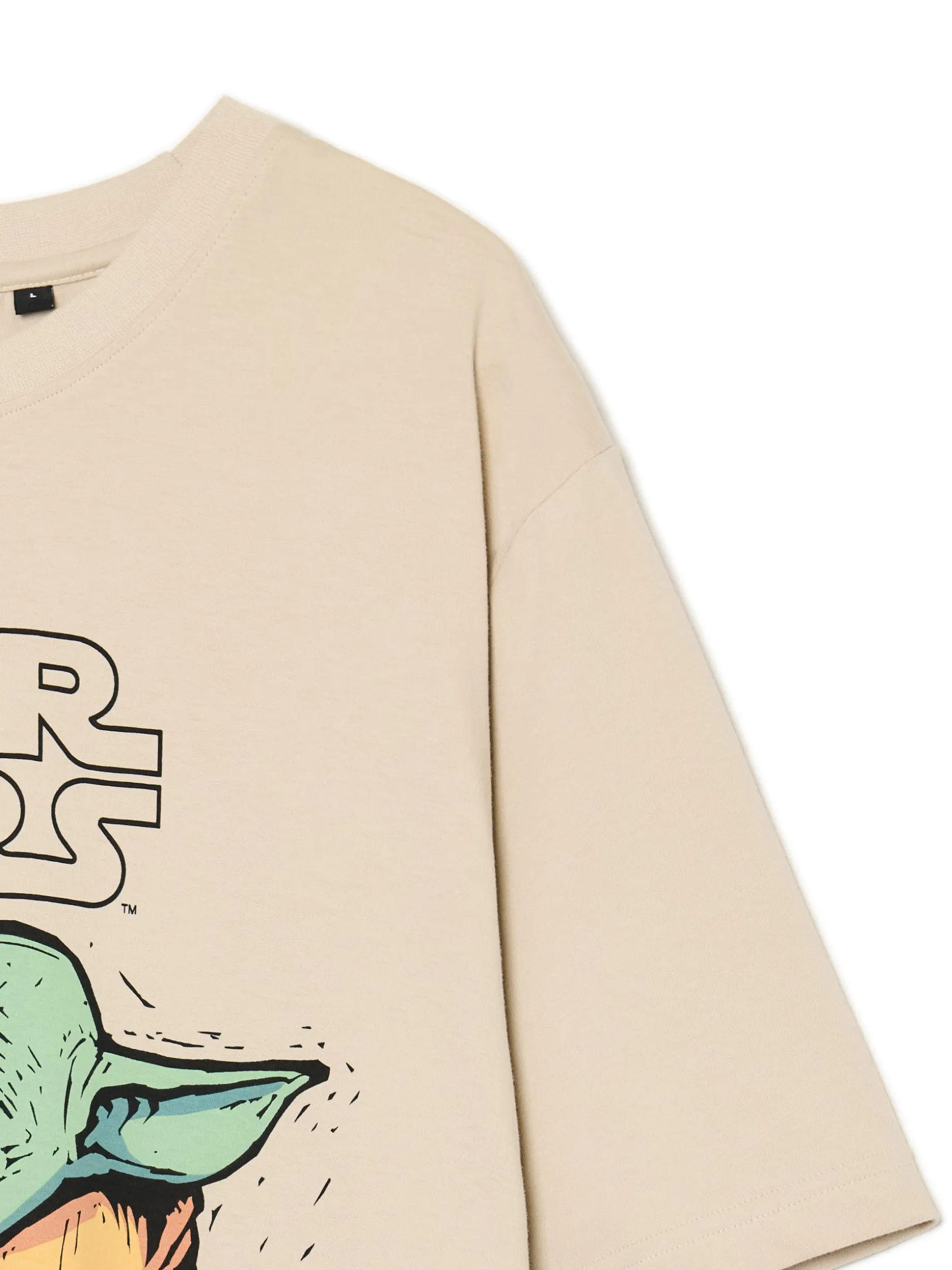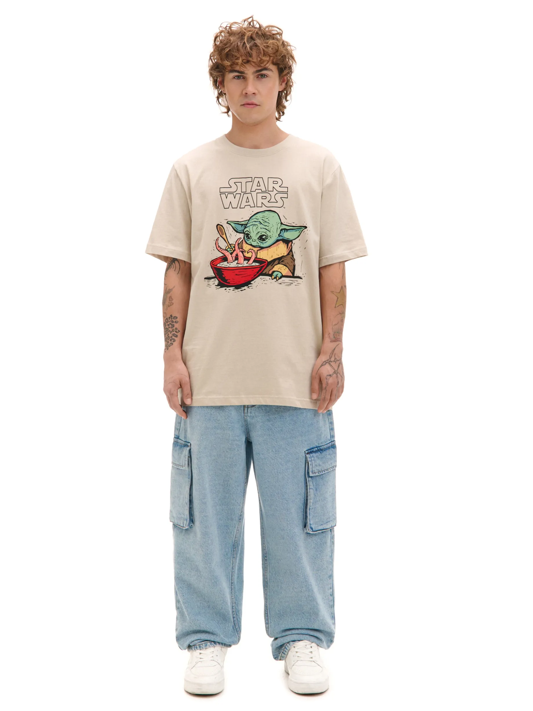 Męski T-shirt z krótkim rękawem w beżowym odcieniu przedstawia jedzącego Grogu. Baby Yoda potrzebuje opieki! Zainteresowanych prosimy o wrzucenie malucha do koszyka. Nasi zaprzyjaźnieni Mandalorianie chętnie przekażą przesyłkę w dobre ręce. 100% bawełny regularny krój okrągły dekolt krótkie, swobodne rękawy z przodu nadruk Star Wars © & TM Lucasfilm Ltd.