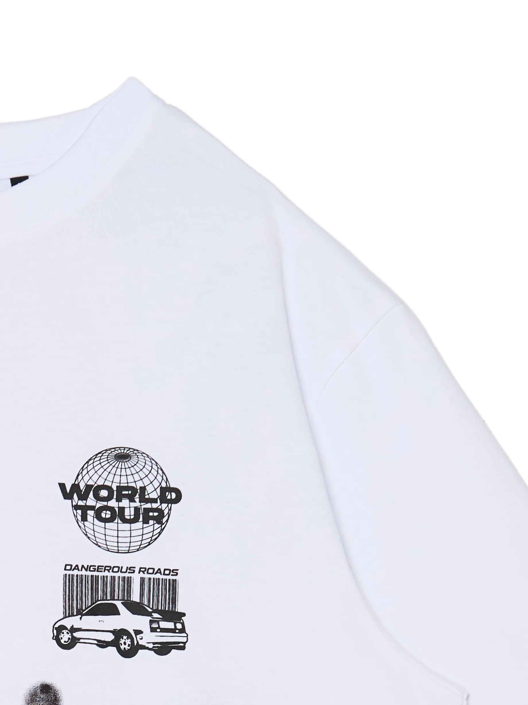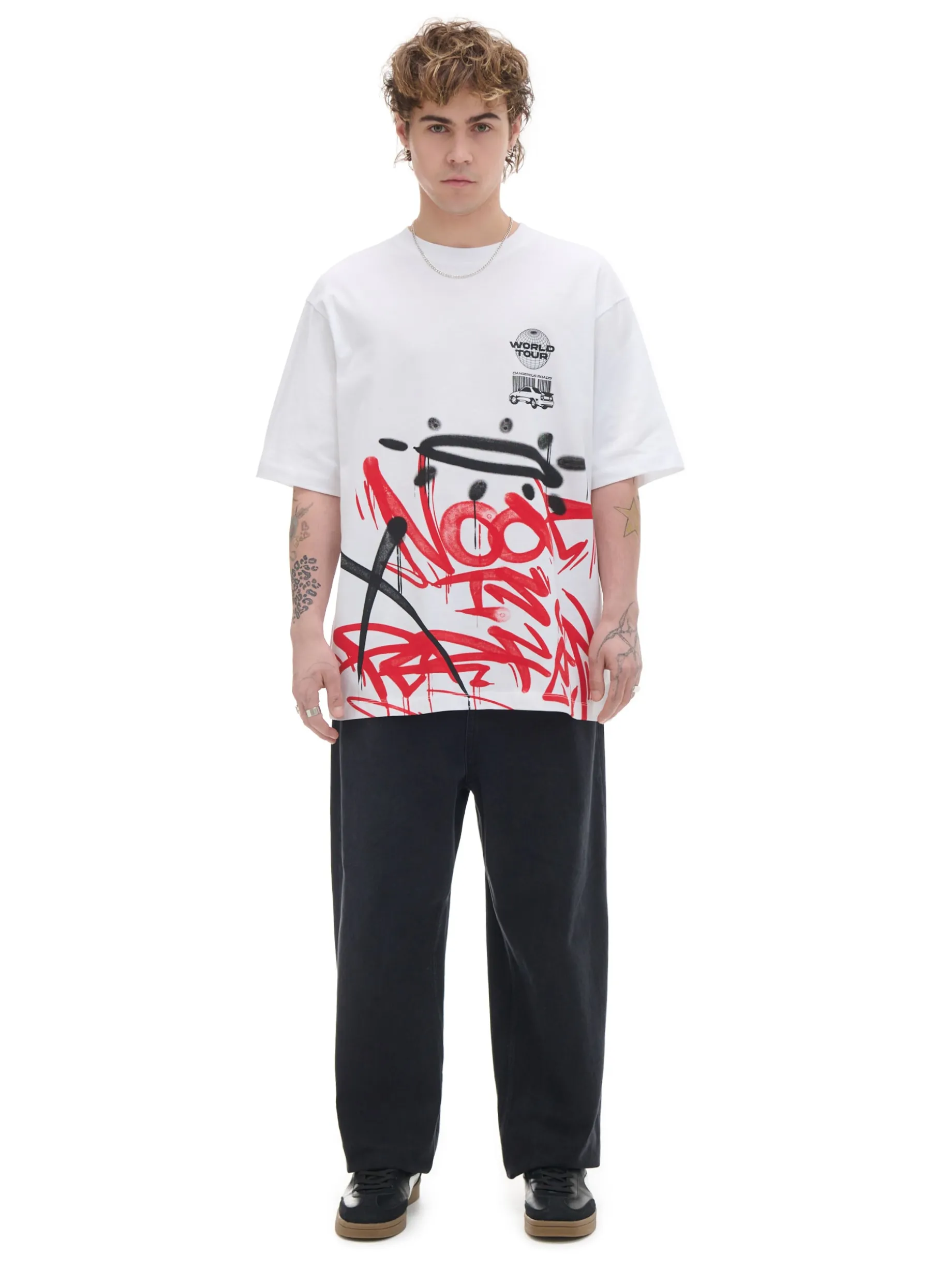 Biały męski t-shirt comfort uszyty w 100% z bawełny. Ozdobę stanowią 2 duże printy z przodu i na plecach w formie graffiti.
