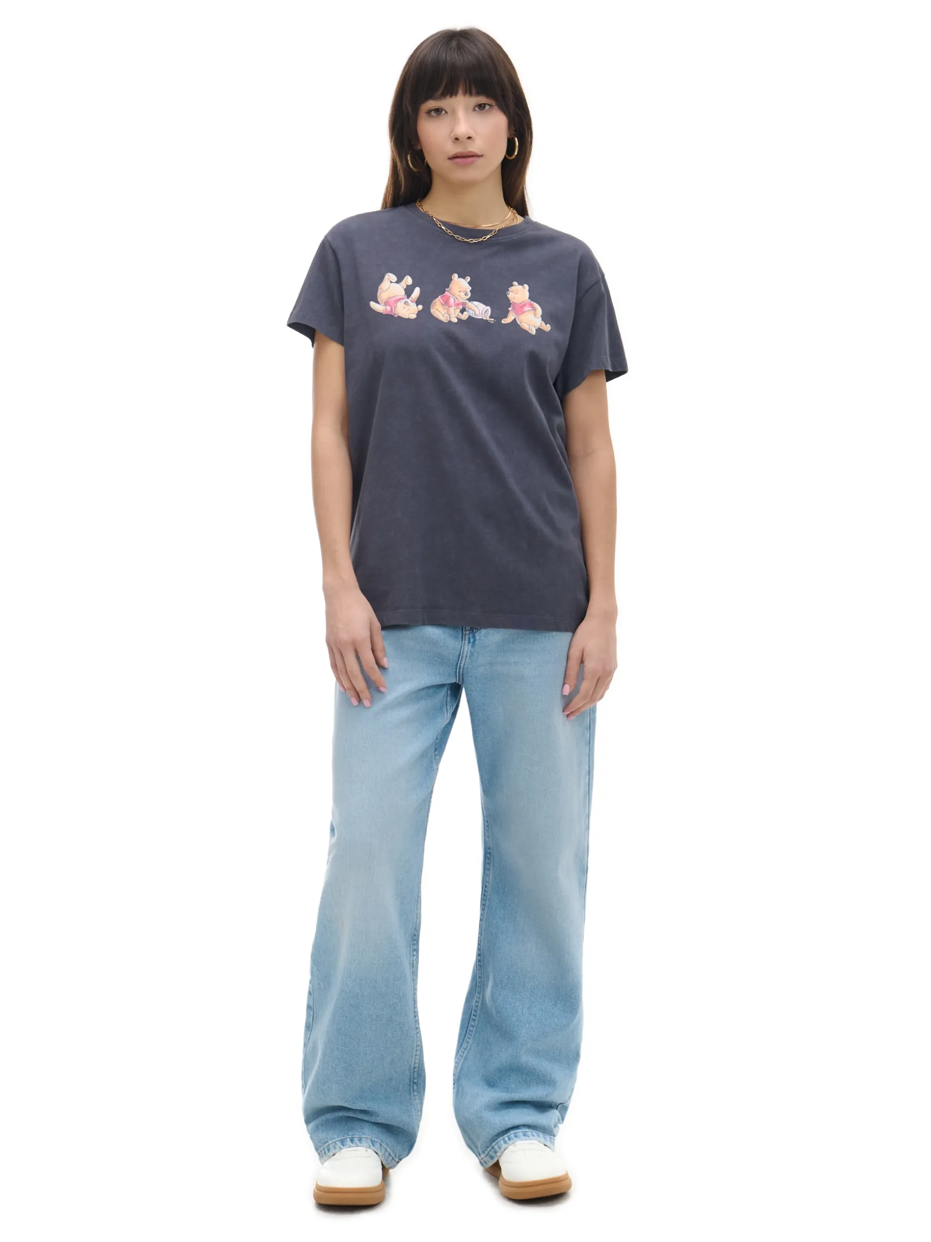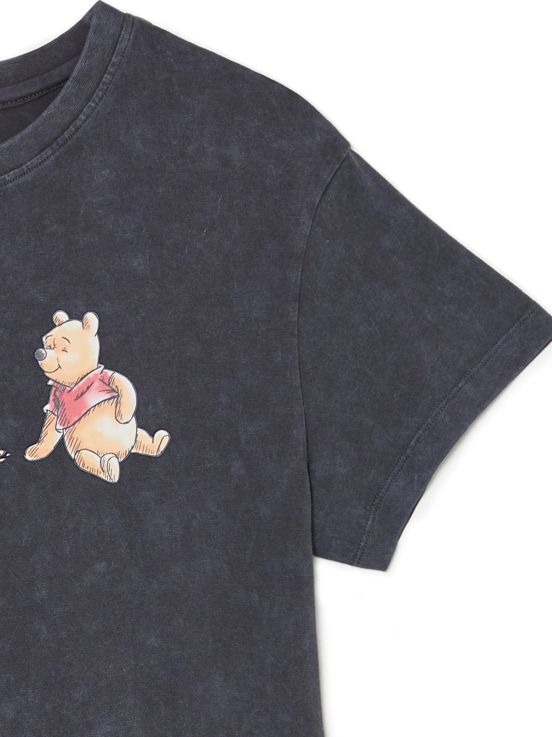 Ciemnoszara koszulka damska o kroju oversize, z obniżoną linią ramion. Uszyta z bawełny. Z przodu nadruk z Kubusiem Puchatkiem, na całości efekt acid wash. ©Disney