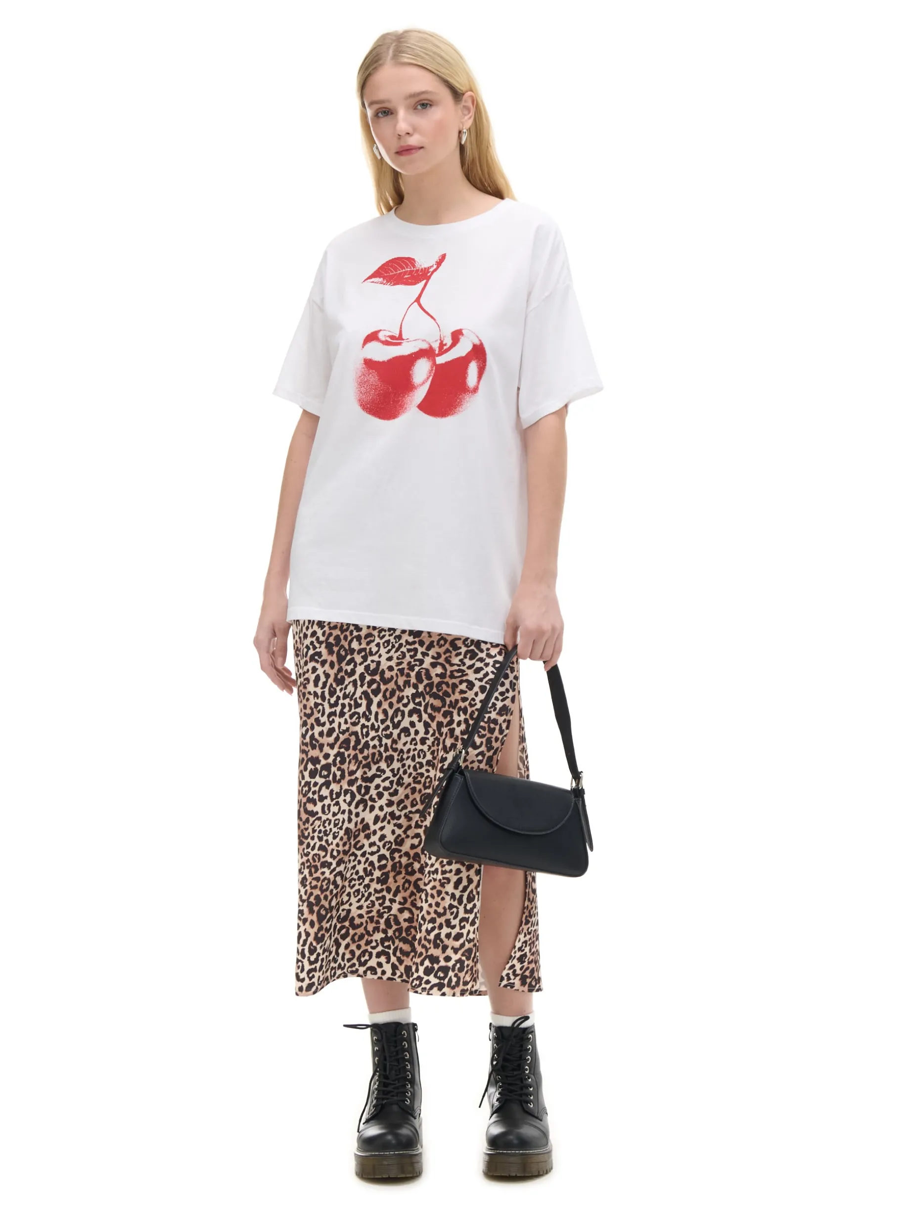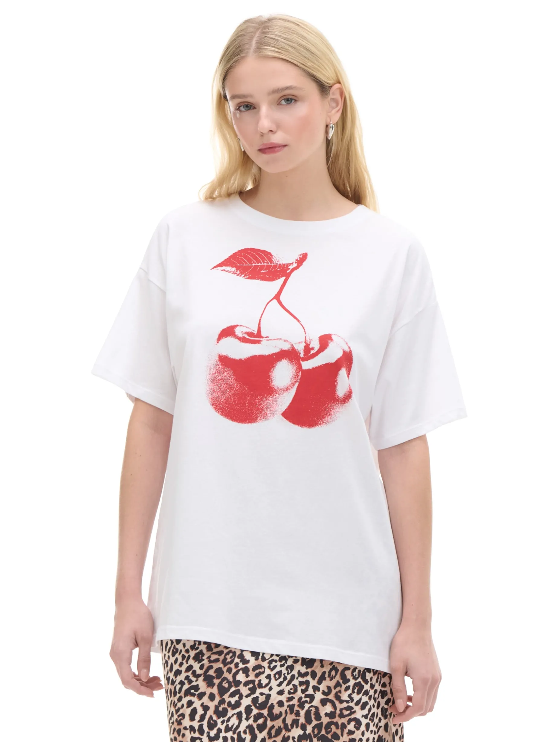 Damska koszulka z krótkim rękawem, uszyta z bawełnianej dzianiny. Na przodzie duży nadruk z owocowym motywem. 100% bawełny krój oversize krótkie, swobodne rękawy oryginalny print