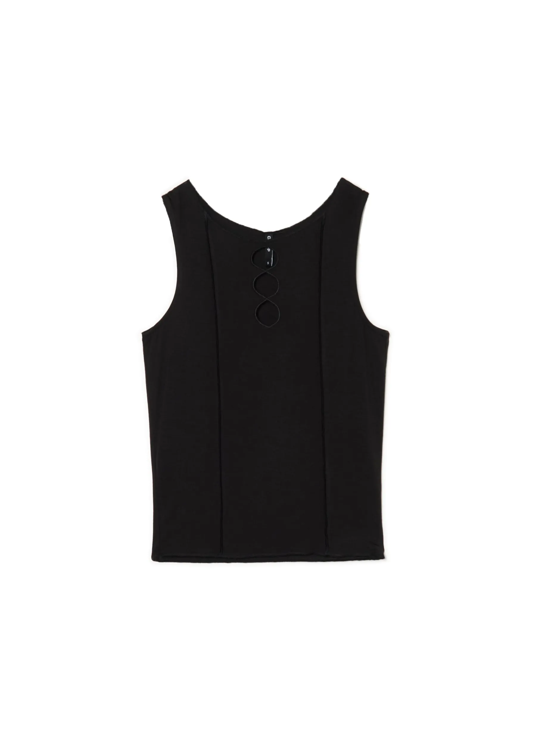 Czarna damska koszulka uszyta z lekkiej, wiskozowej dzianiny z dodatkiem elastycznych włókien. Na przodzie dekoracyjne wycięcia i ozdobne przeszycia. wiskoza z domieszką elastycznych włókien dopasowany krój podkreślający sylwetkę szersze ramiączka ozdobny zewnętrzny szew z przodu ozdobne rozcięcia Wzrost modelki: 172 cm