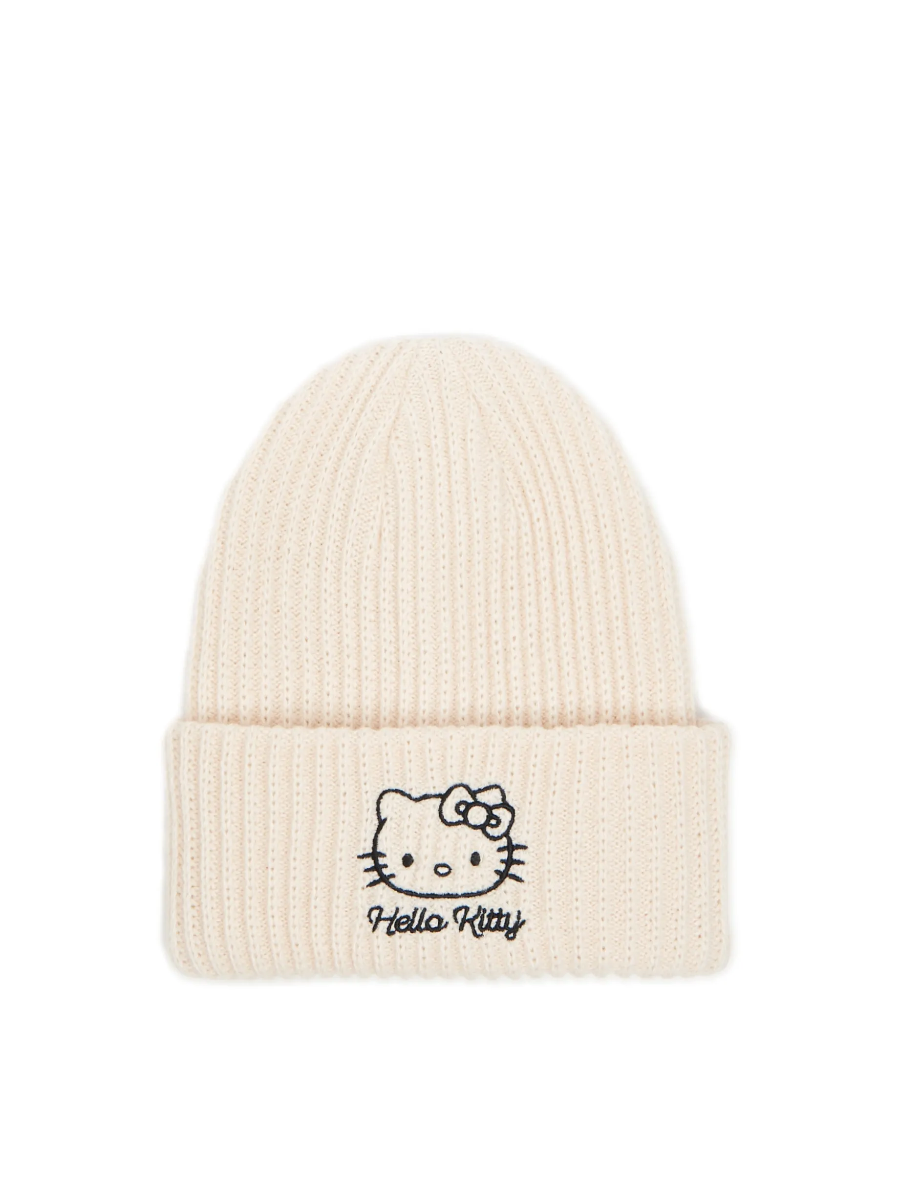 Damska zimowa czapka beanie, uszyta z kremowej dzianiny o prążkowanej fakturze. Z przodu haft z motywem słodkiej Hello Kitty. ©2013, 2023 SANRIO CO., LTD.