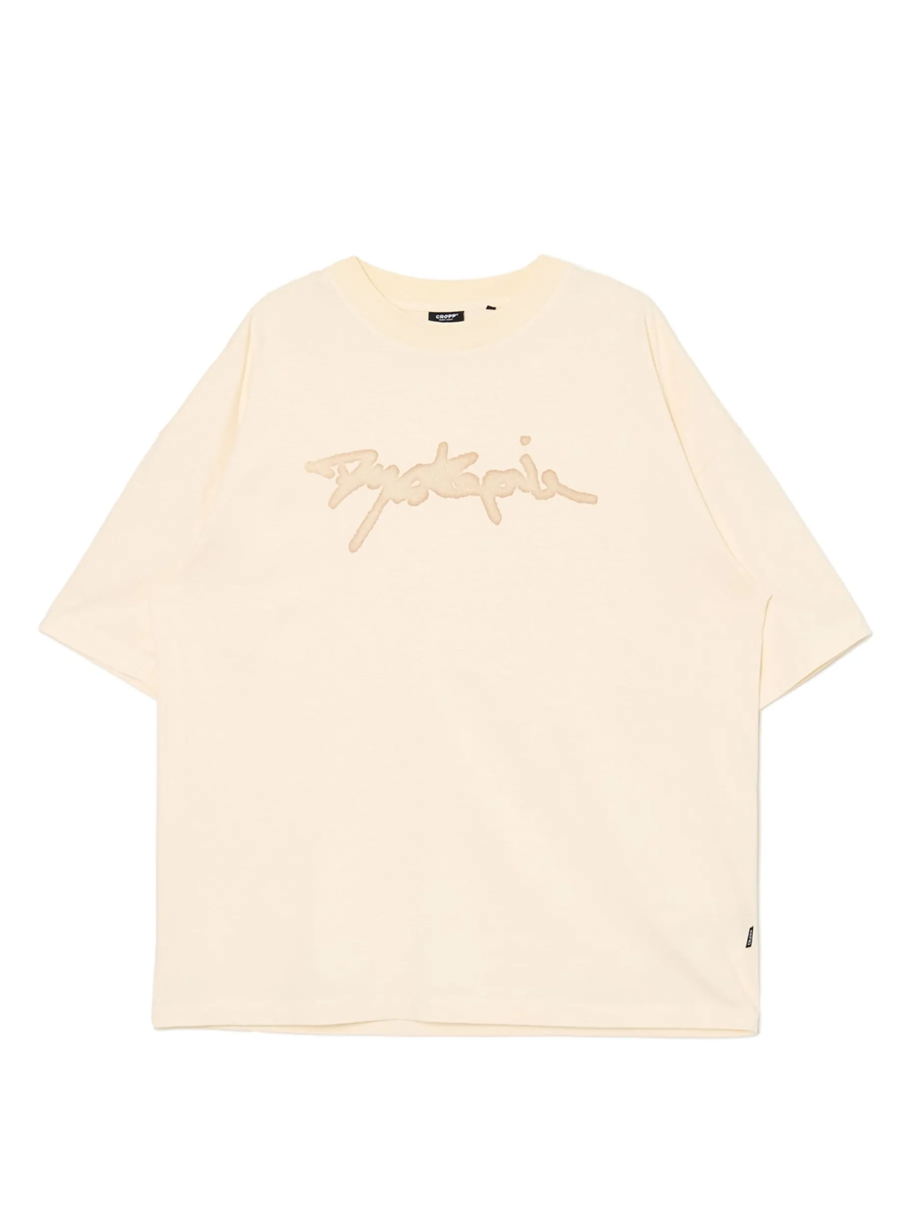 Męska koszulka w kroju boxy, uszyta z bawełny w kolorze kremowym z nadrukiem tekstowym. Fituje z każdym rodzajem spodni! 100% bawełny obszerny krój boxy krótkie, szerokie rękawy obniżona linia ramion napis z przodu efekt sprania na całości Wzrost modela: 185 cm