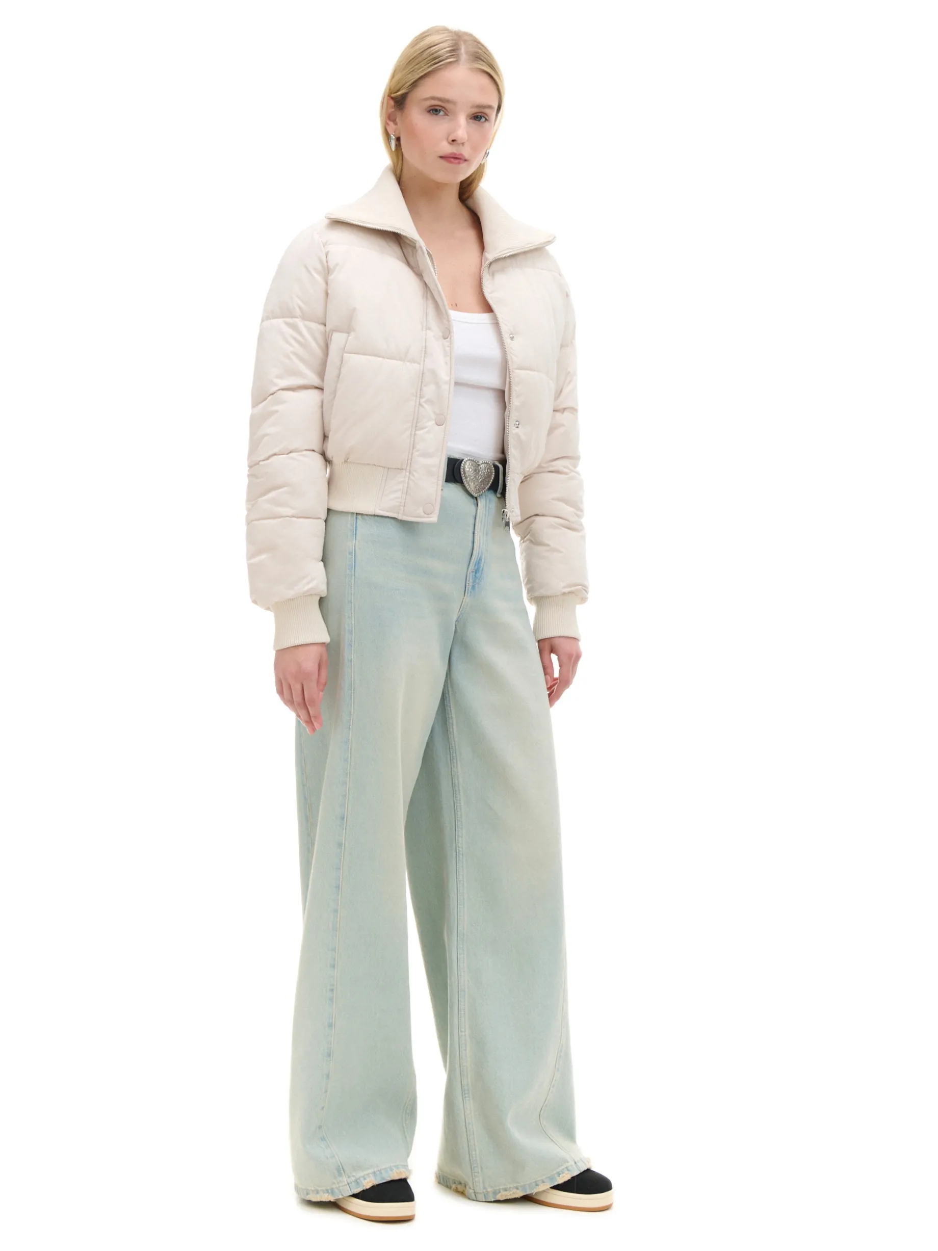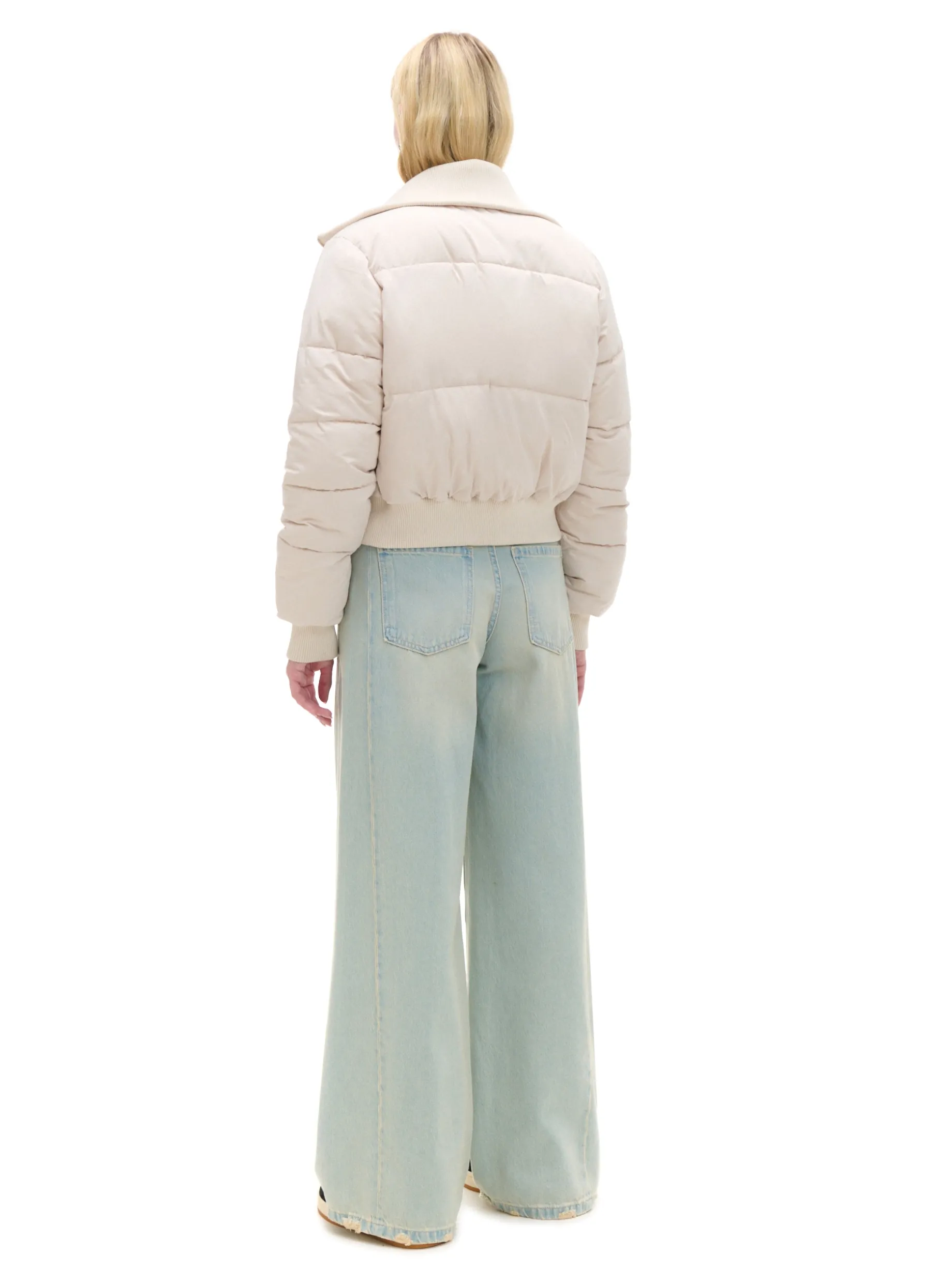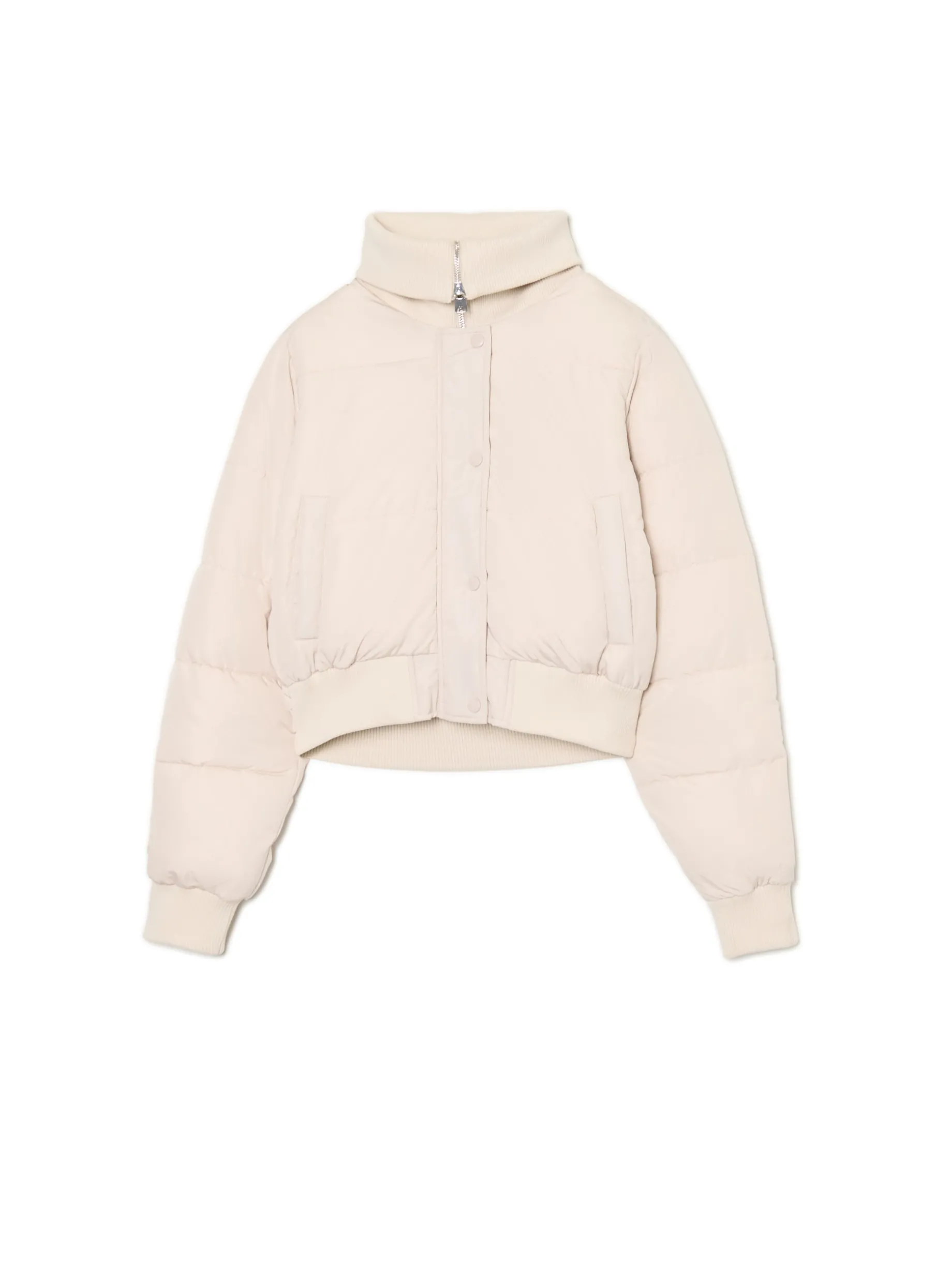 Kurtka damska o regularnym kroju, uszyta z tkaniny w jasnym odcieniu. Praktyczny basic na jesienne, chłodne wieczory. basicowa kurtka typu bomber wewnątrz wykończenie na podszewce lekkie ocieplenie regularny krój zapięcie na zamek i zatrzaski ukryte pod plisą wysoka stójka wykończona ściągaczem dół i rękawy wykończone prążkowanym ściągaczem dwie kieszenie boczne