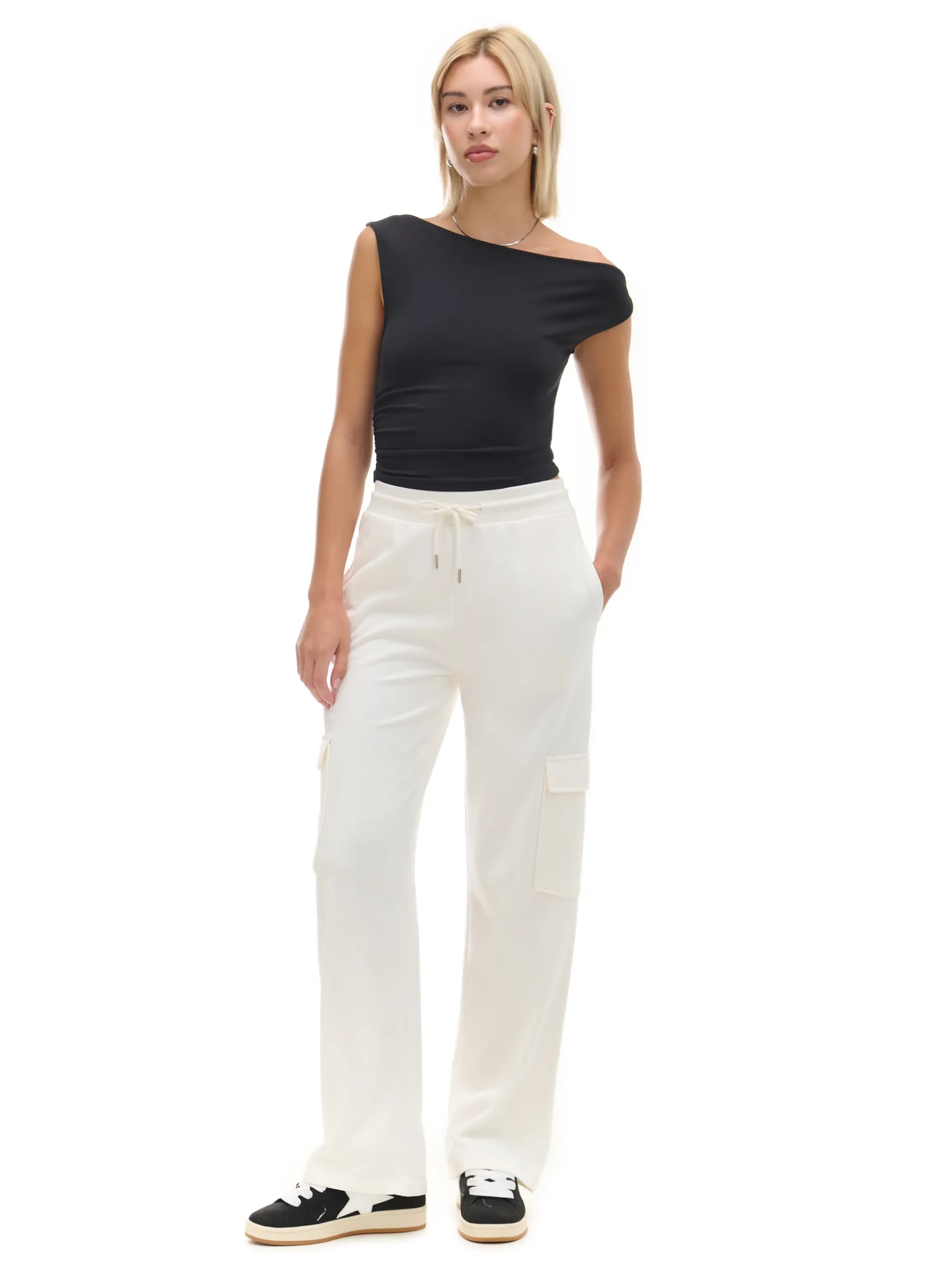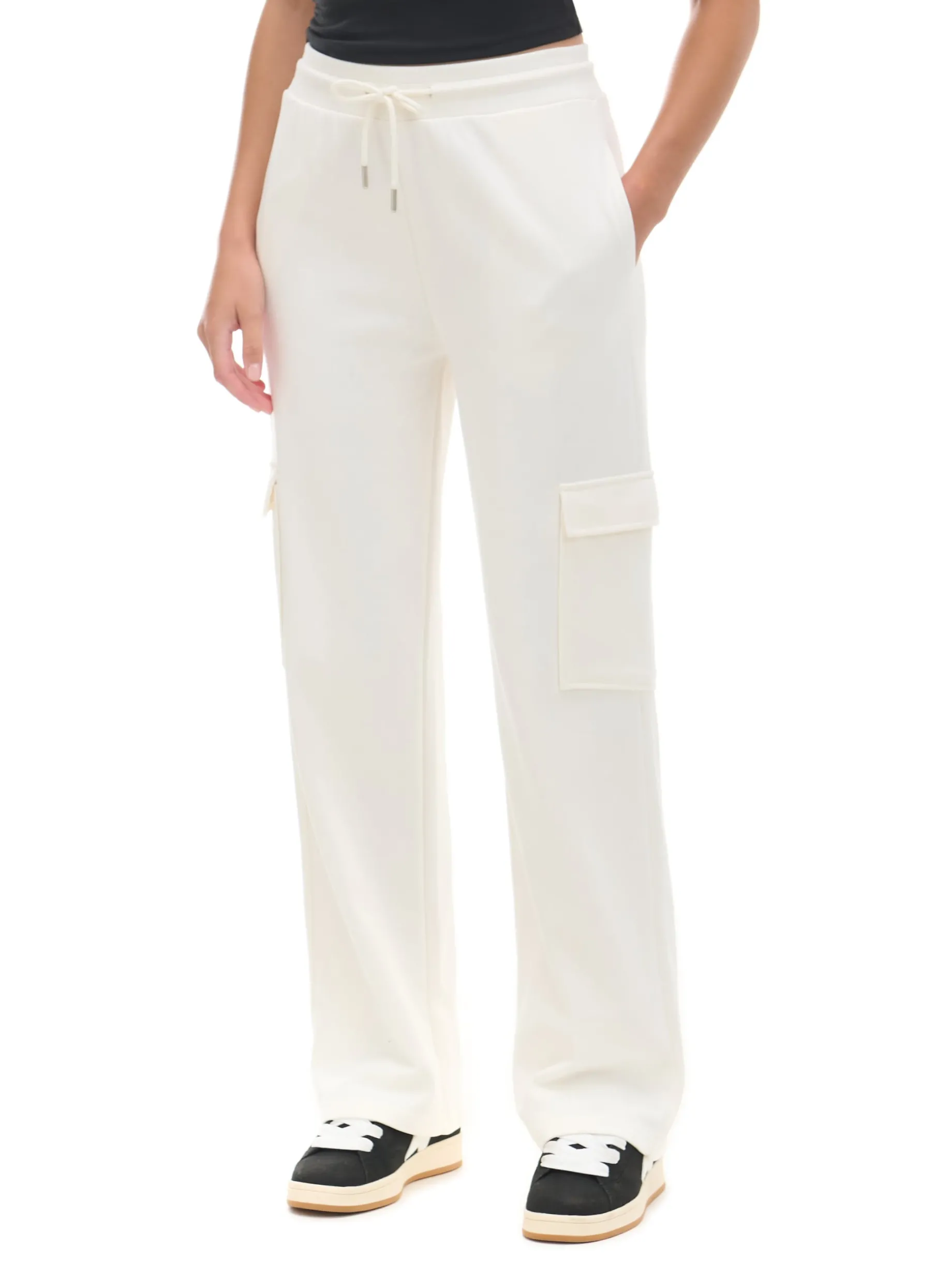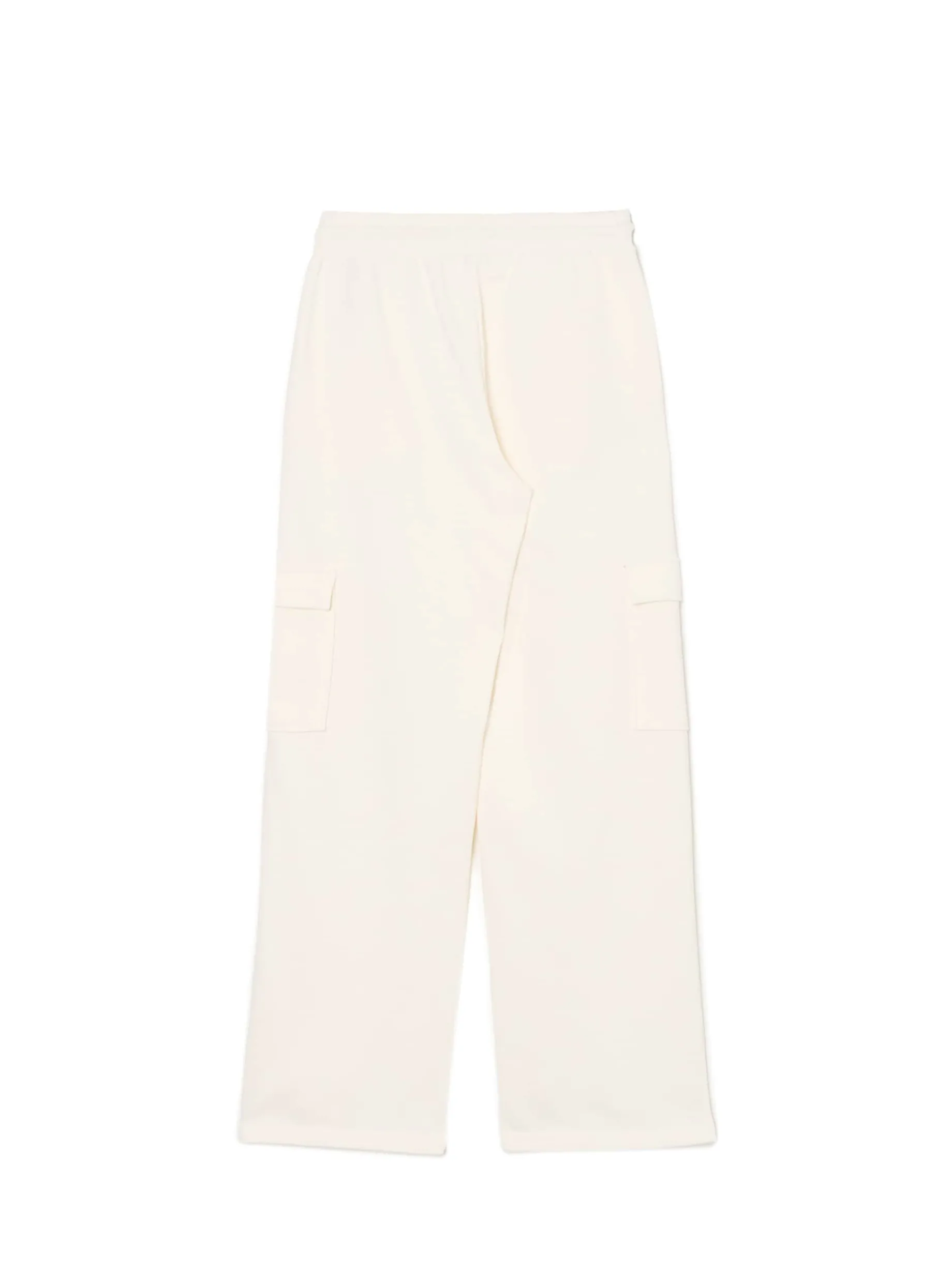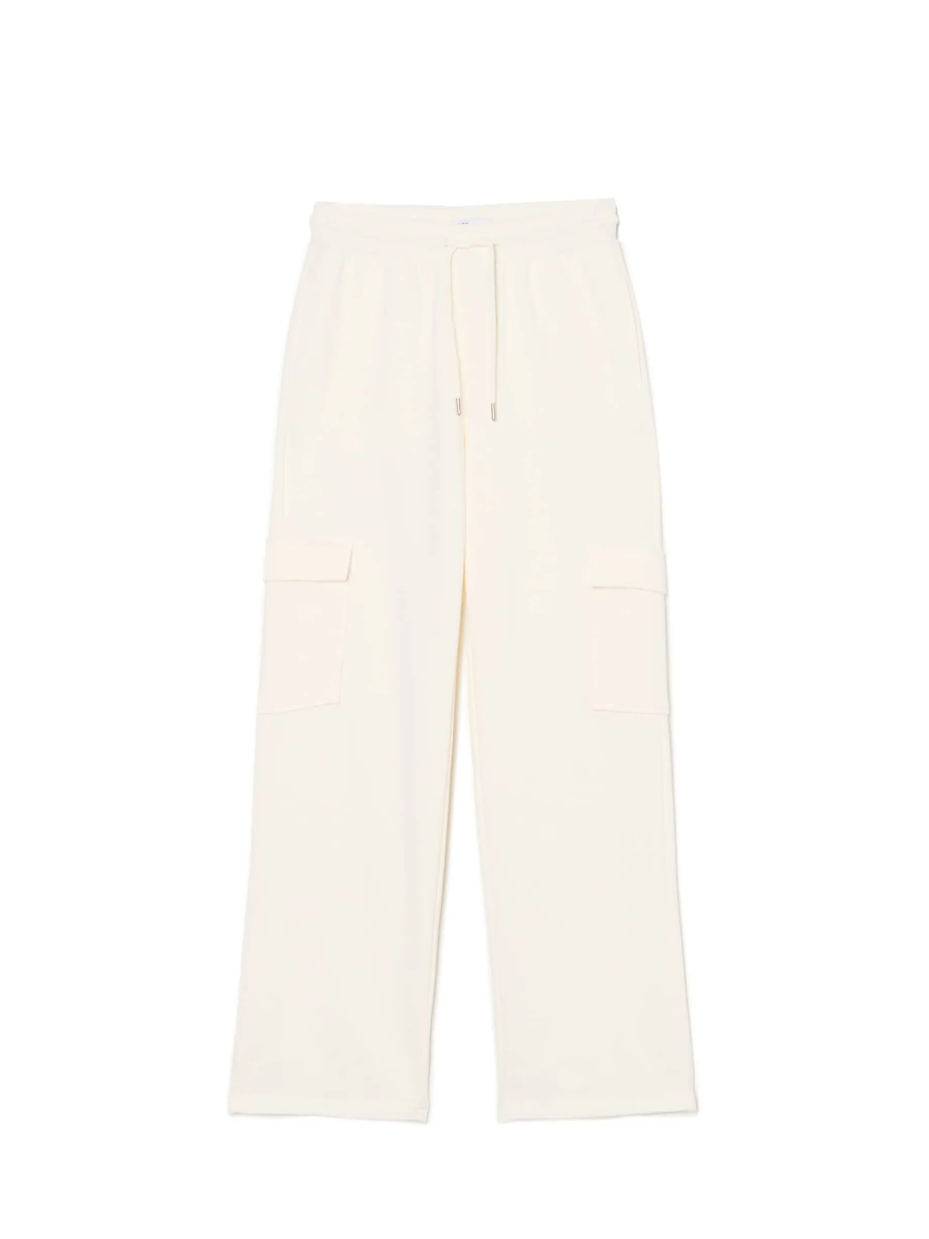 Damskie spodnie dresowe w jasnym kolorze, uszyte z dzianiny o dużej zawartości bawełny. dzianinowy materiał z bawełną prosty krój guma w pasie ze sznurkiem do regulacji długie, proste nogawki otwarte kieszenie z przodu dwie duże naszywane kieszenie okryte patkami Wzrost modelki: 177 cm